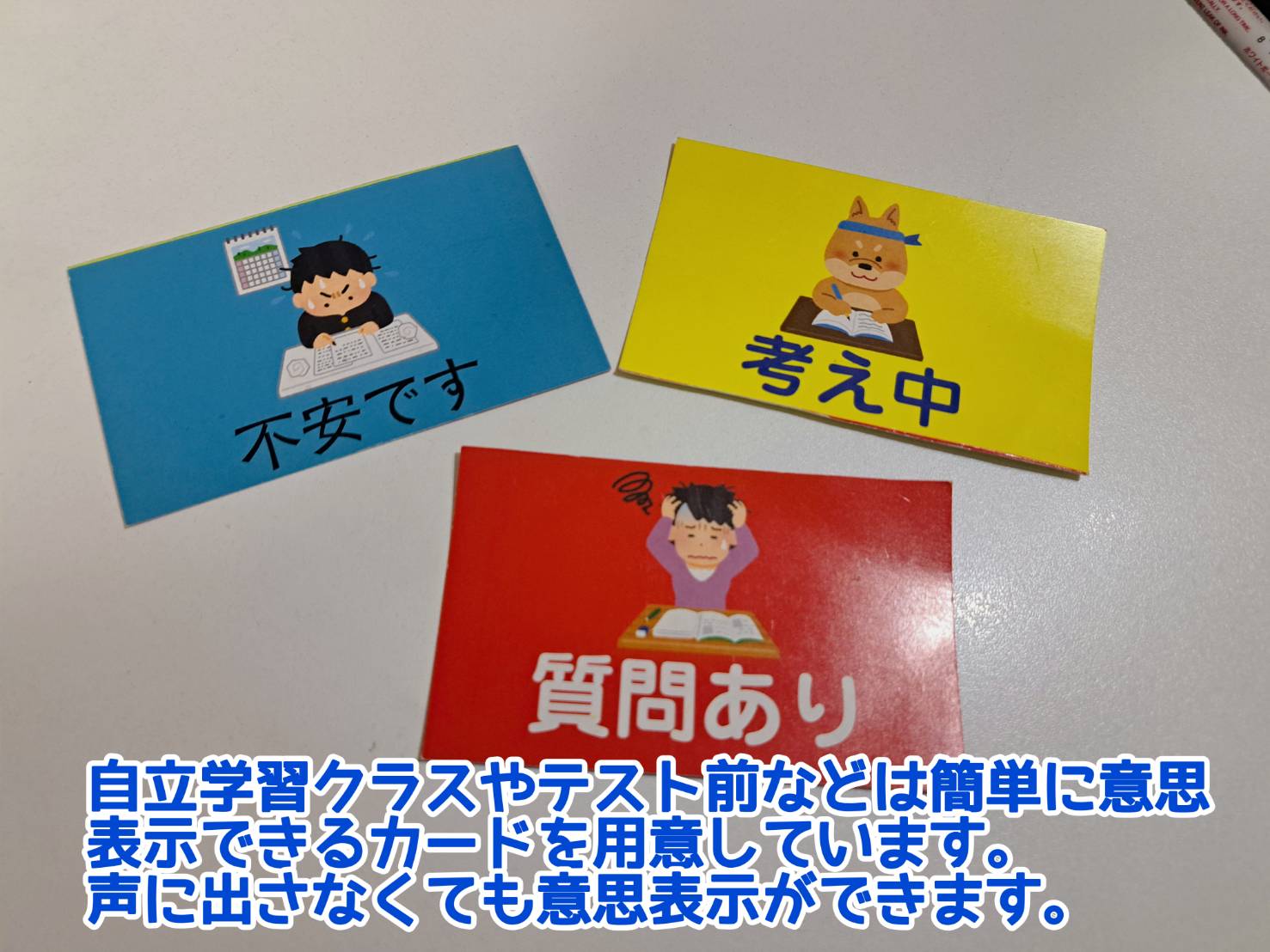 自立学習クラスや定期テスト対策期間には、各机にカードを置きますので、質問がある場合は声に出さずに意思表示ができます。
