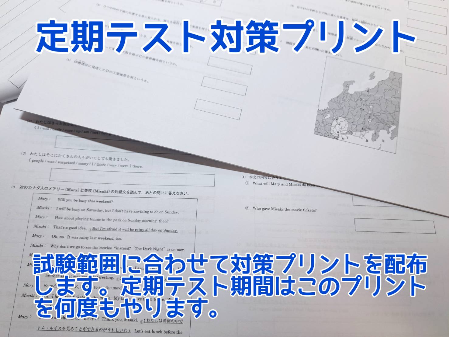 授業で取っている教科(WT含む)+1教科まで範囲に沿った対策プリントをお渡しすることが可能ですが、生徒さんの理解度・進捗具合で変わってきます。(例えば1教科も範囲まで終わっていないような場合は配布を制限させていただきます。)部分的な質問などはどの教科でも可能です。