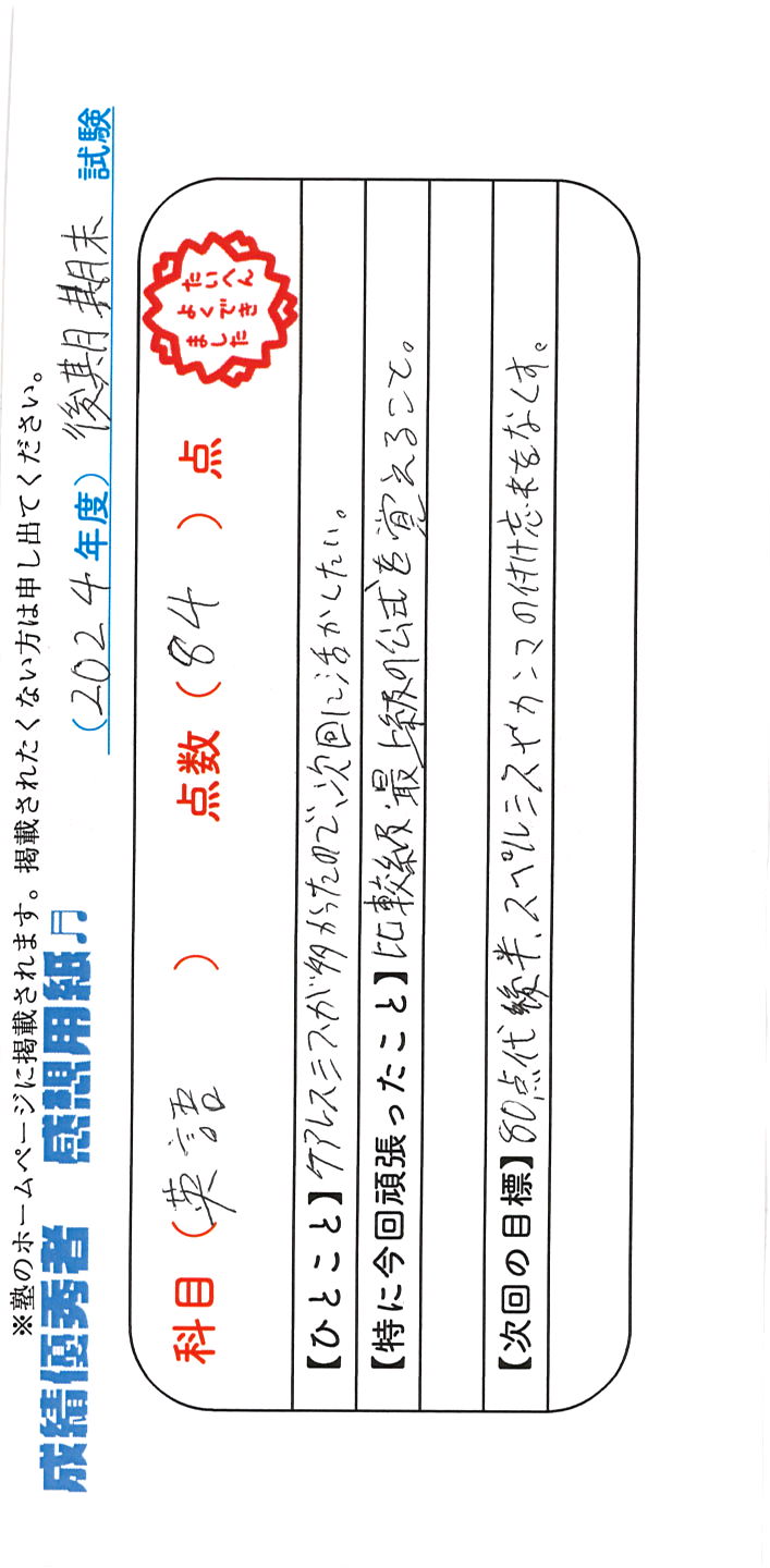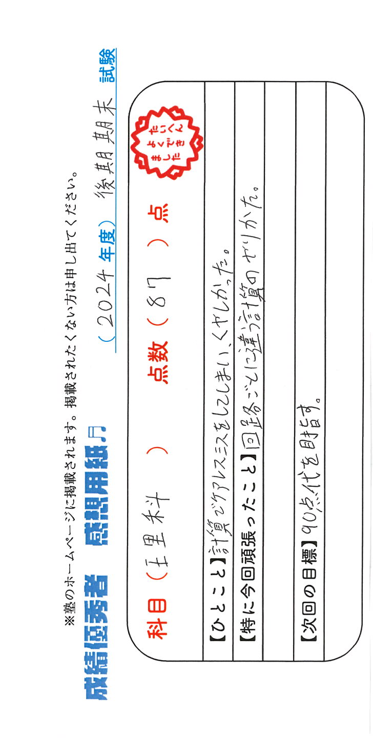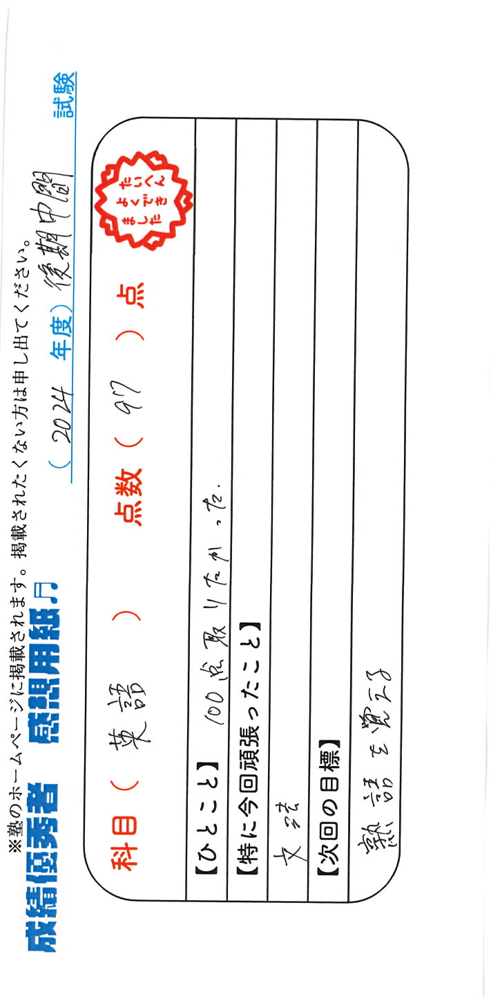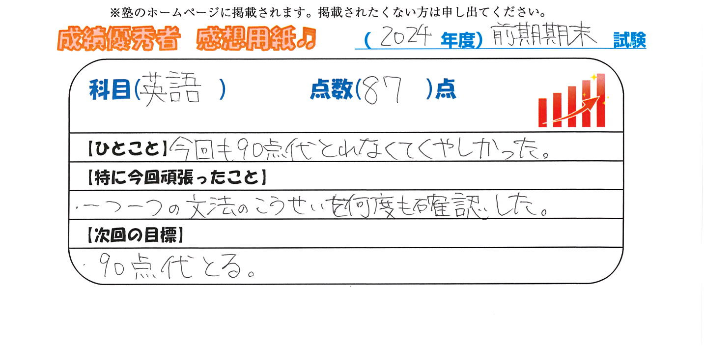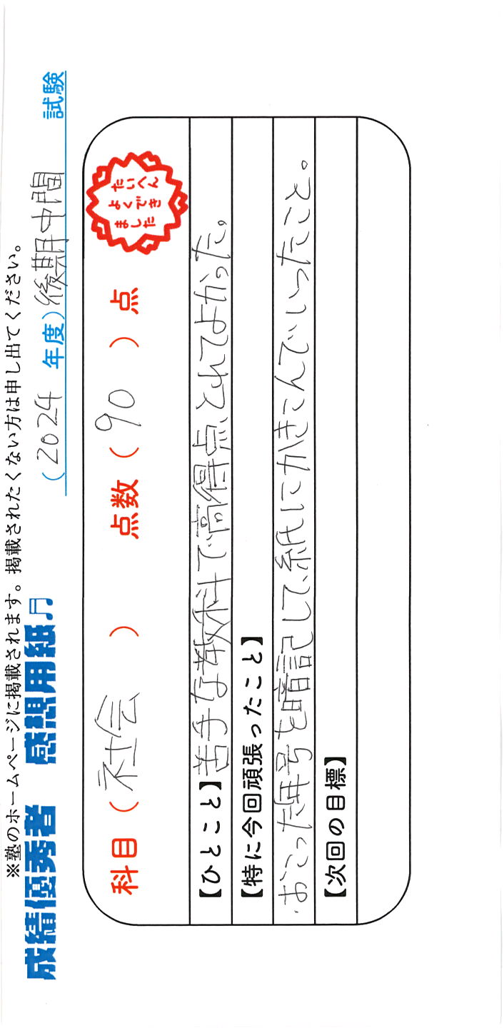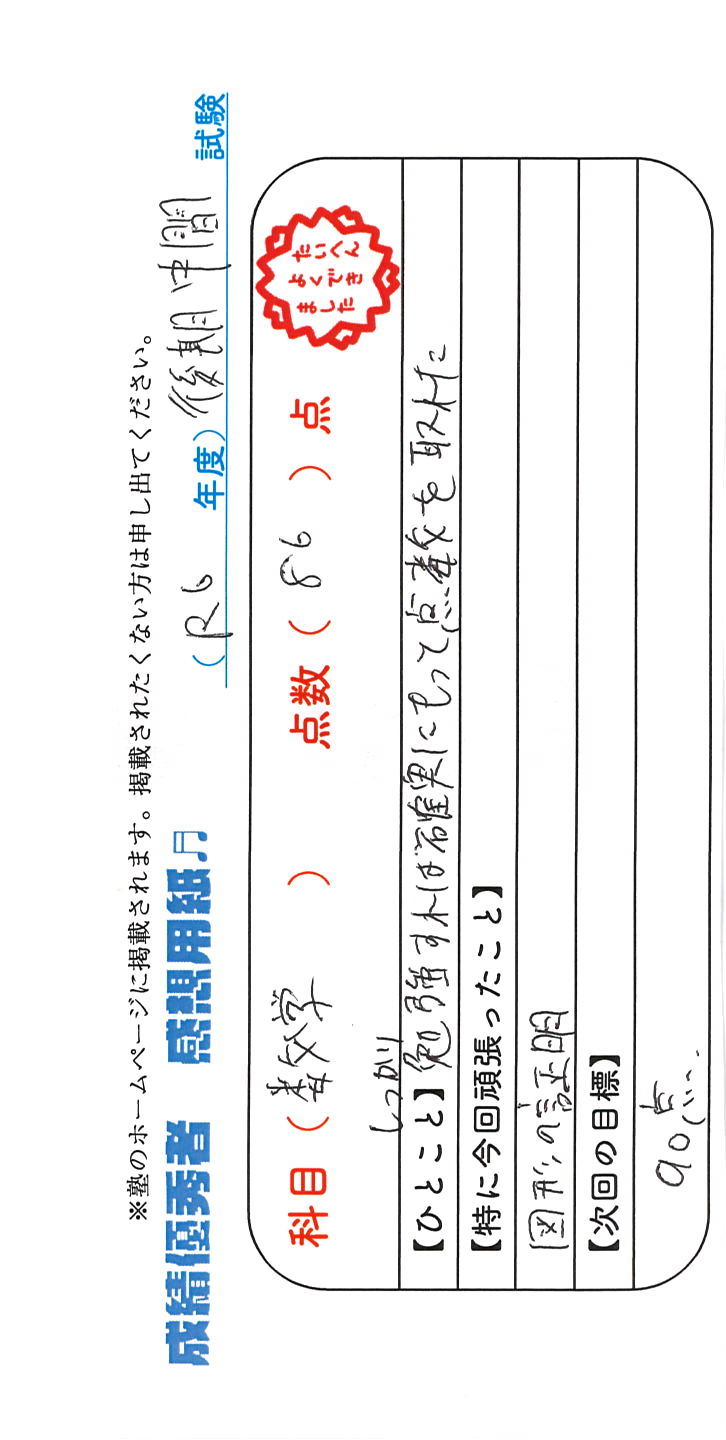 定期試験で優秀な成績を取った生徒さんのメッセージです。