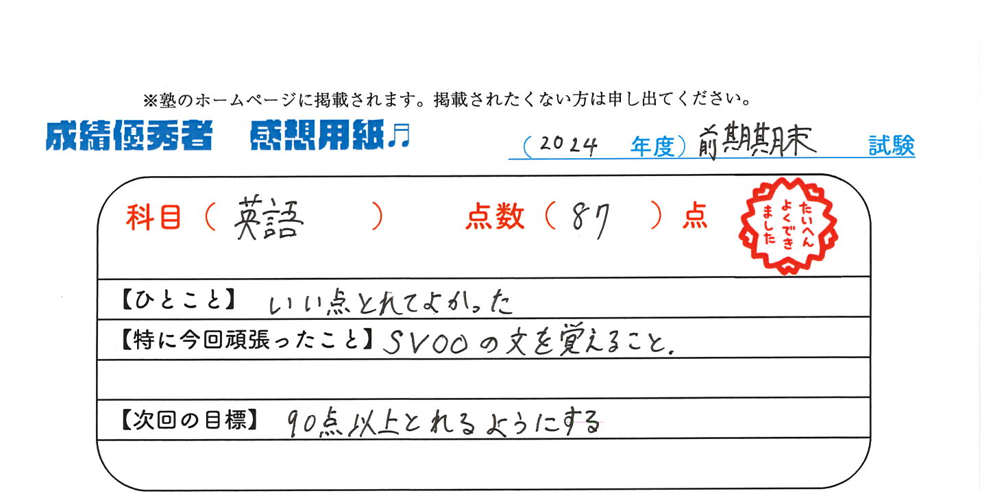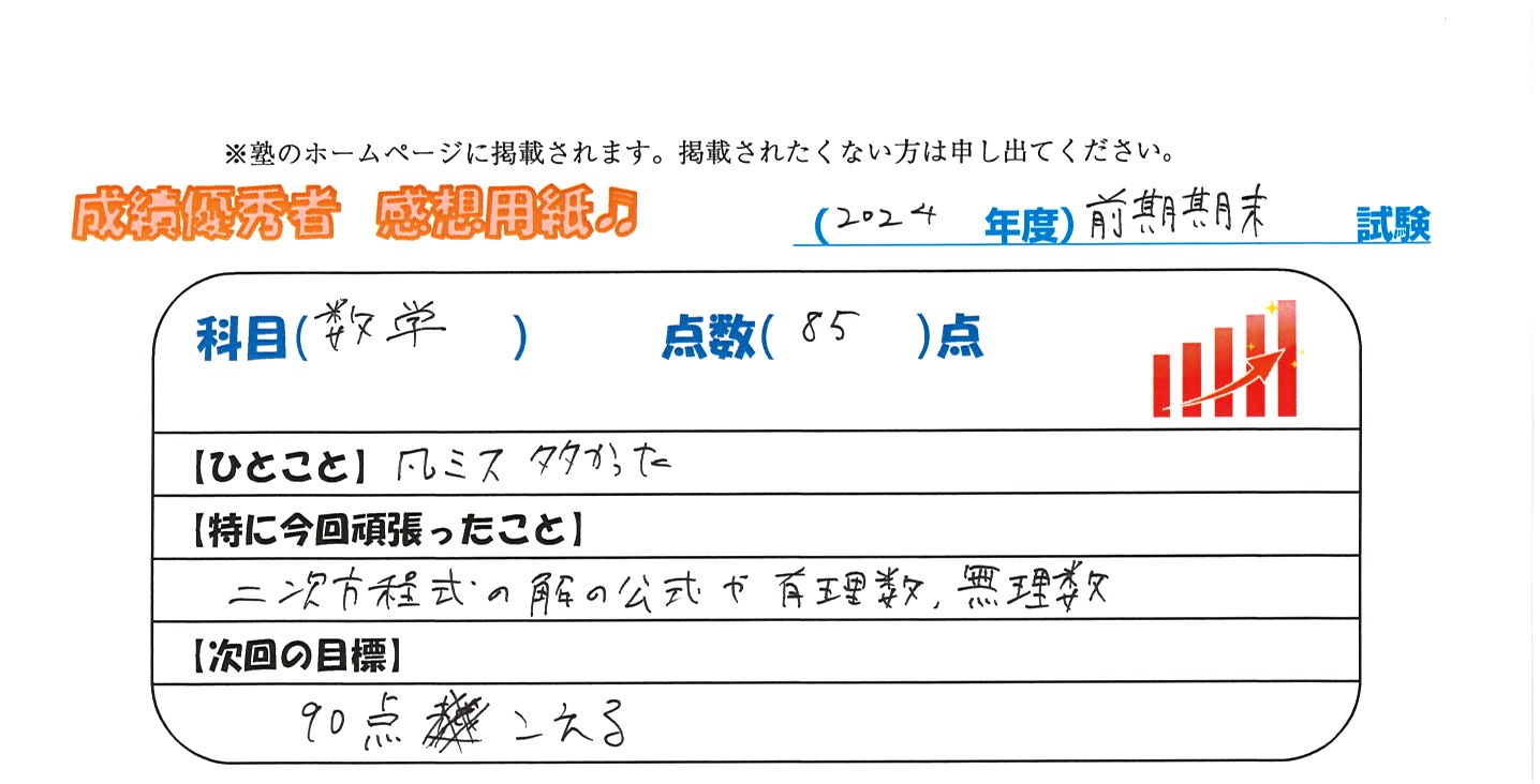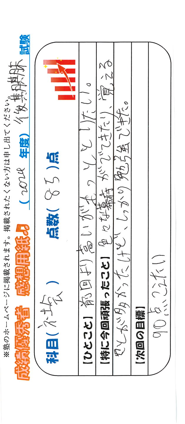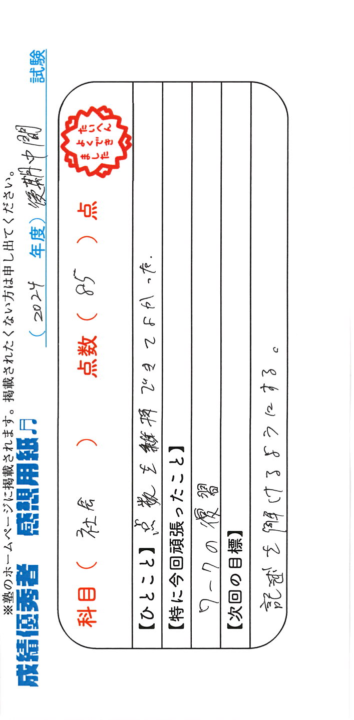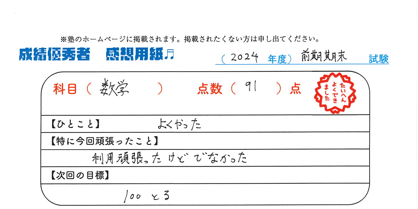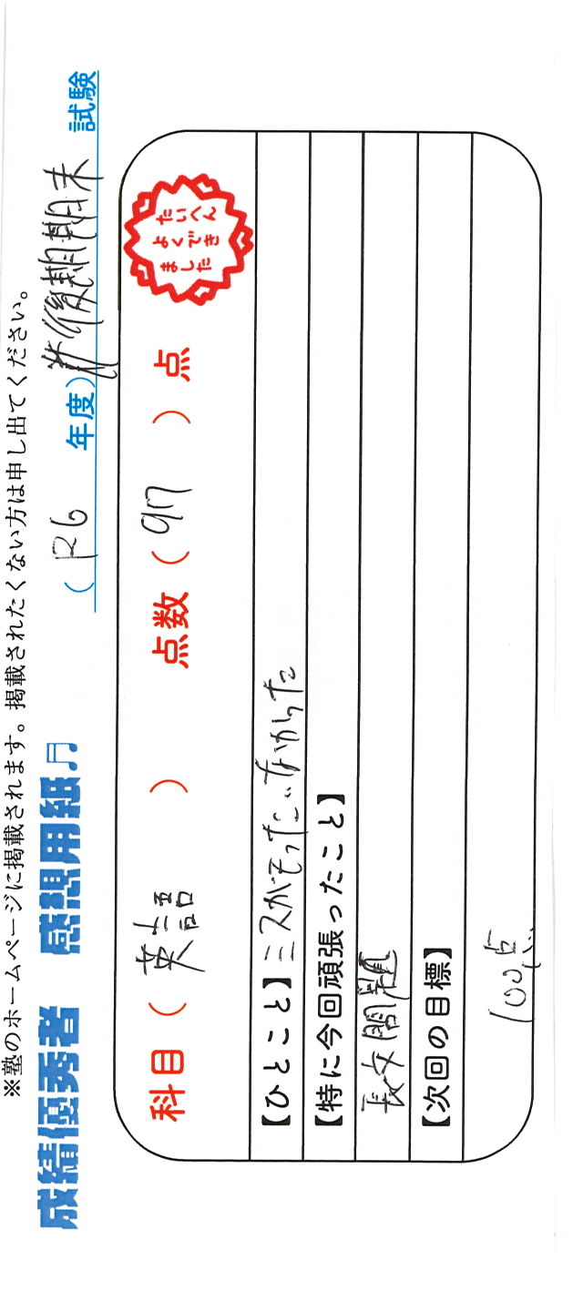 定期試験で優秀な成績を取った生徒さんのメッセージです。