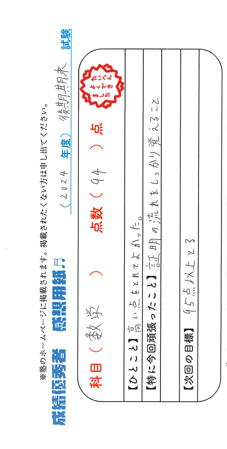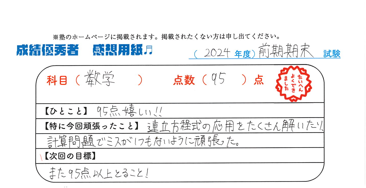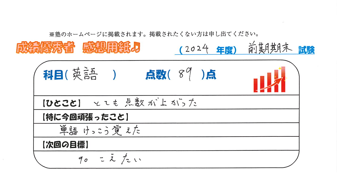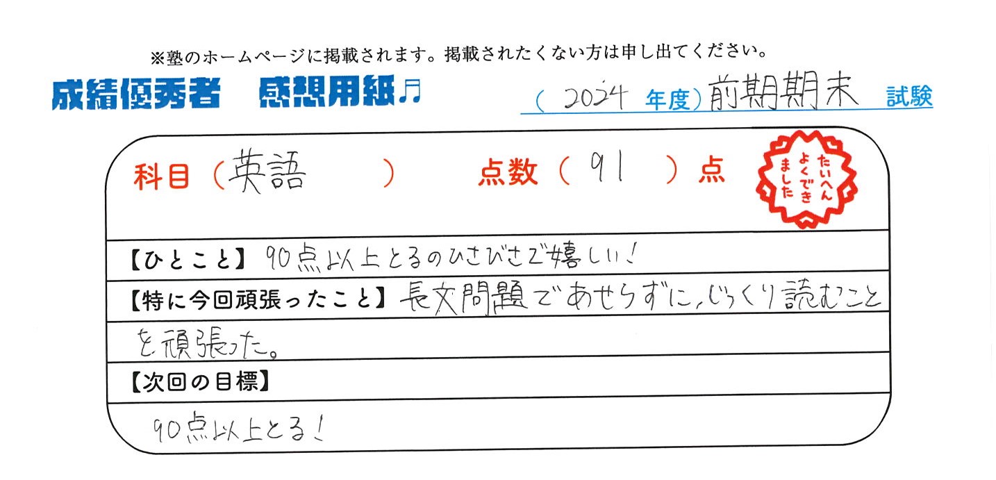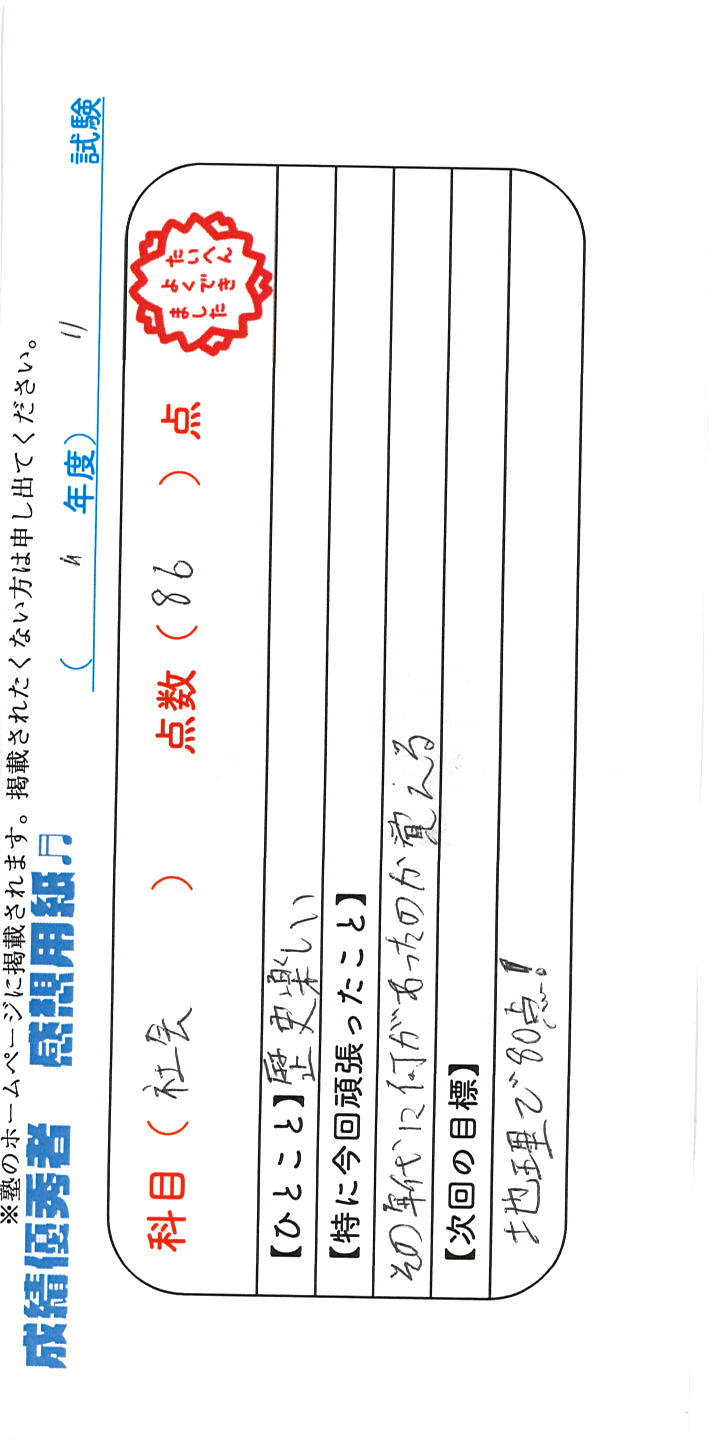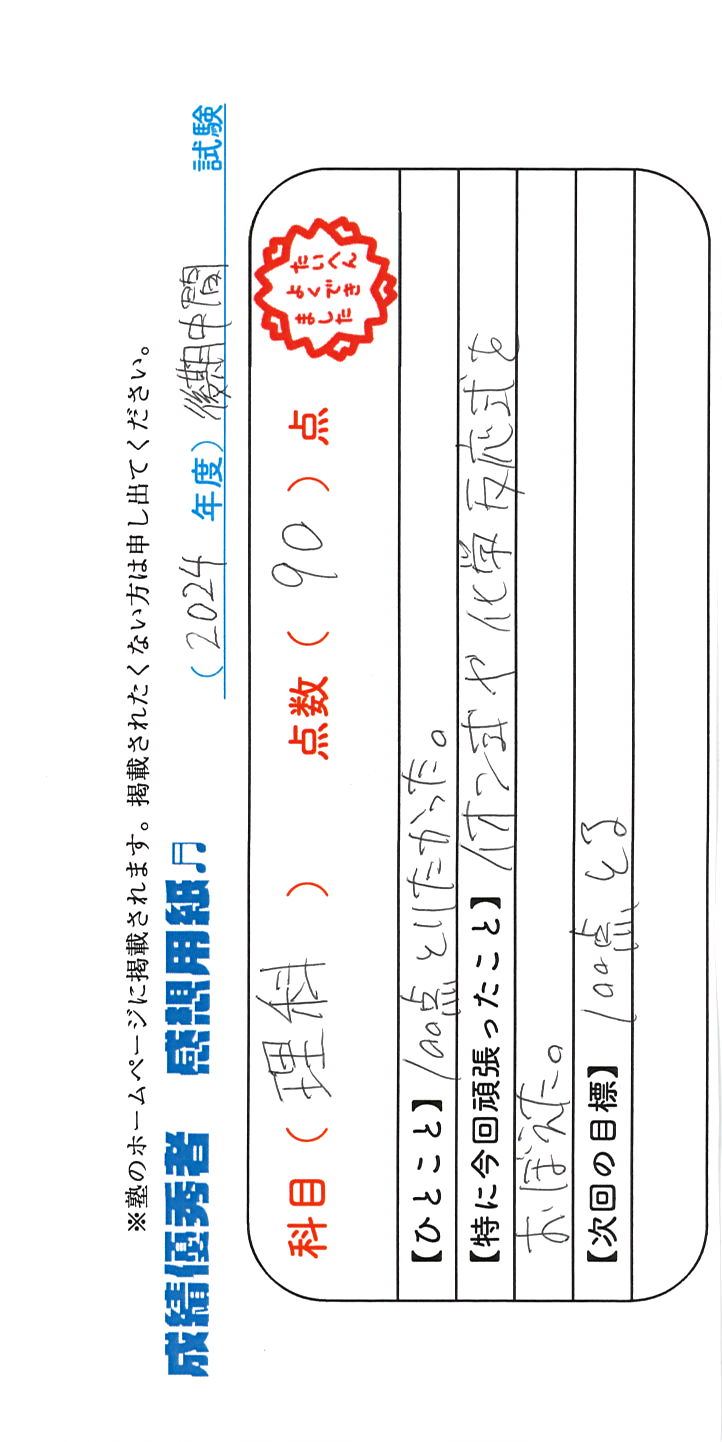 定期試験で優秀な成績を取った生徒さんのメッセージです。