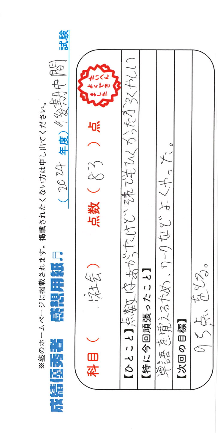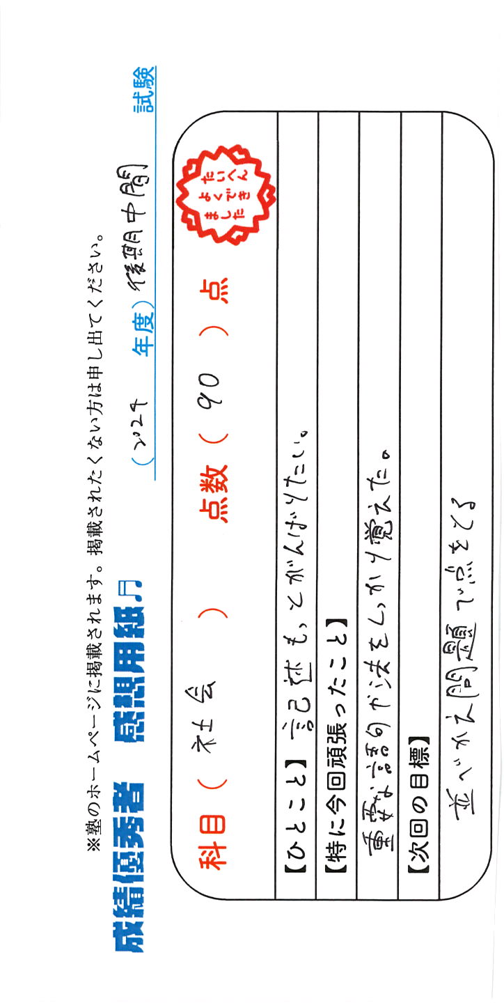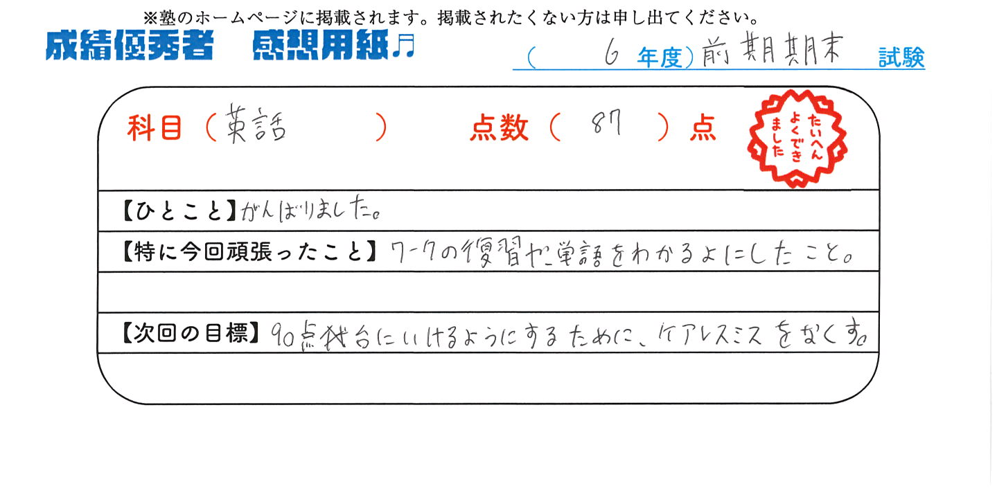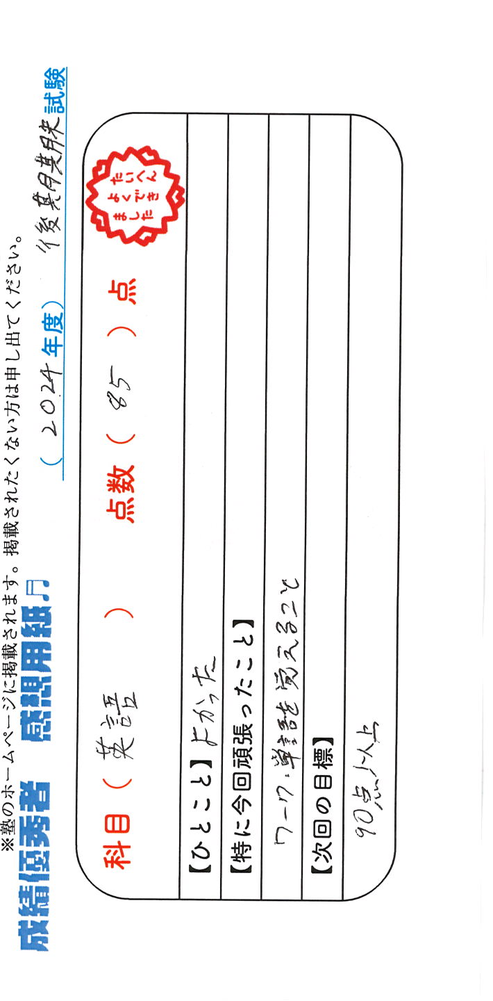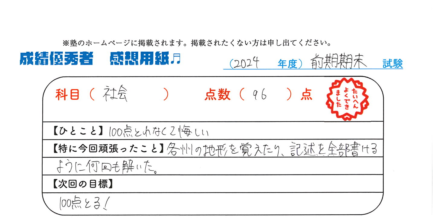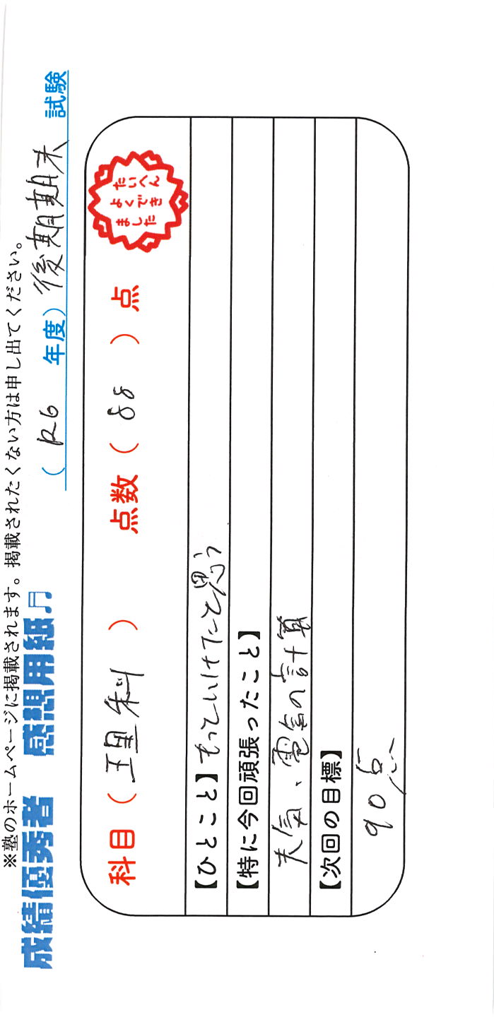 定期試験で優秀な成績を取った生徒さんのメッセージです。