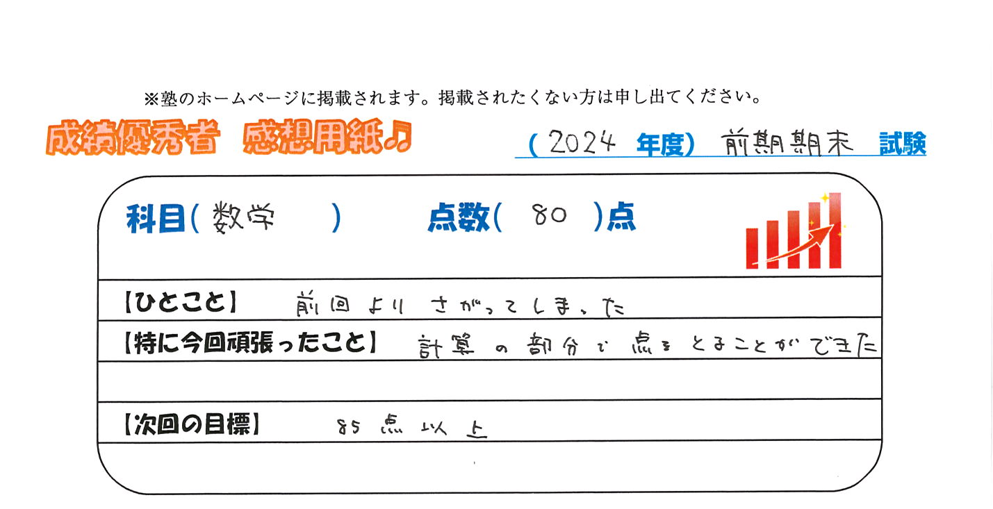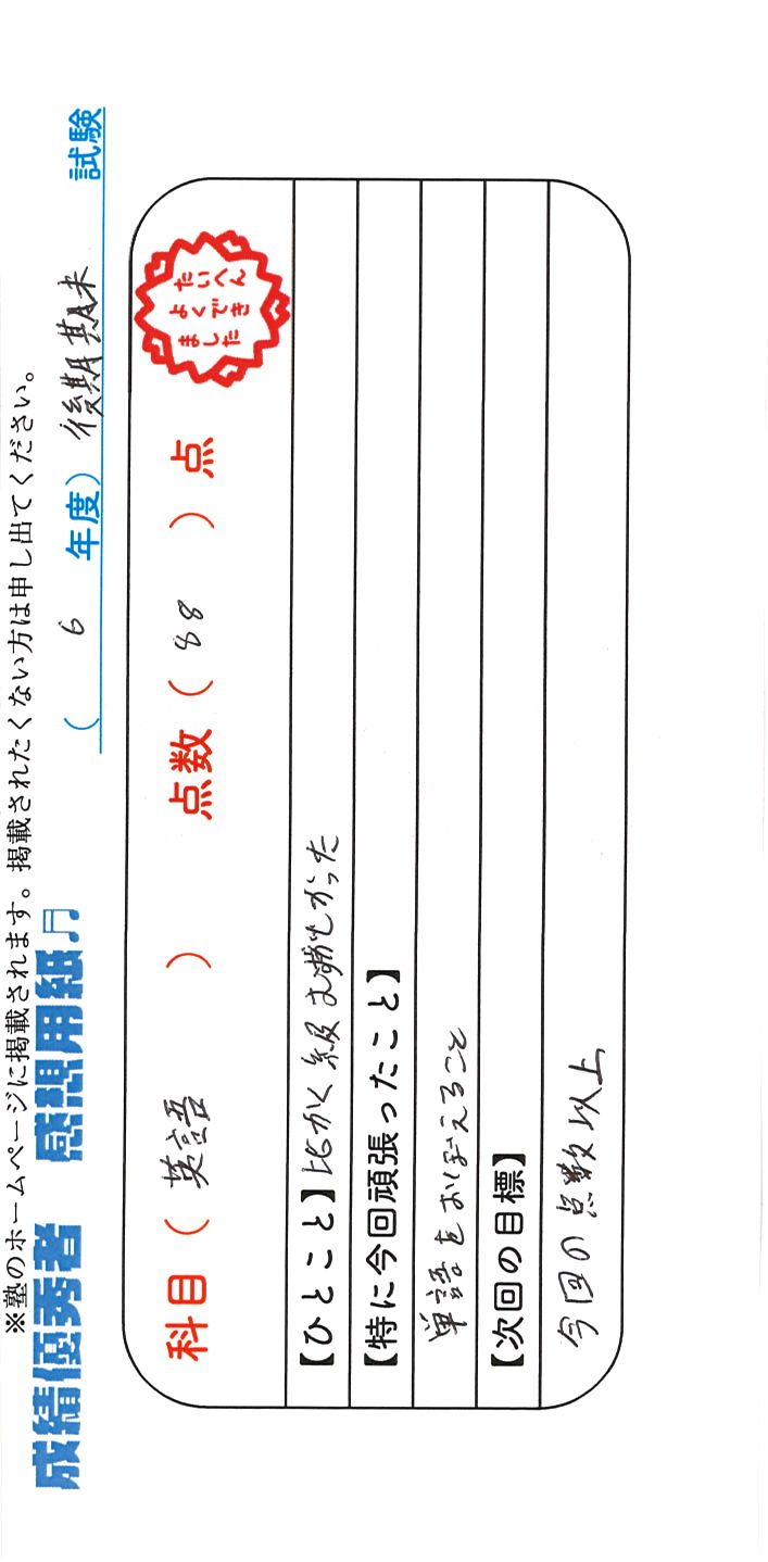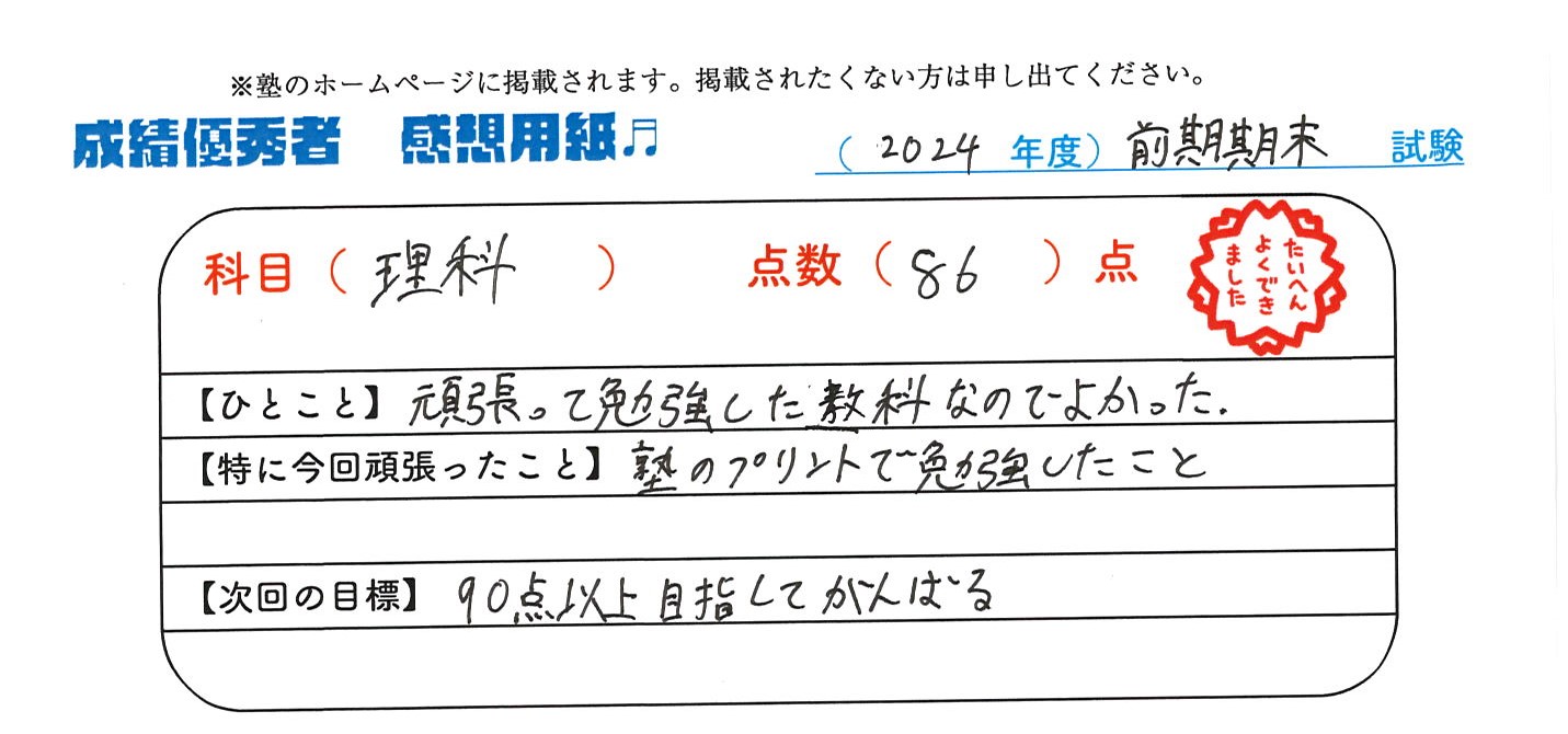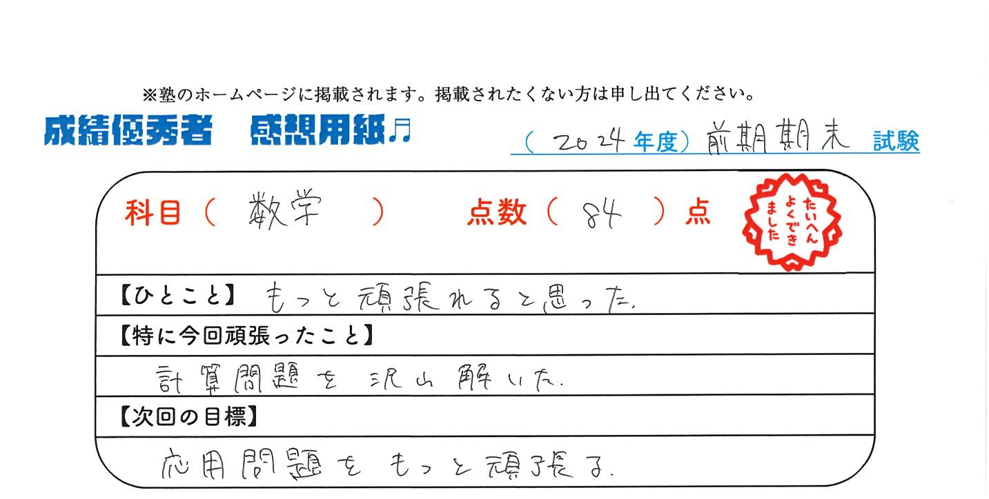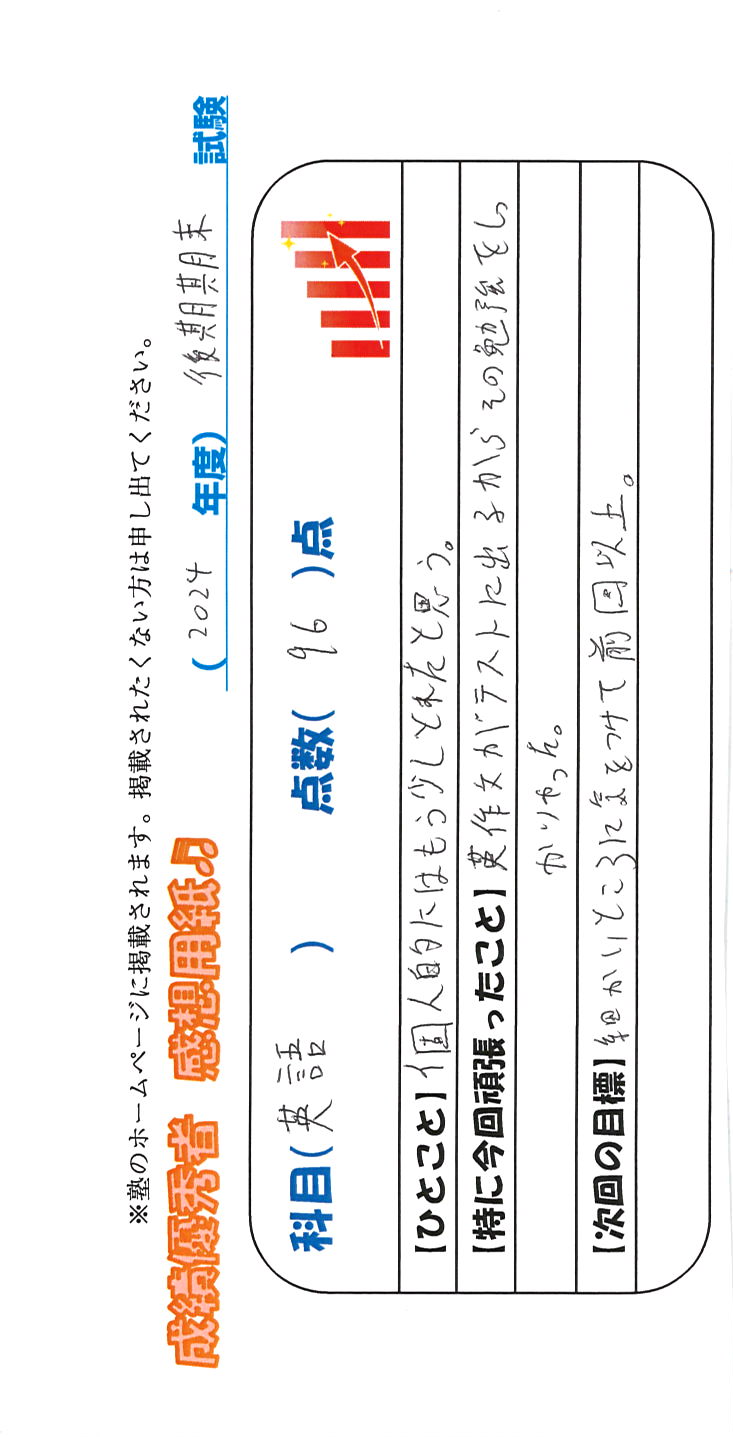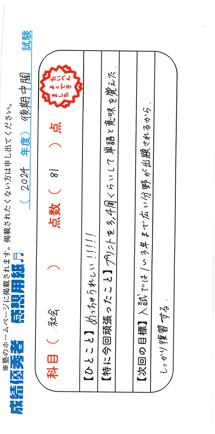 定期試験で優秀な成績を取った生徒さんのメッセージです。