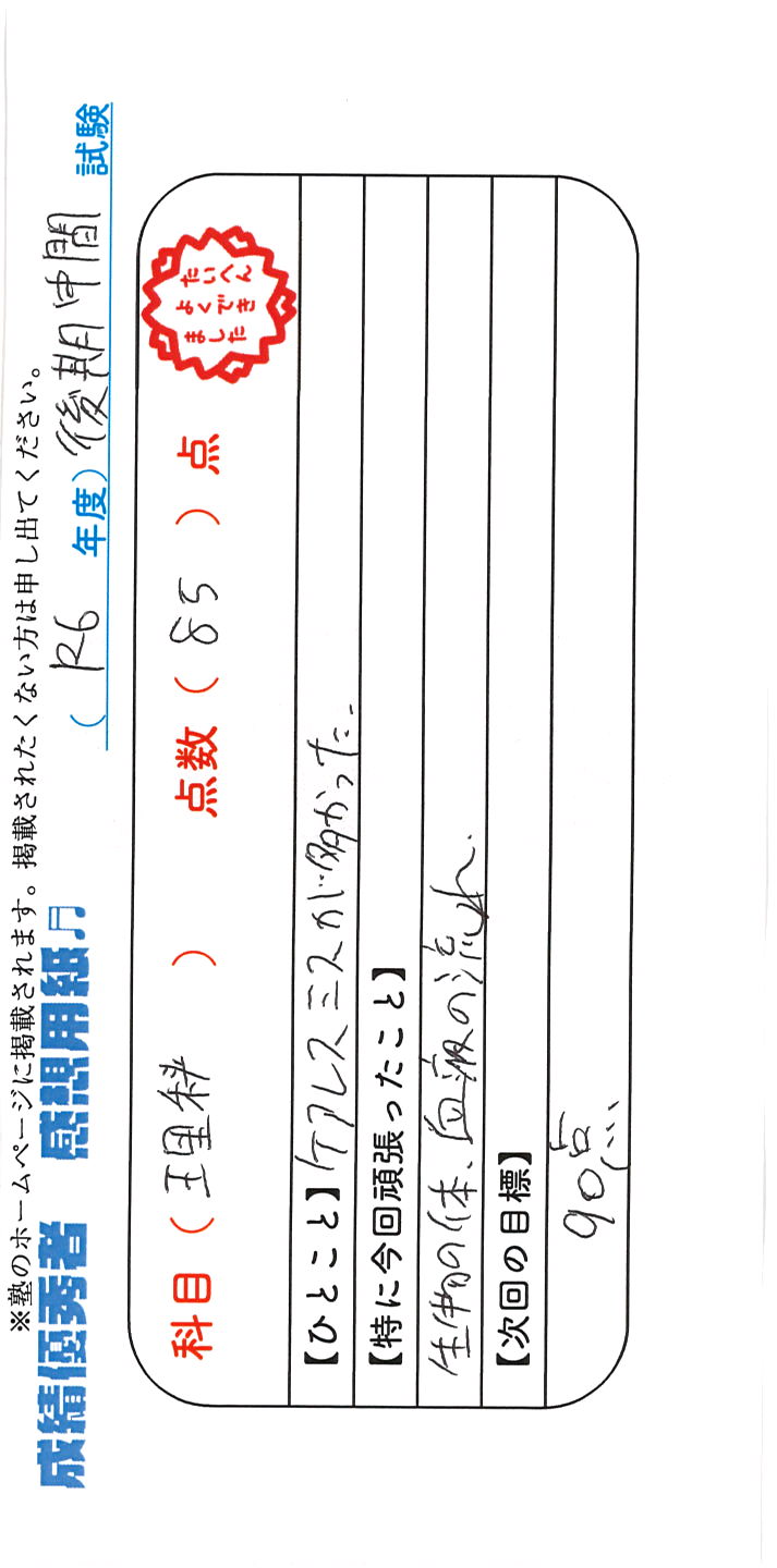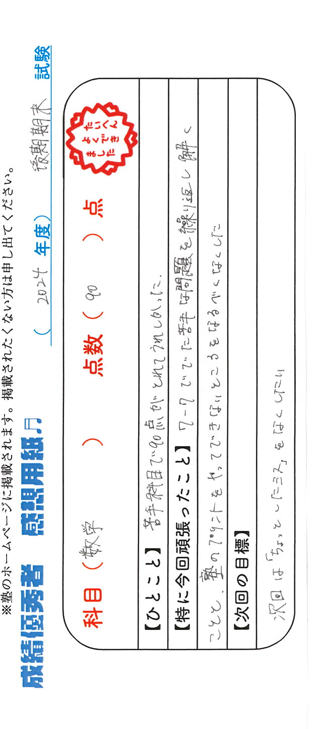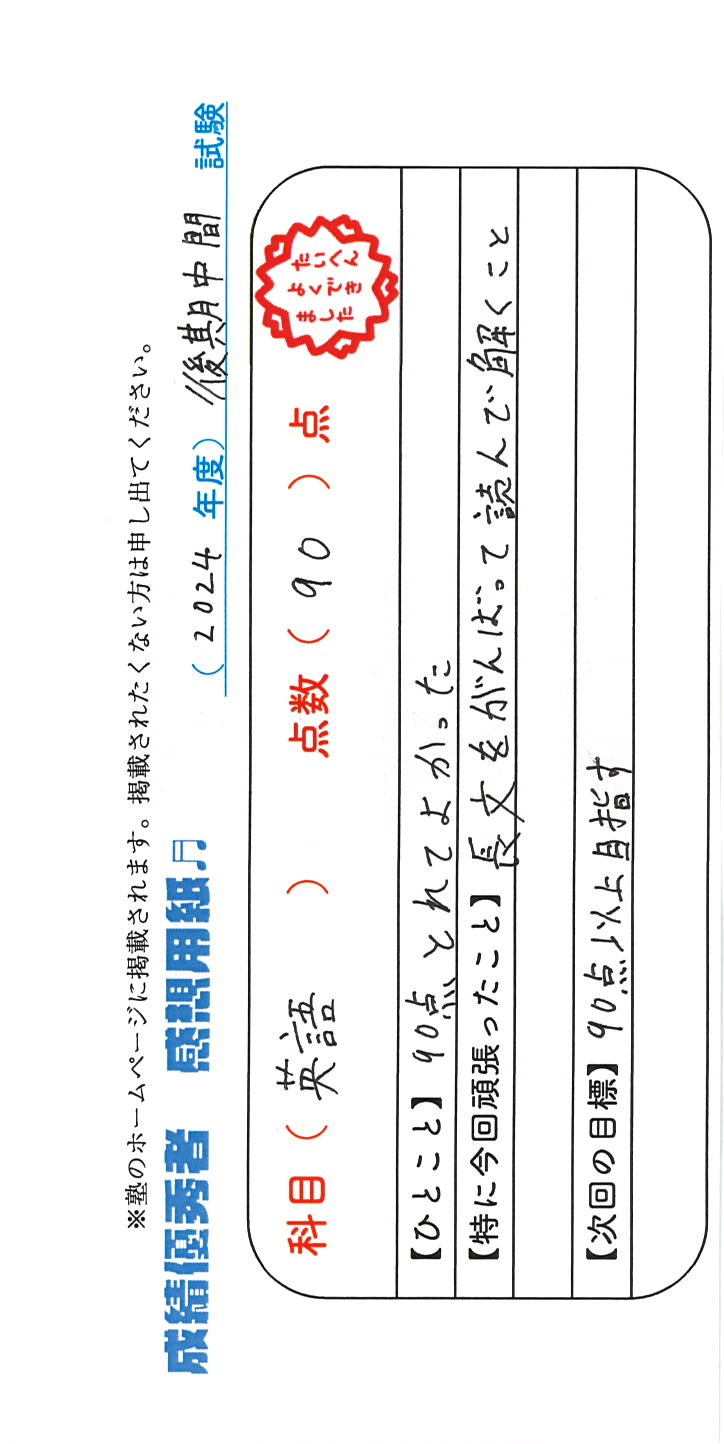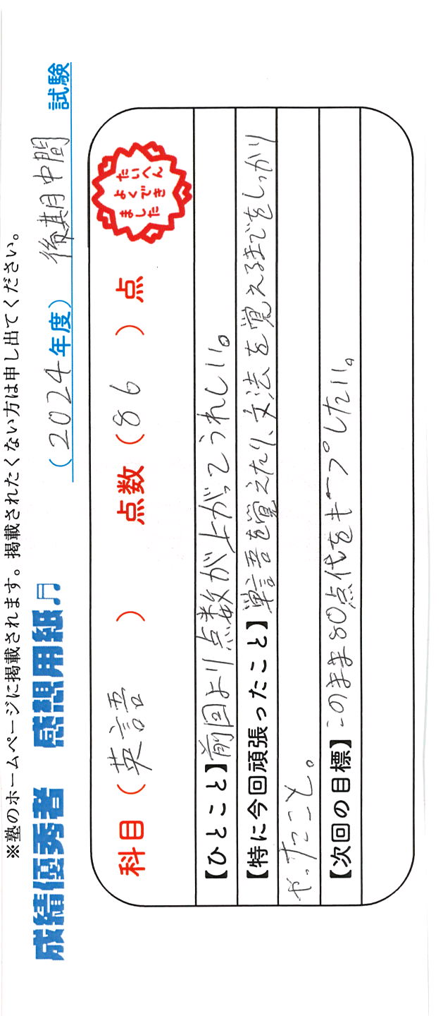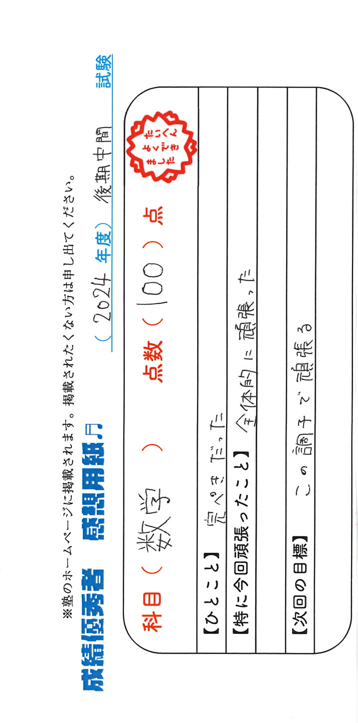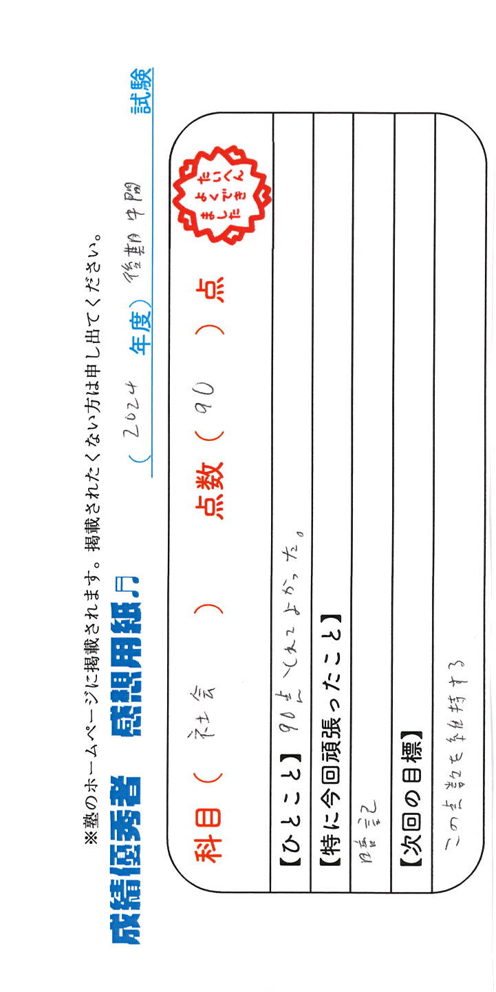 定期試験で優秀な成績を取った生徒さんのメッセージです。