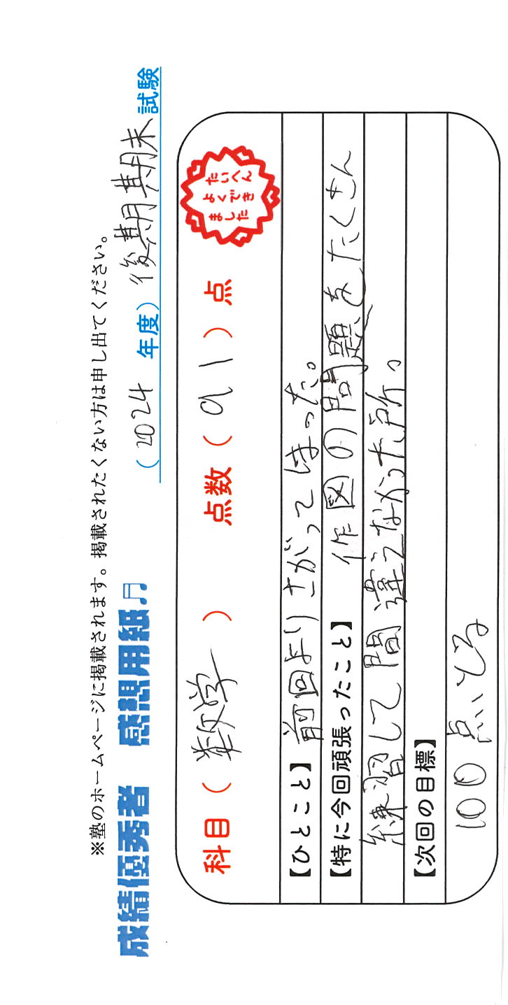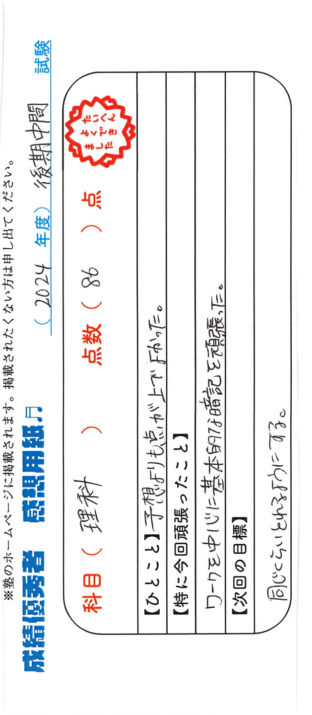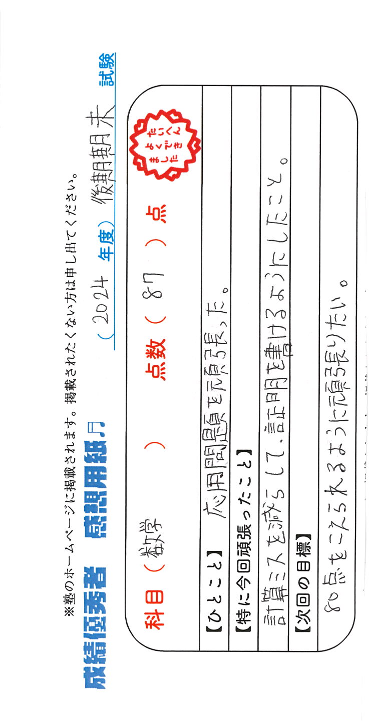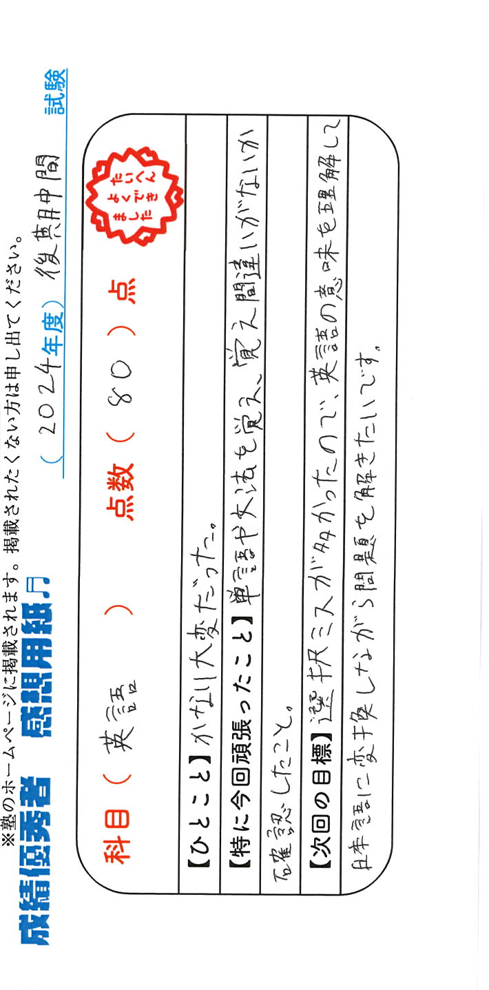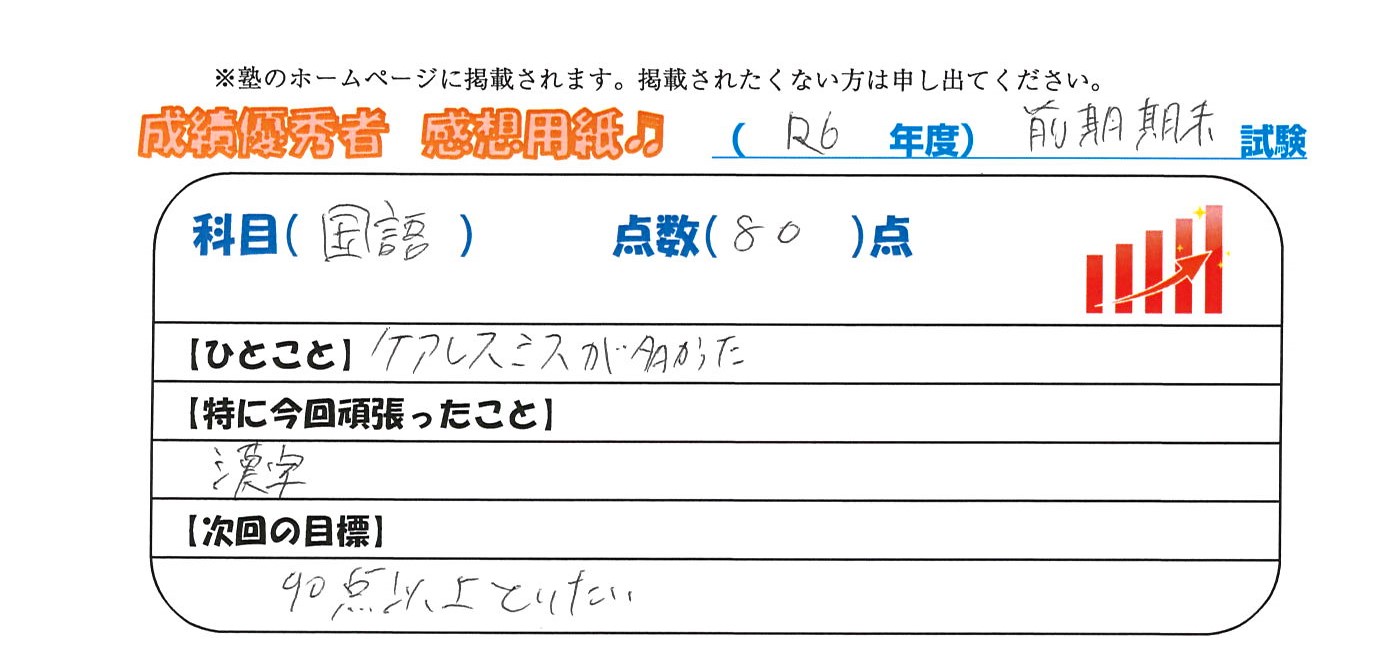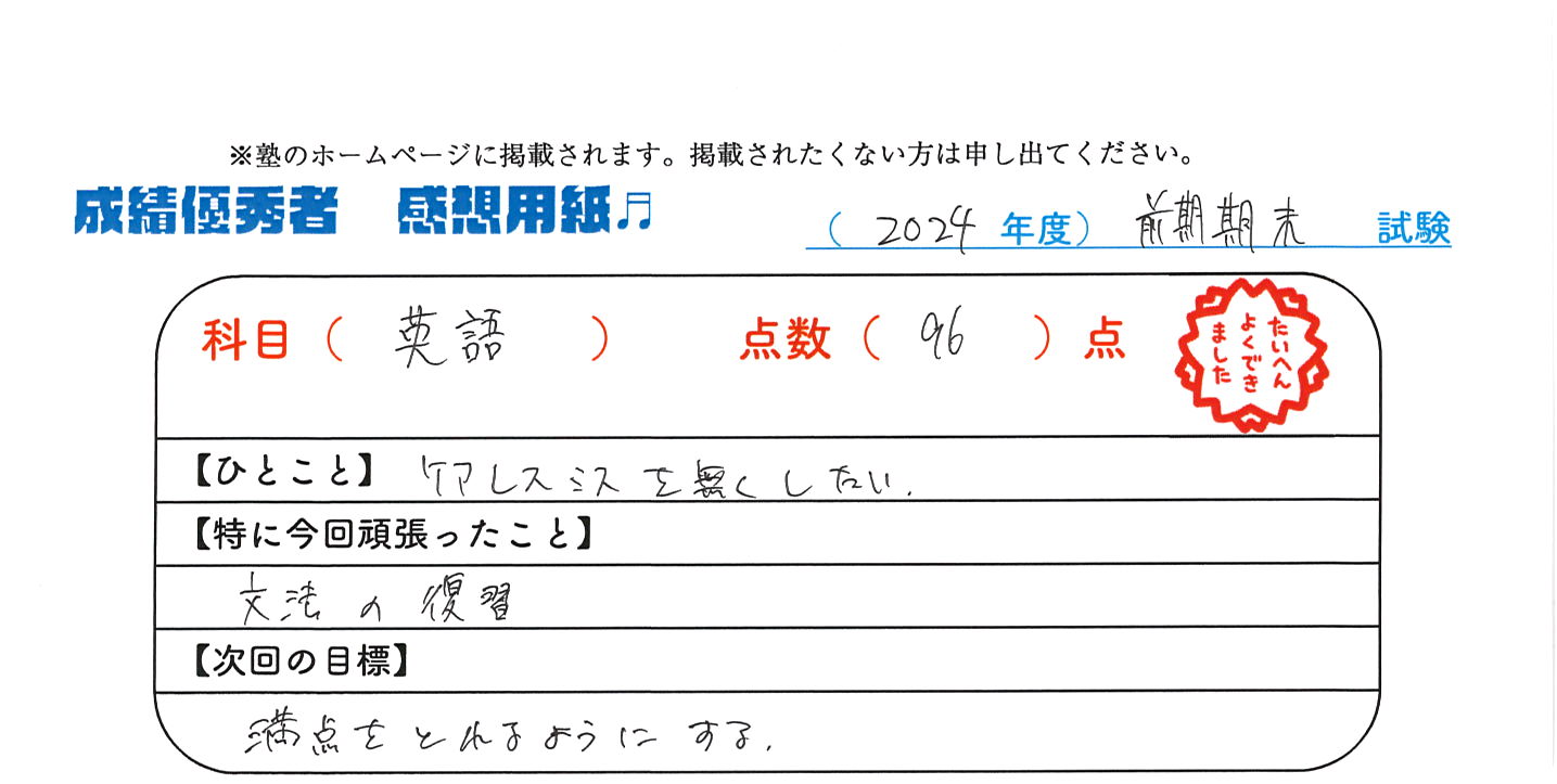 定期試験で優秀な成績を取った生徒さんのメッセージです。
