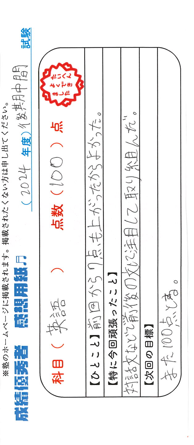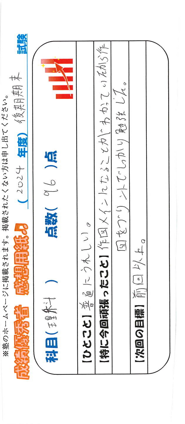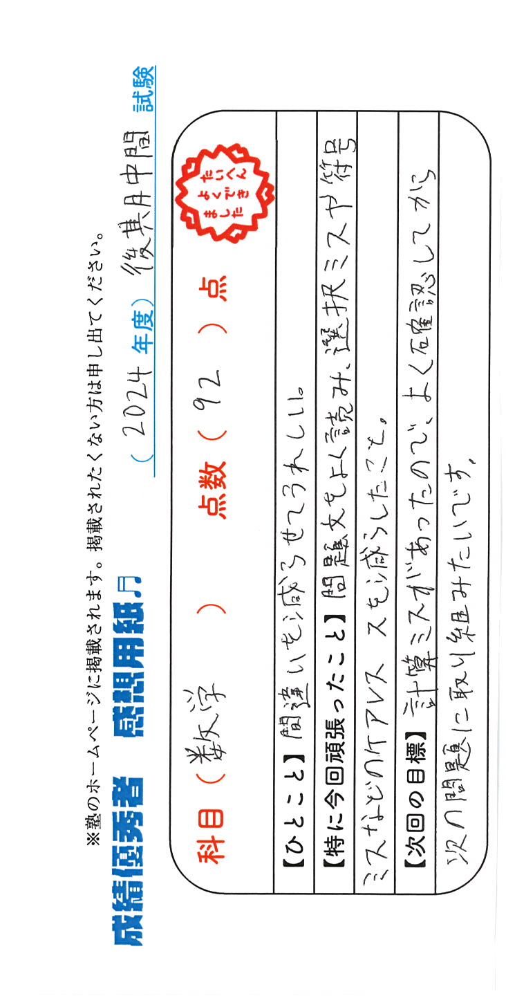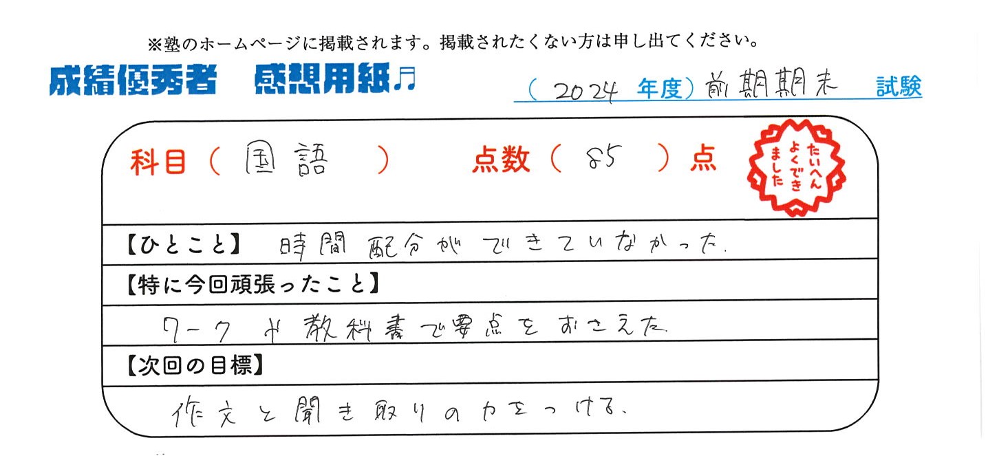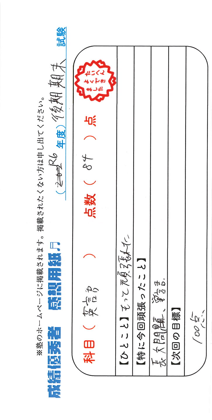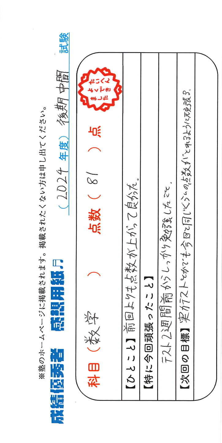 定期試験で優秀な成績を取った生徒さんのメッセージです。