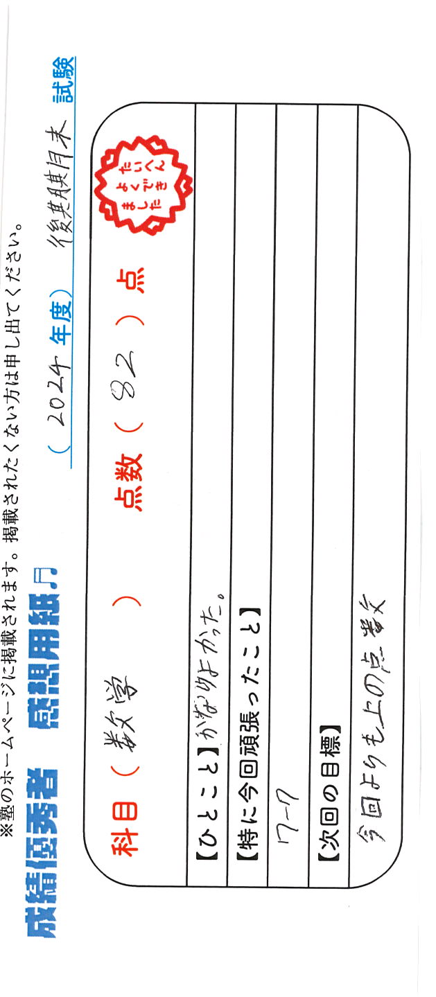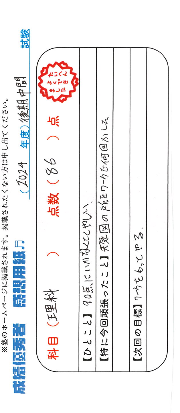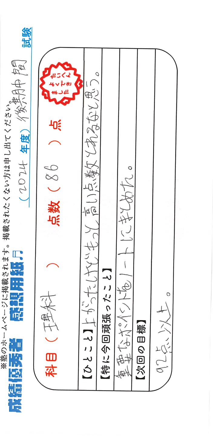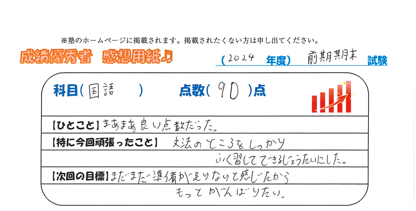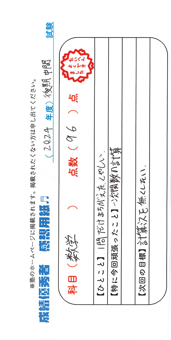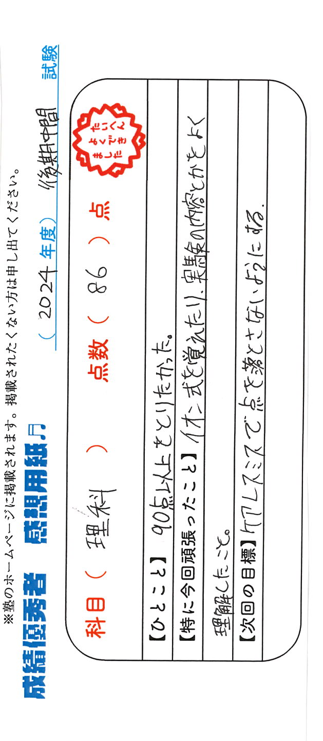 定期試験で優秀な成績を取った生徒さんのメッセージです。