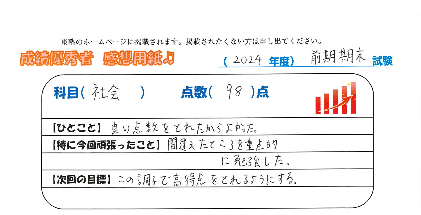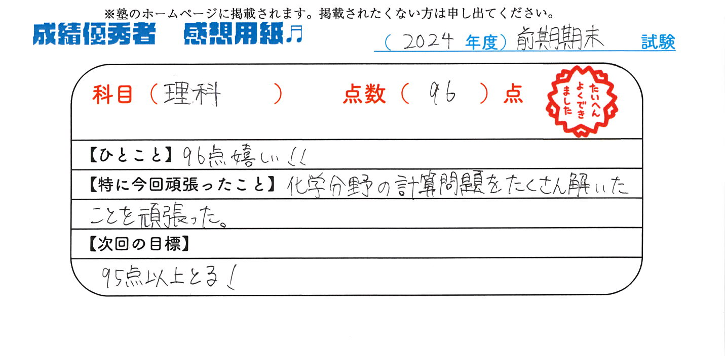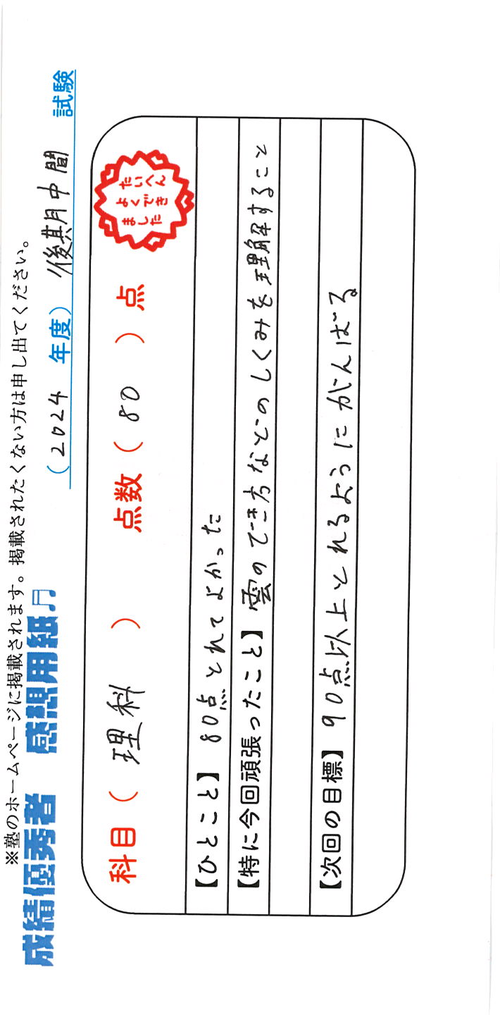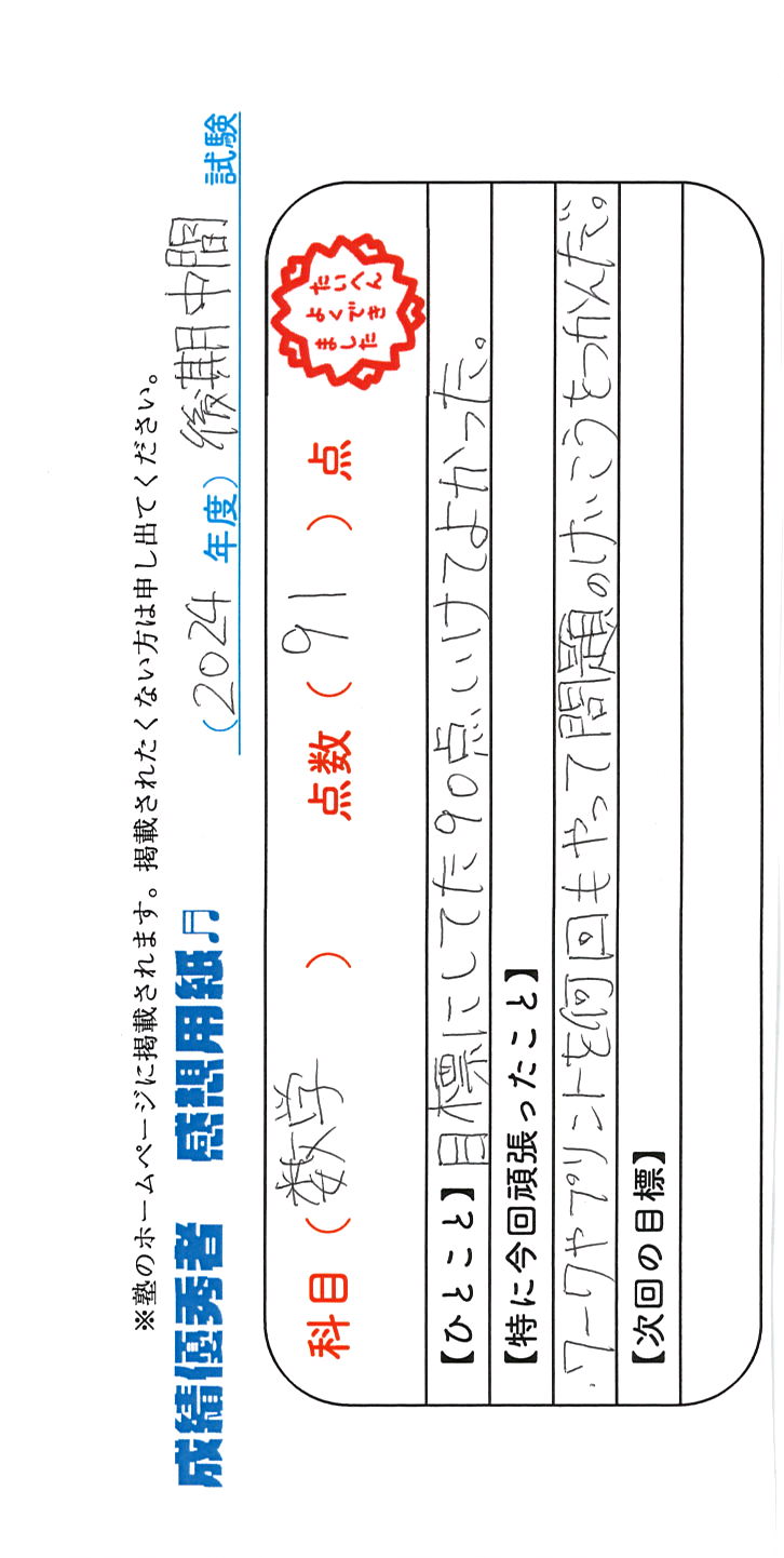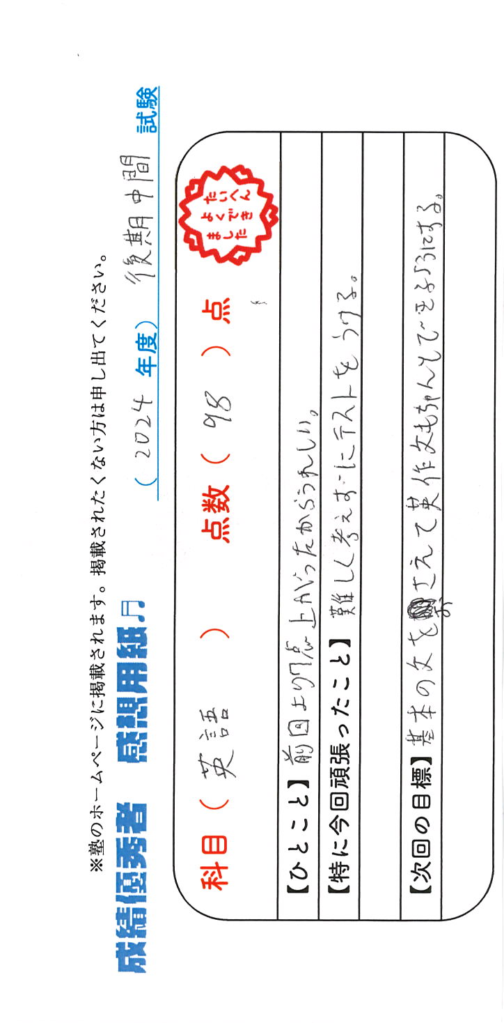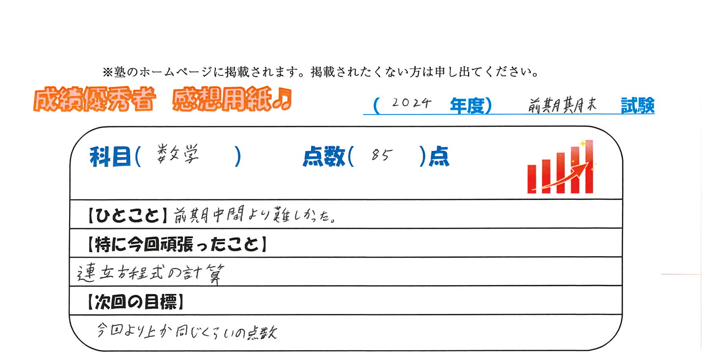 定期試験で優秀な成績を取った生徒さんのメッセージです。
