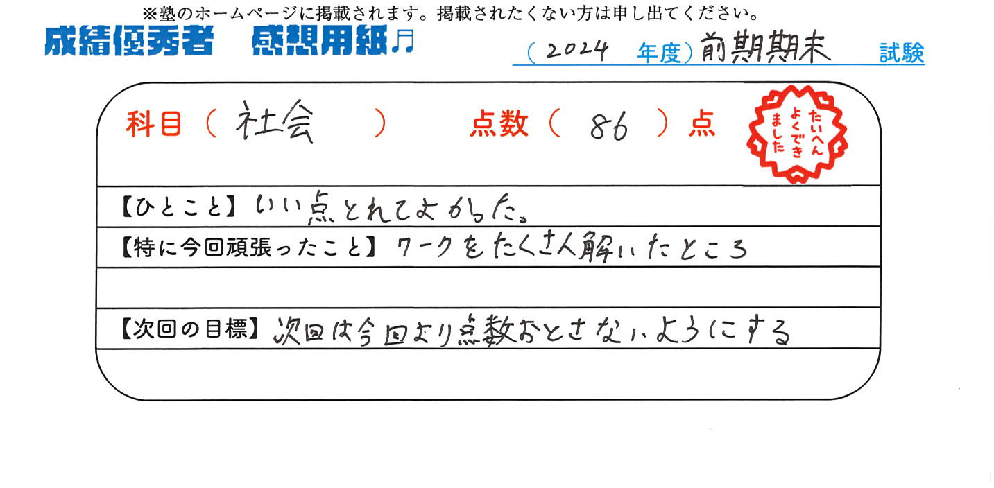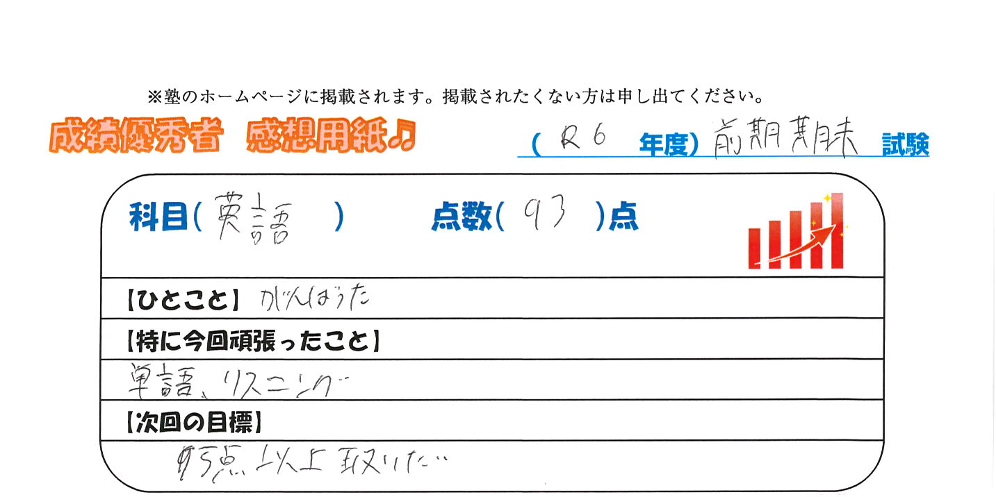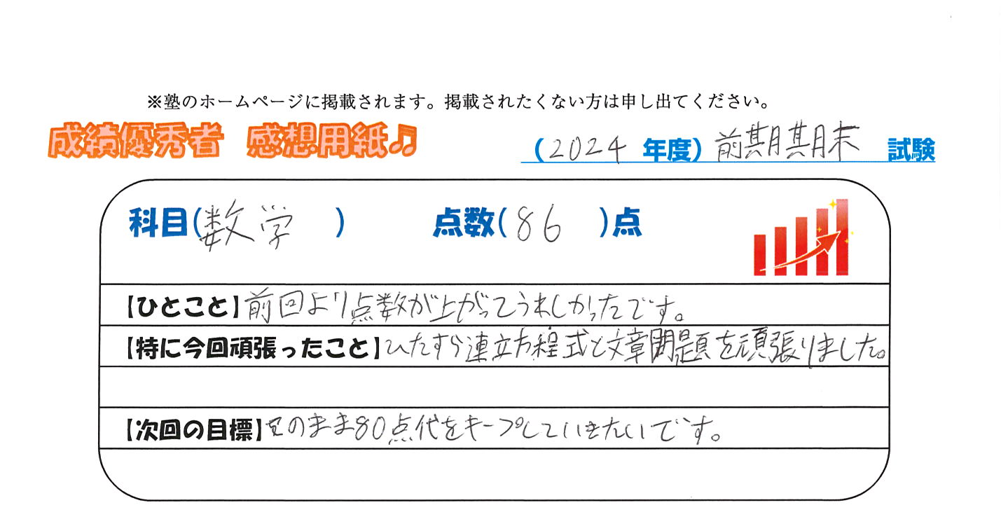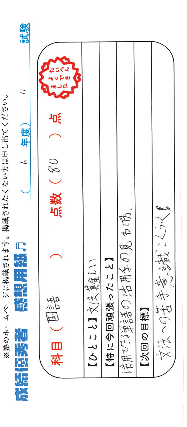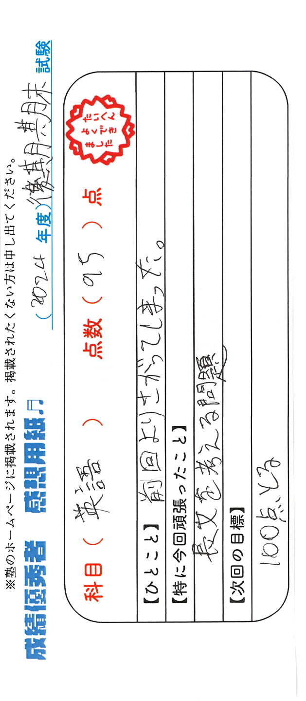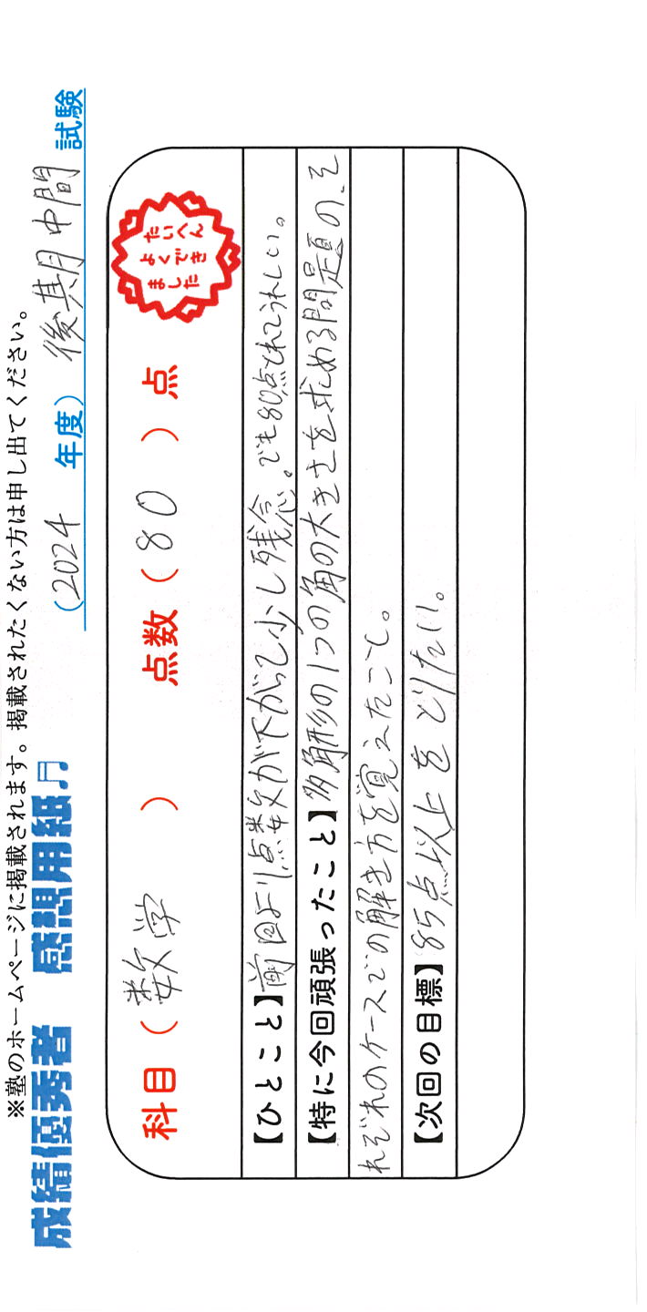 定期試験で優秀な成績を取った生徒さんのメッセージです。