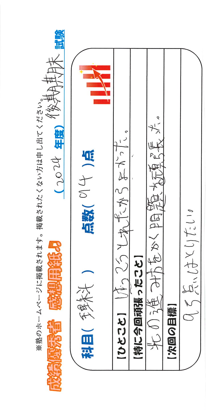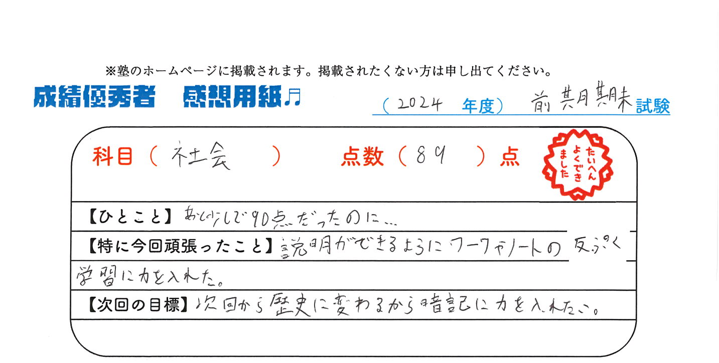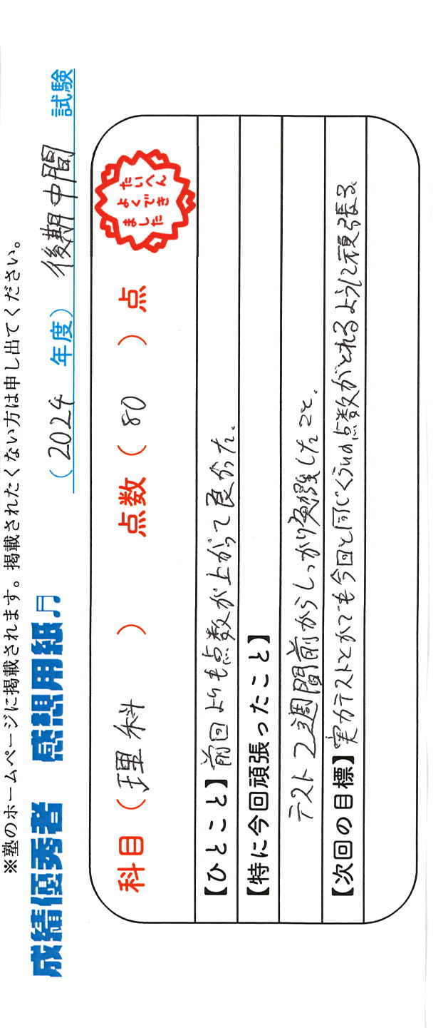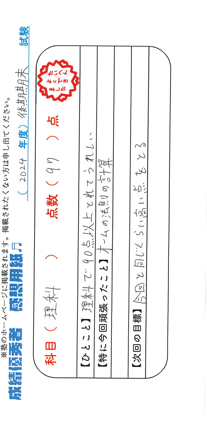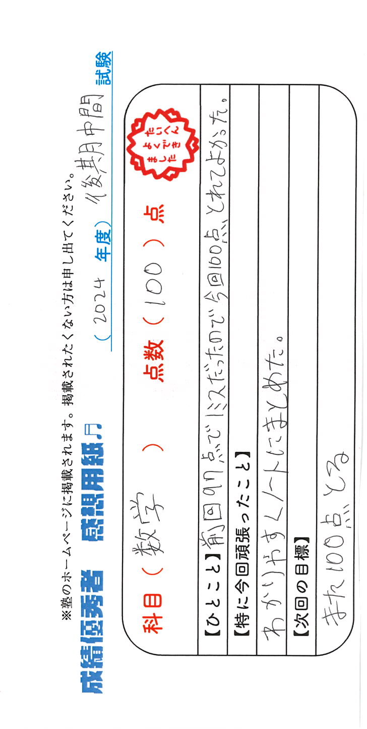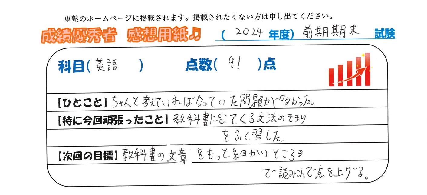 定期試験で優秀な成績を取った生徒さんのメッセージです。