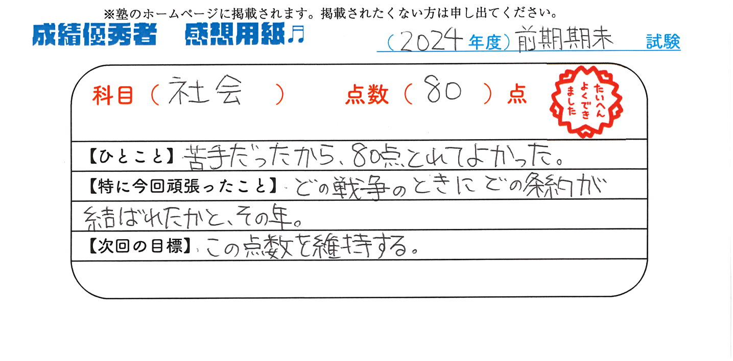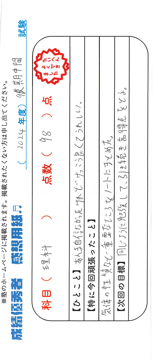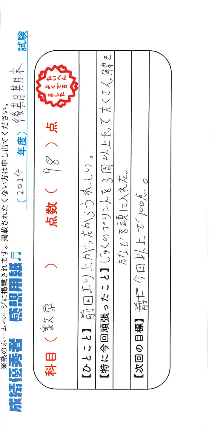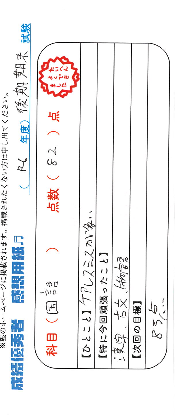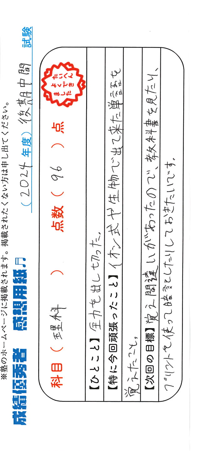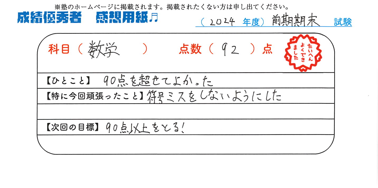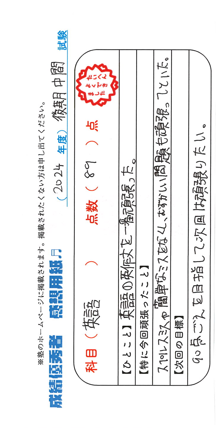 定期試験で優秀な成績を取った生徒さんのメッセージです。