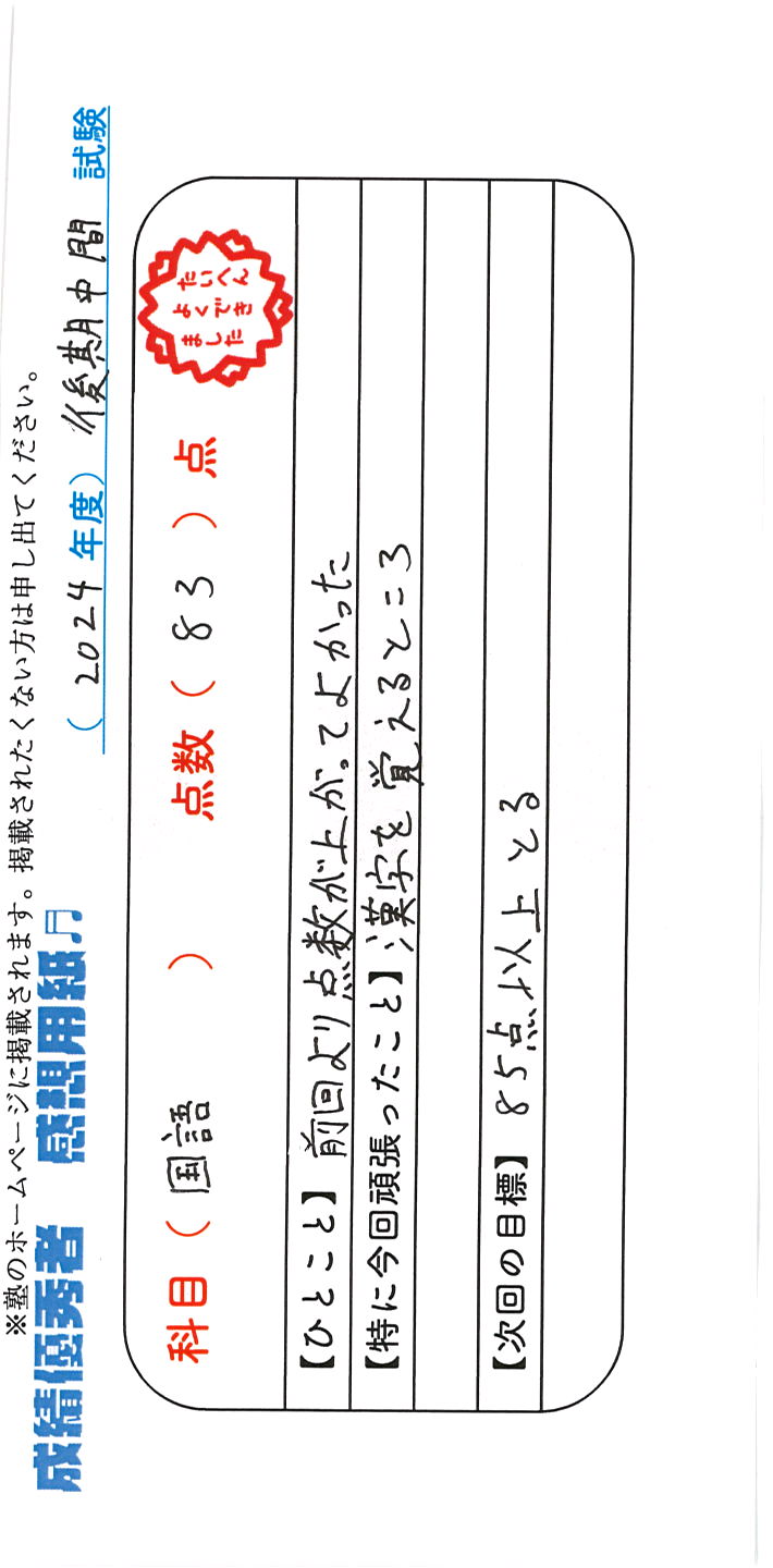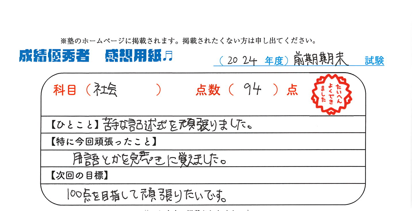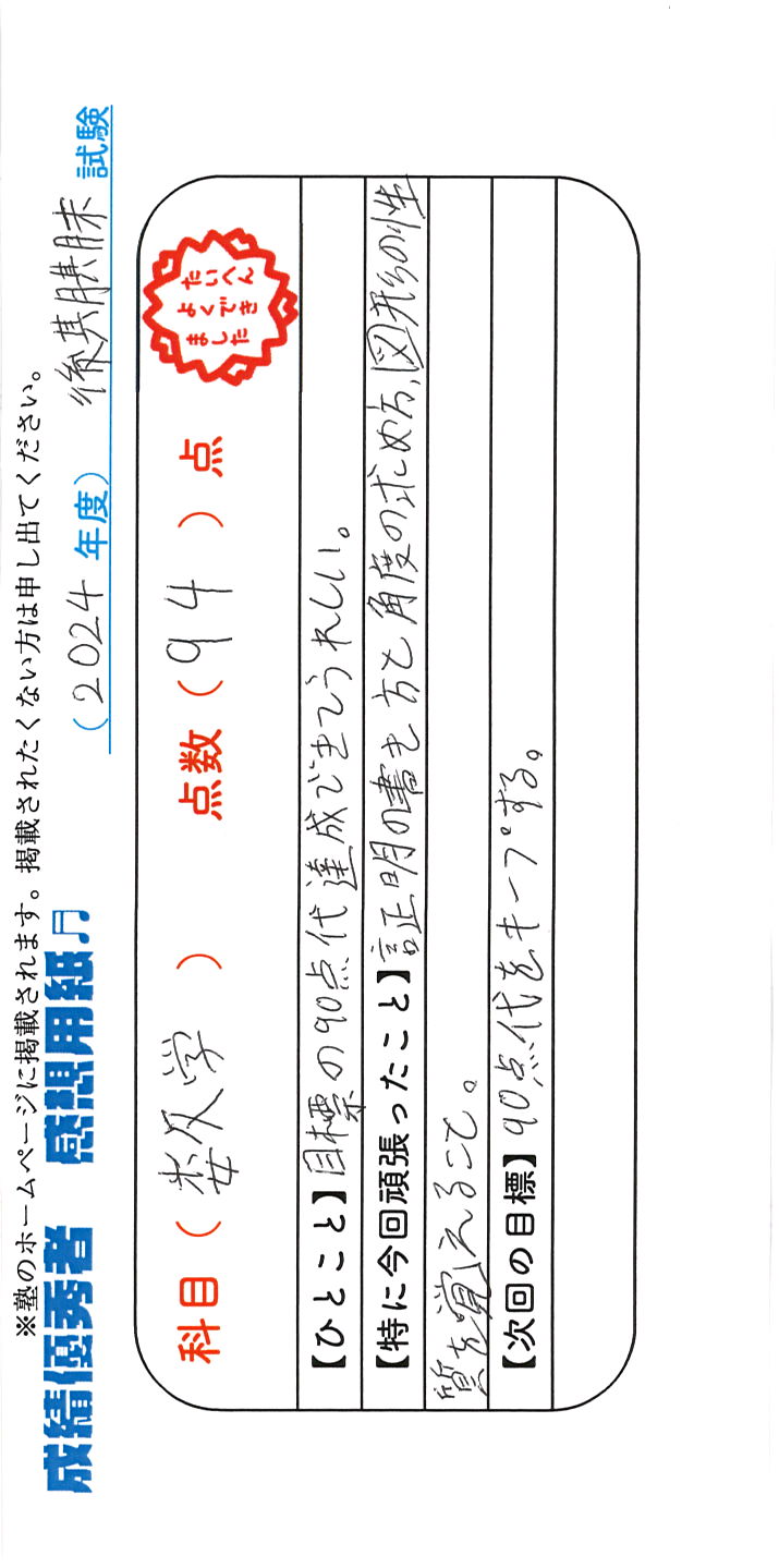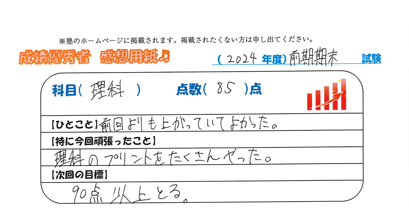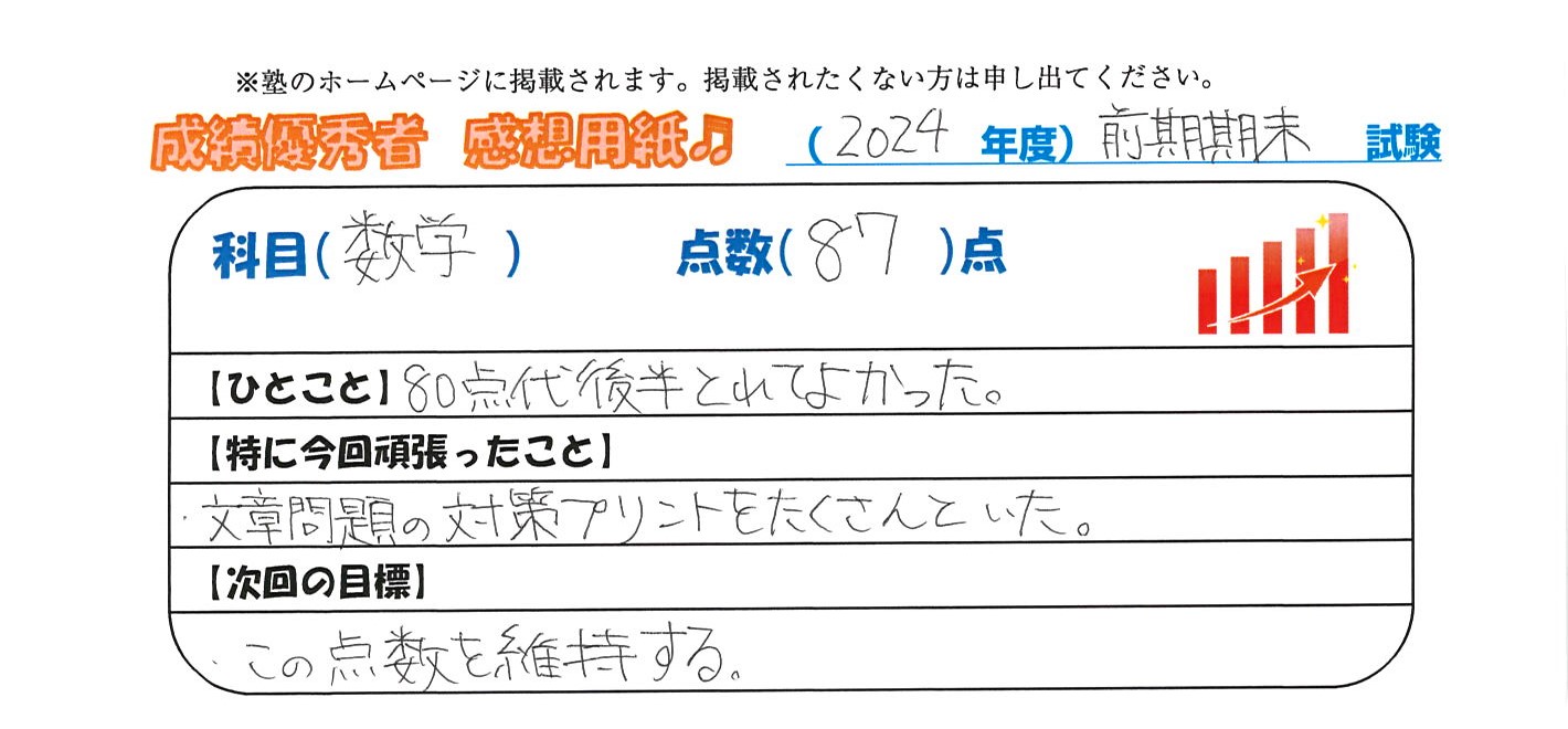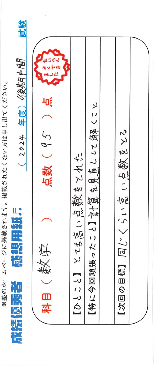 定期試験で優秀な成績を取った生徒さんのメッセージです。