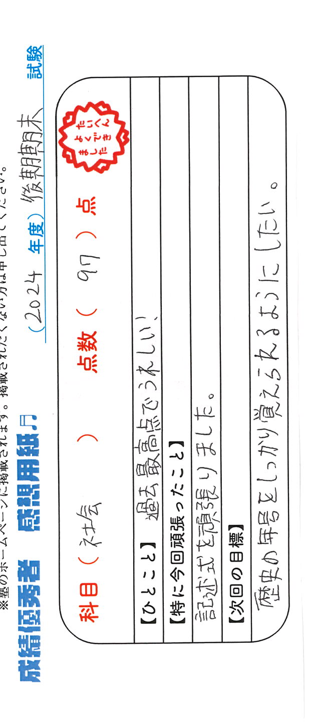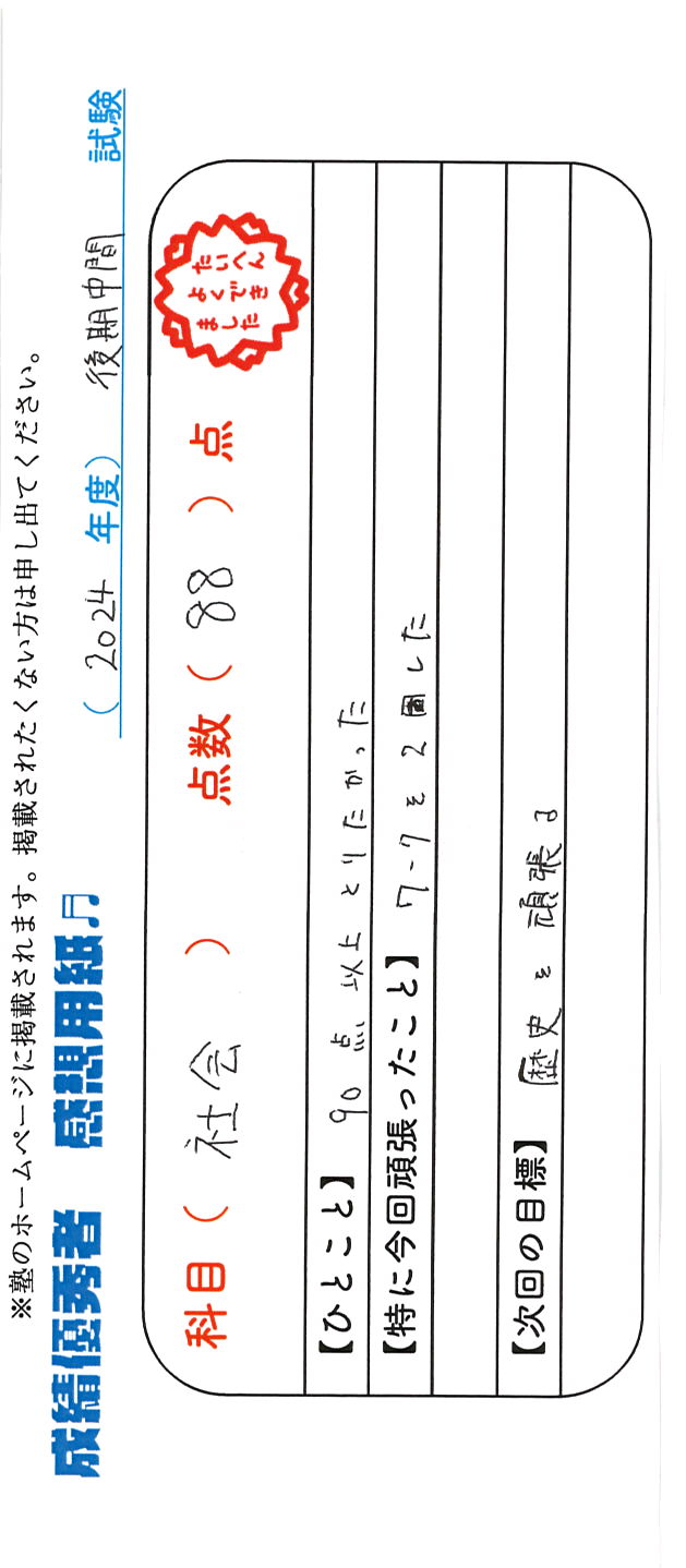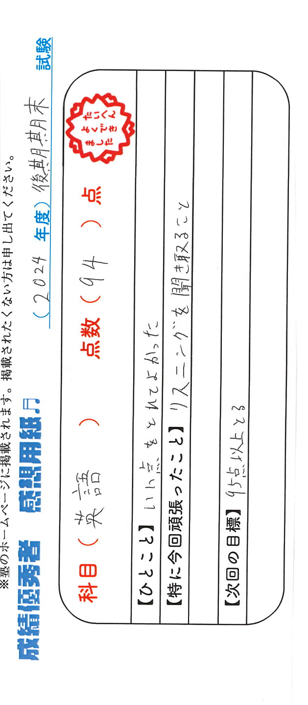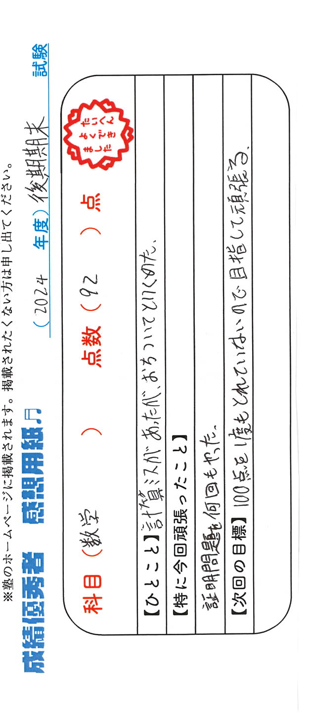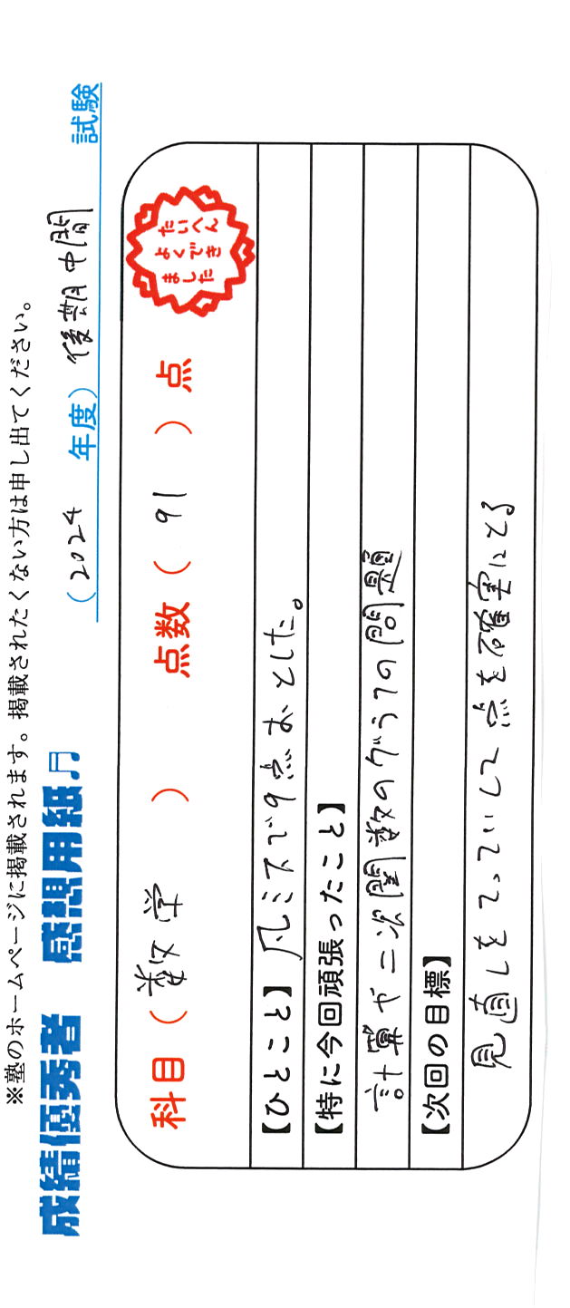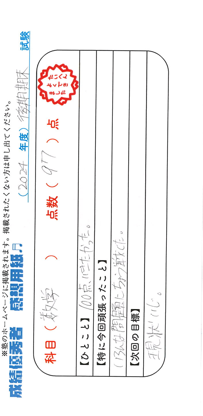 定期試験で優秀な成績を取った生徒さんのメッセージです。