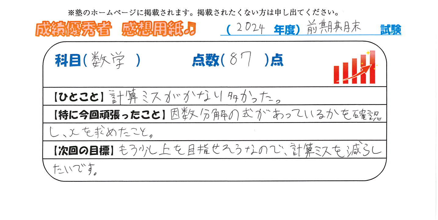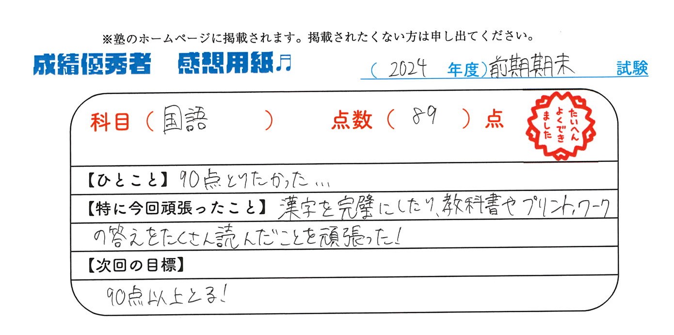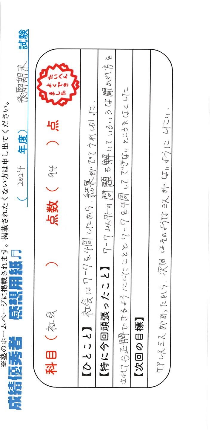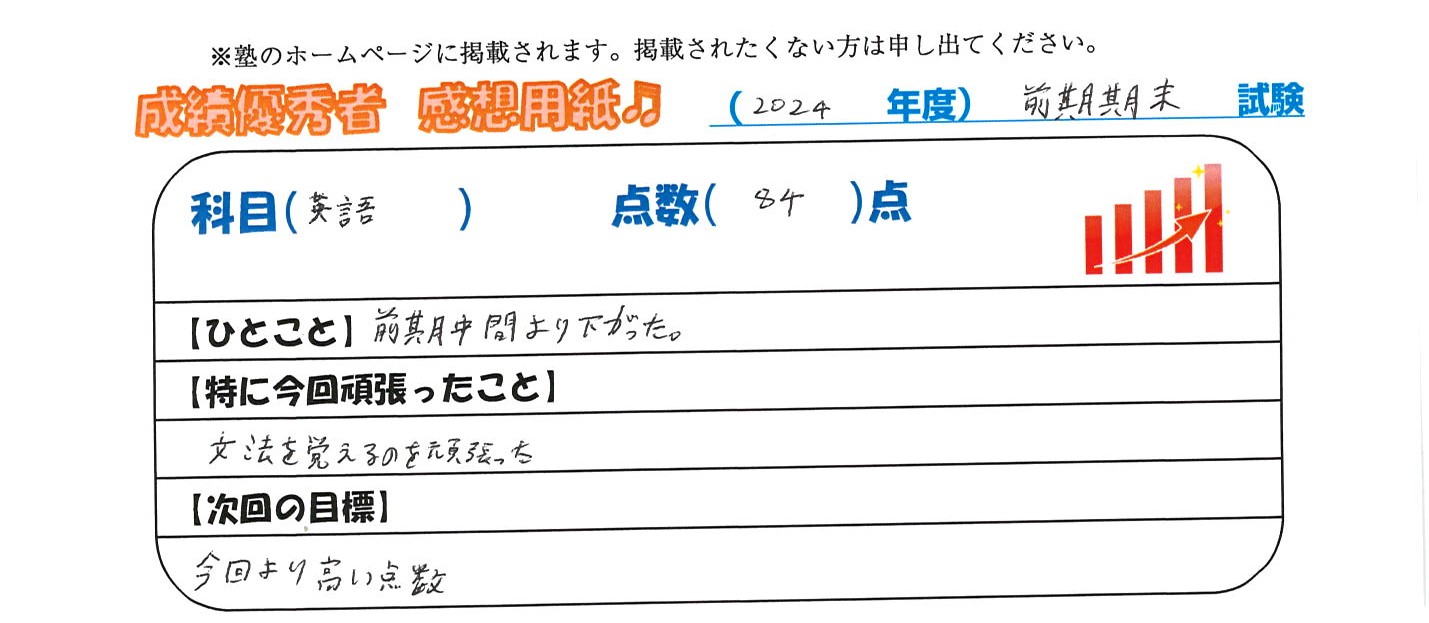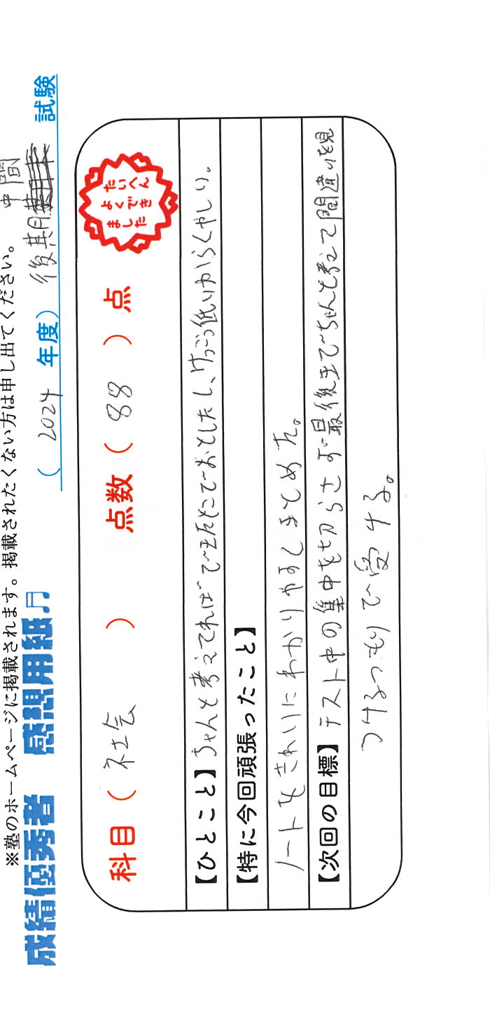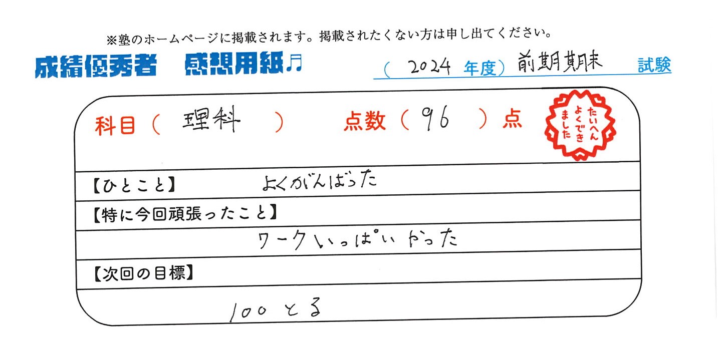 定期試験で優秀な成績を取った生徒さんのメッセージです。