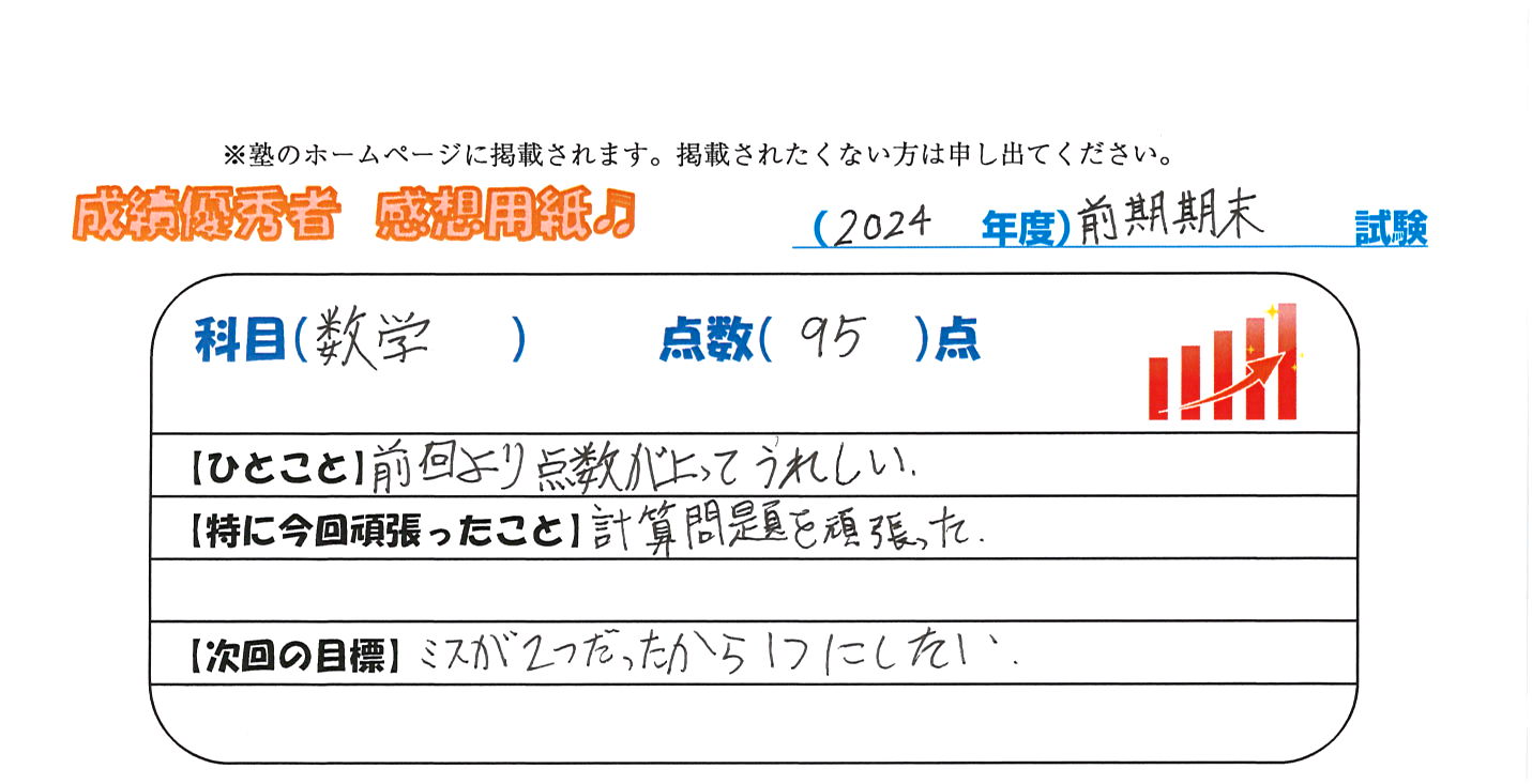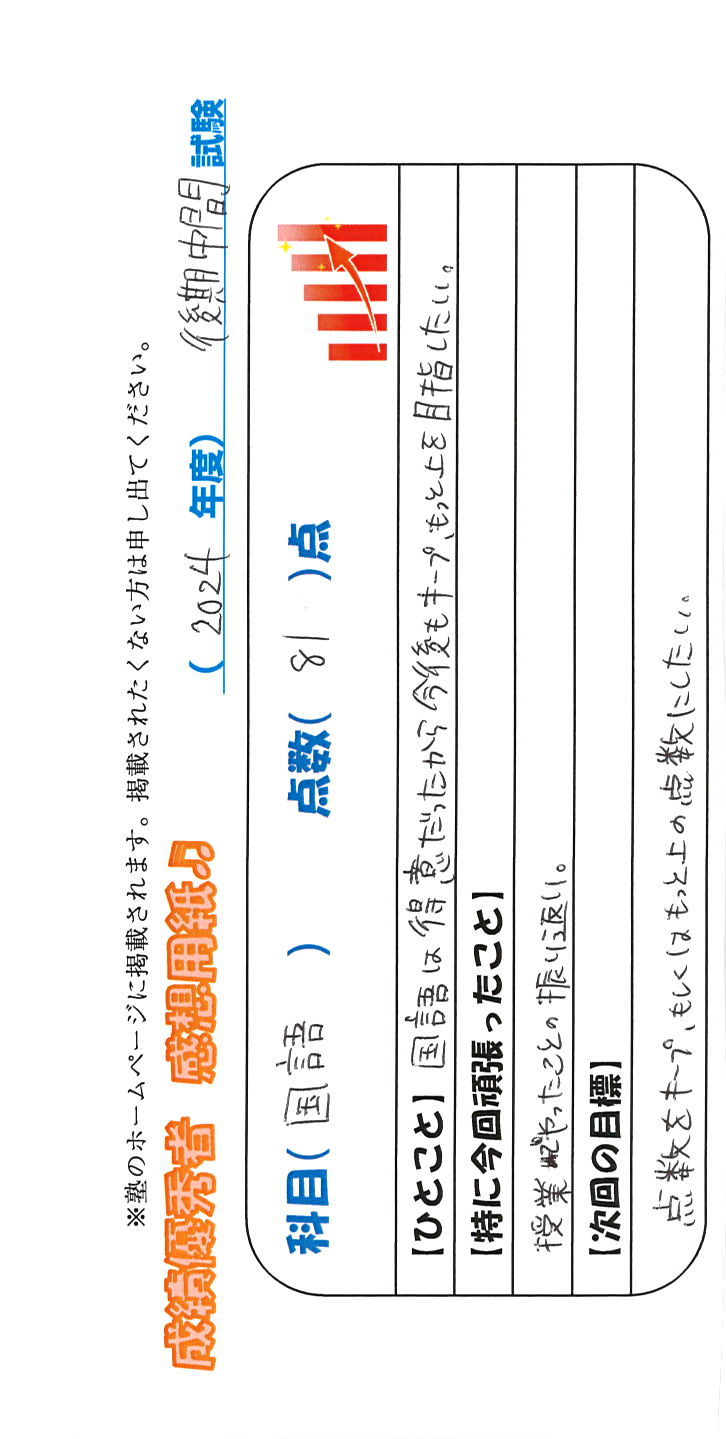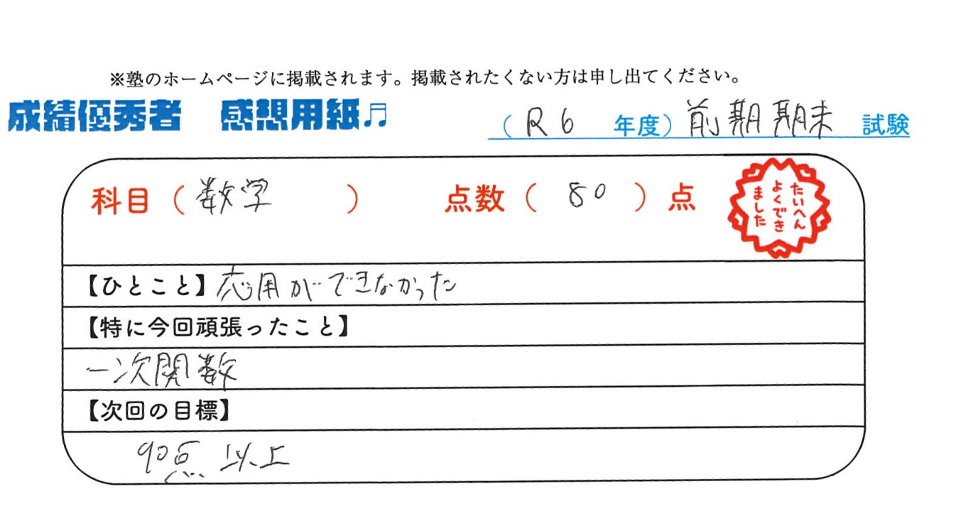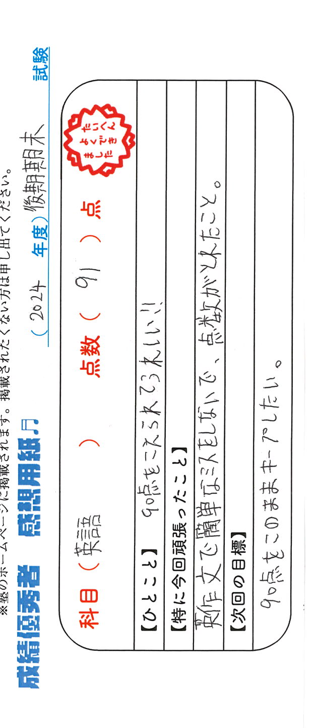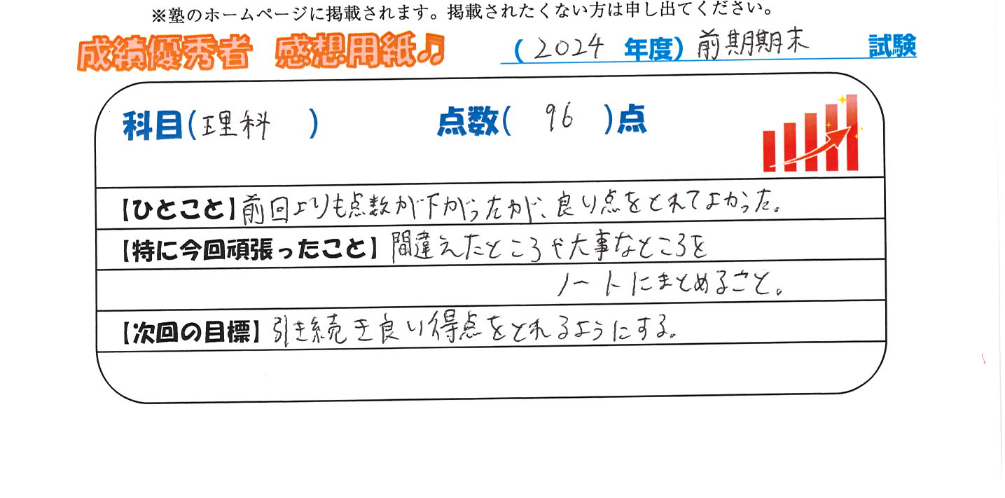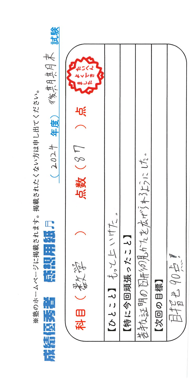 定期試験で優秀な成績を取った生徒さんのメッセージです。