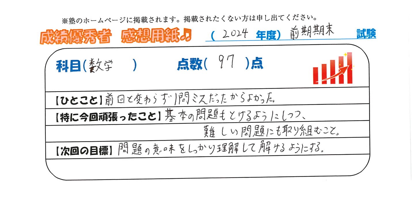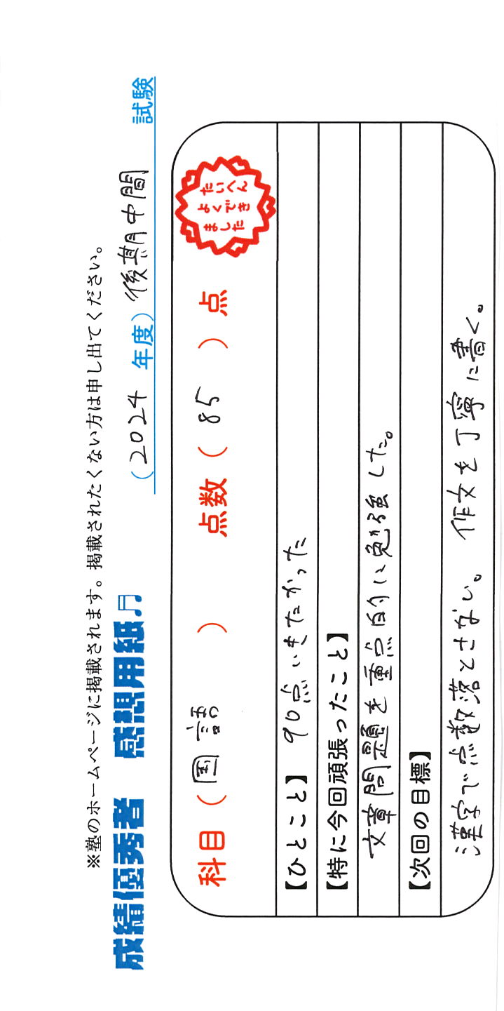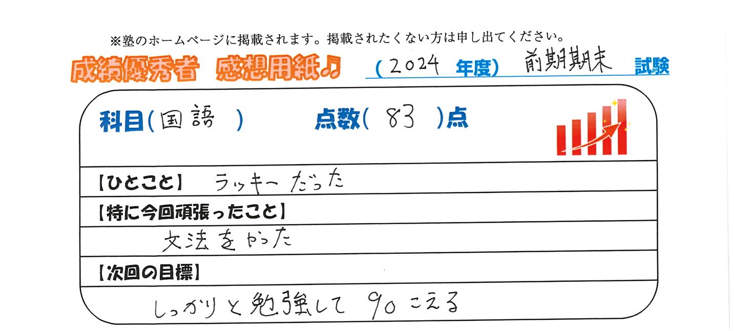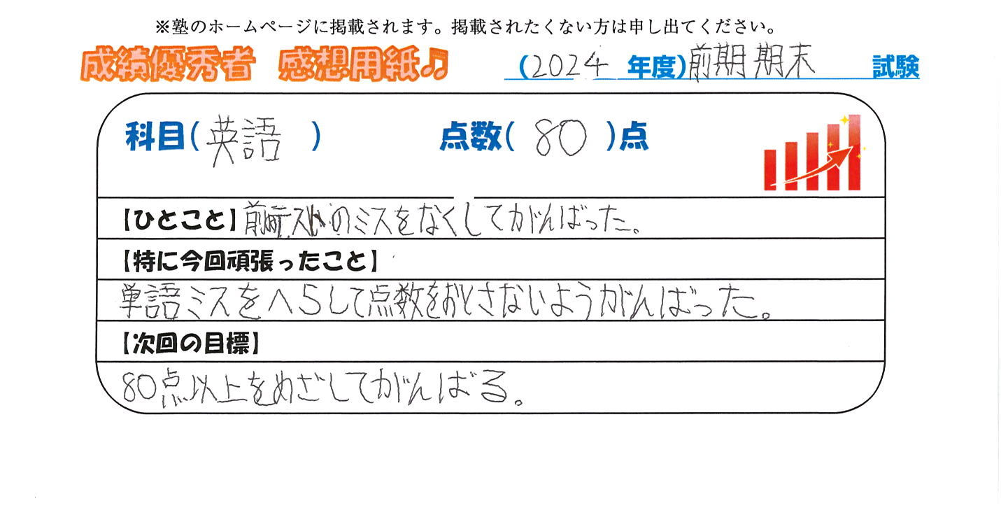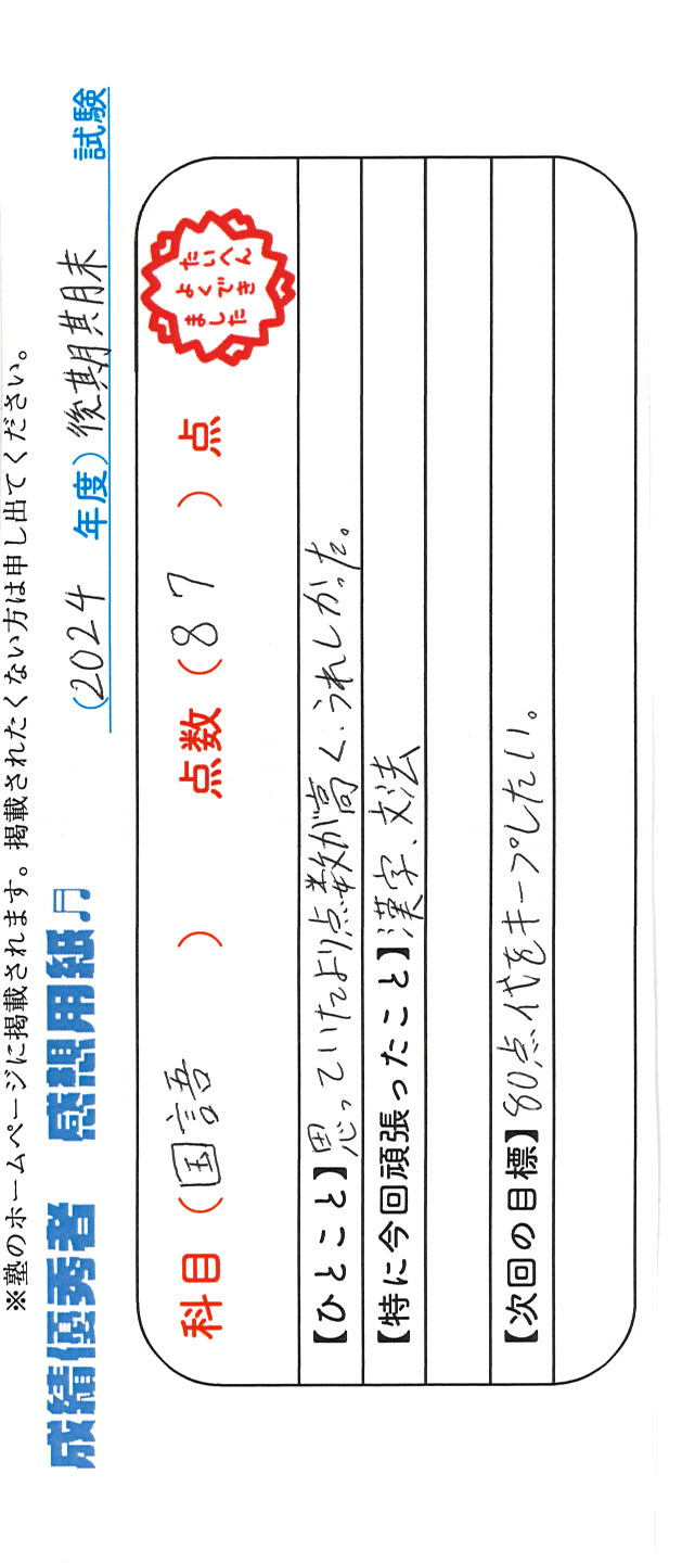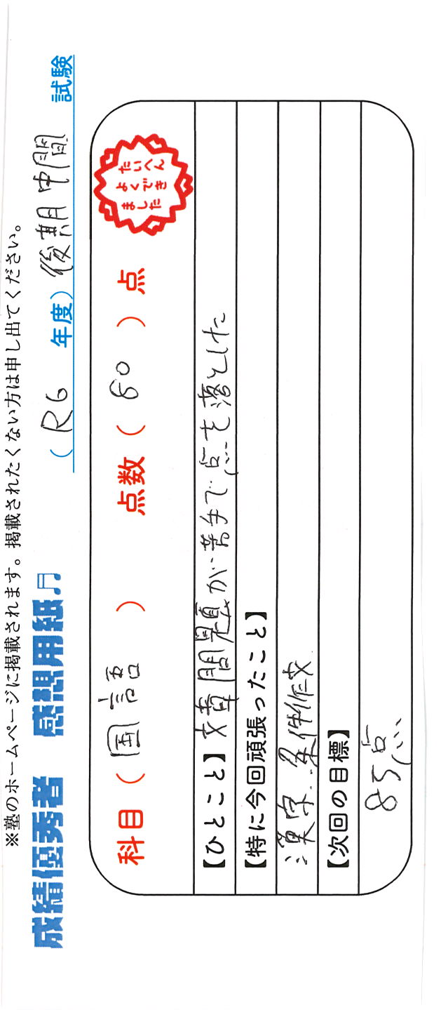 定期試験で優秀な成績を取った生徒さんのメッセージです。