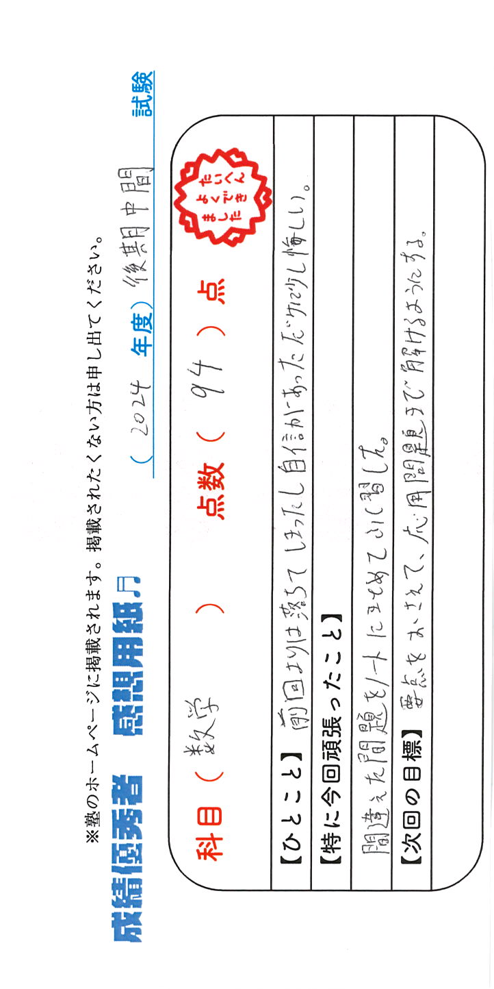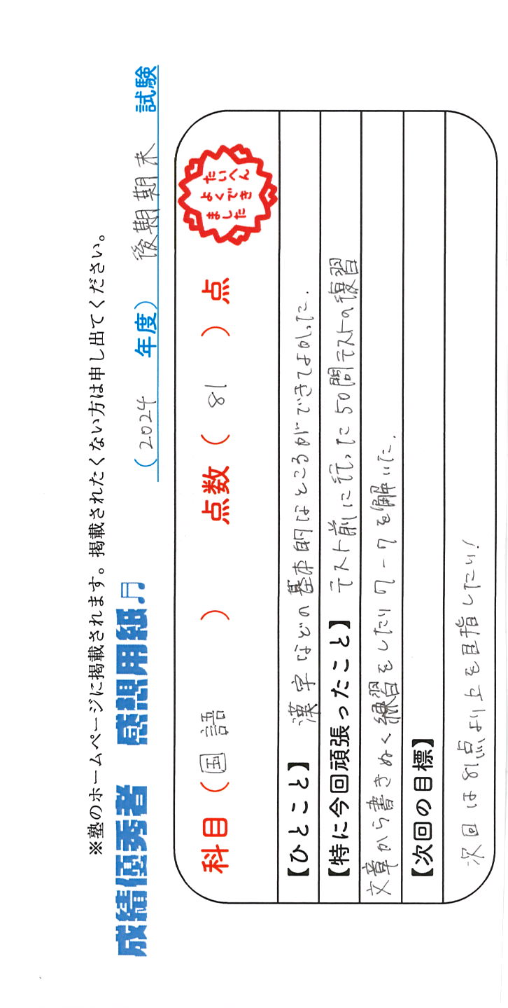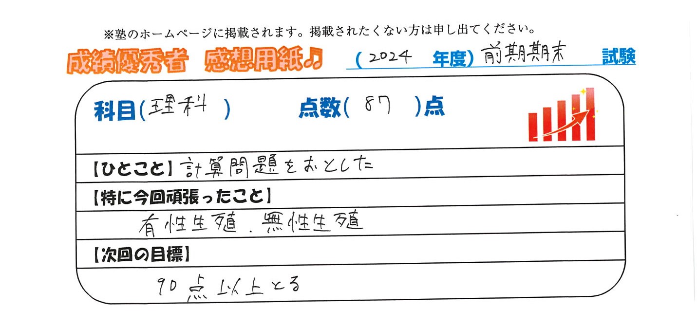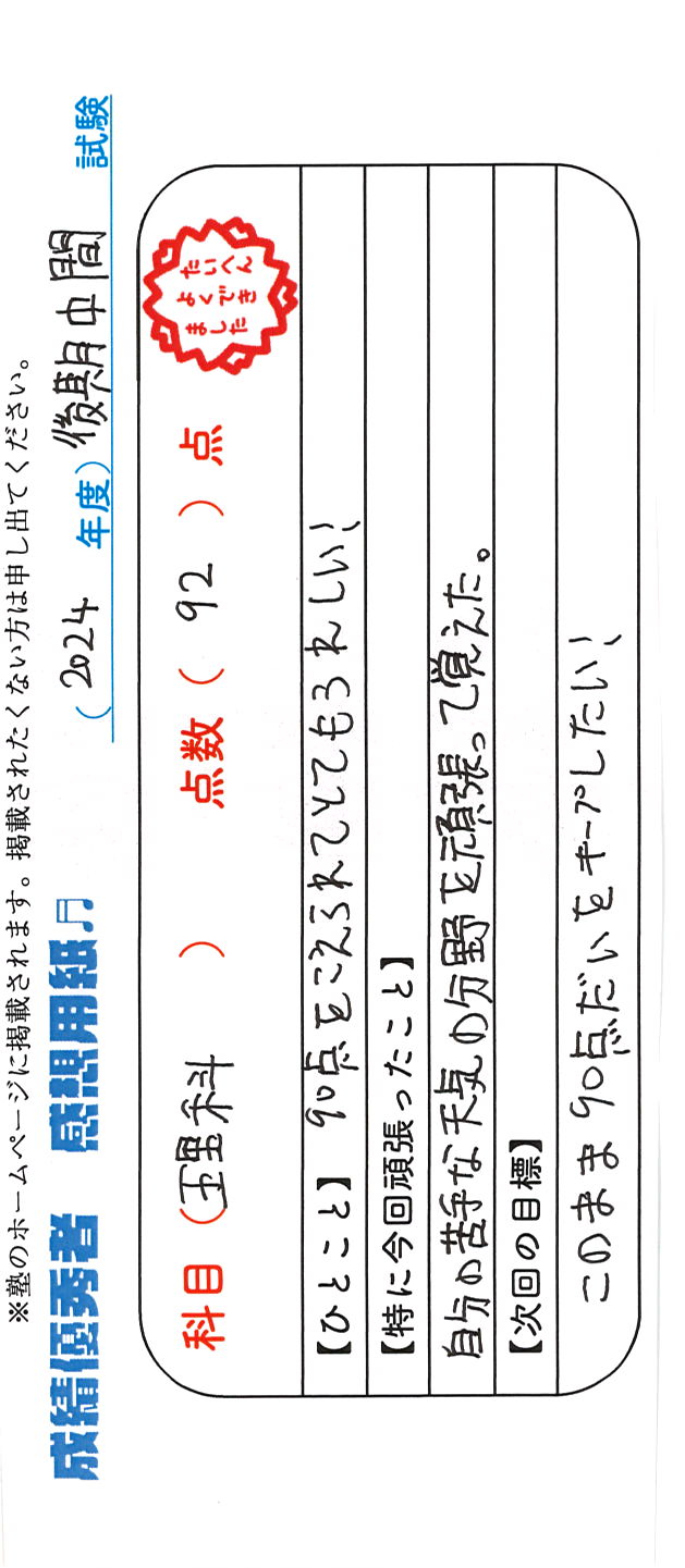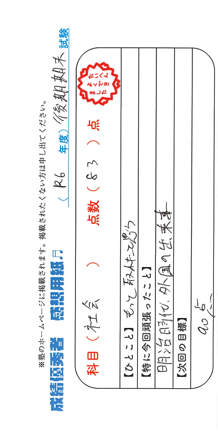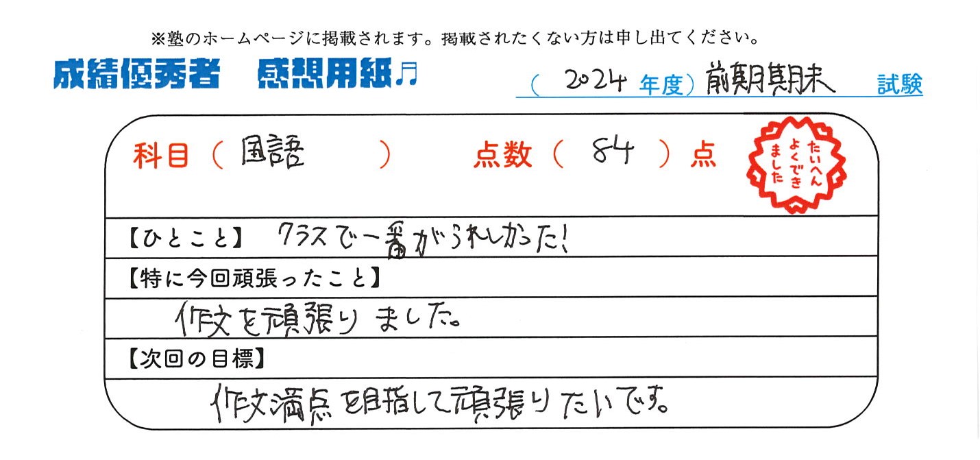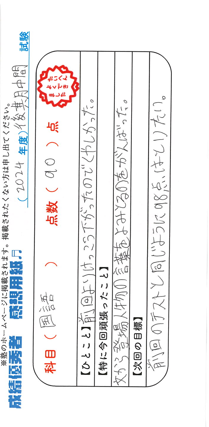 定期試験で優秀な成績を取った生徒さんのメッセージです。