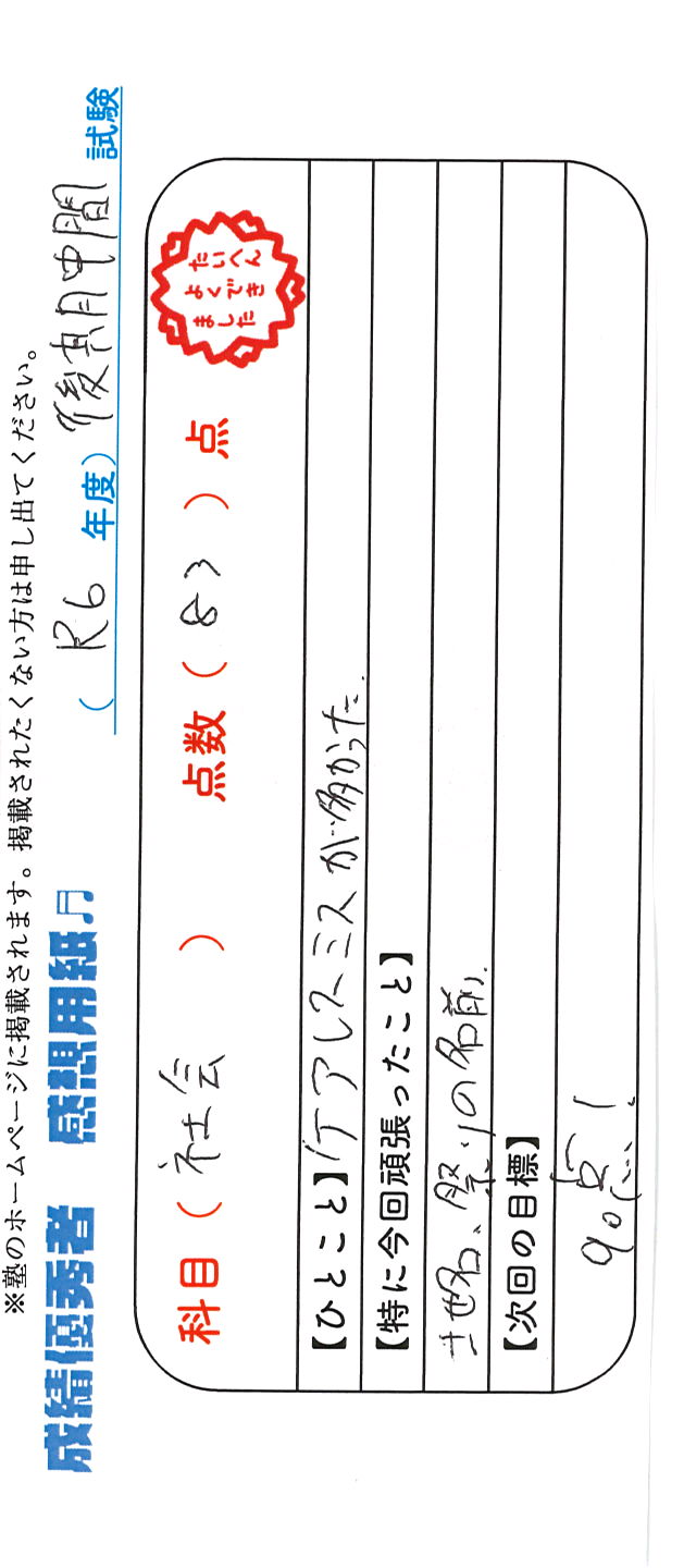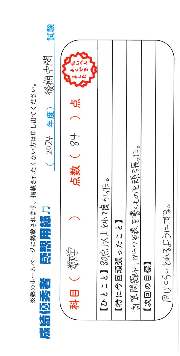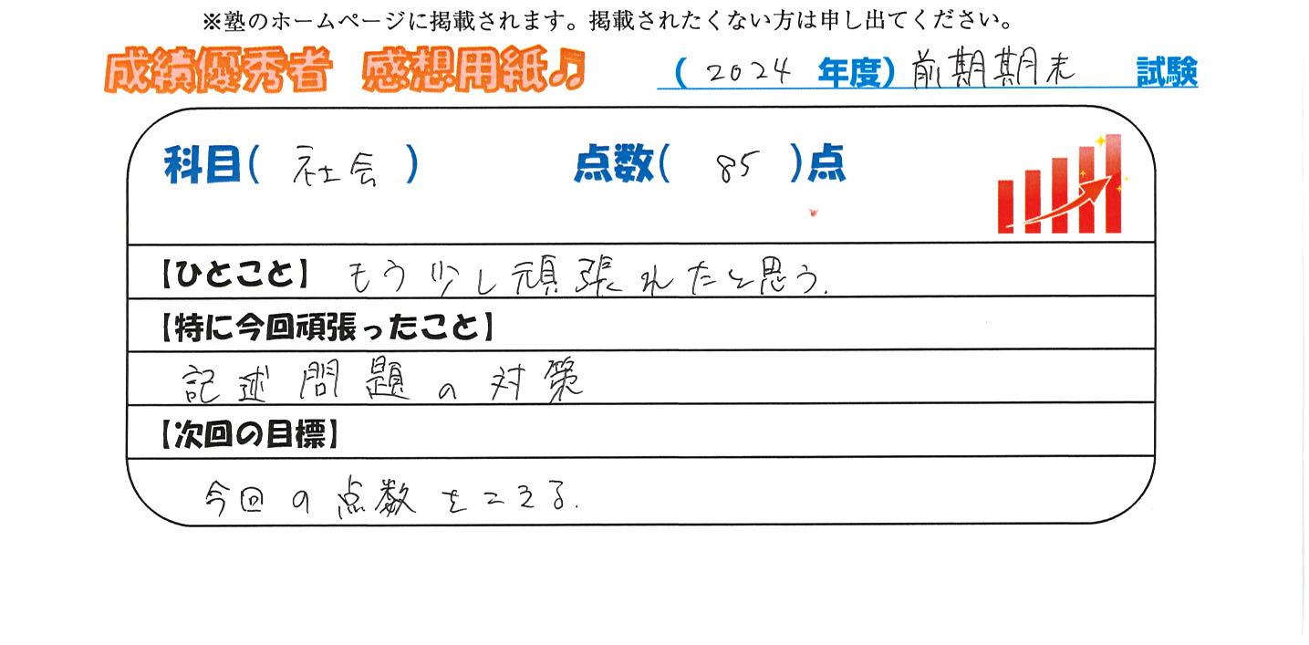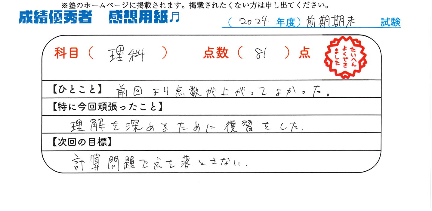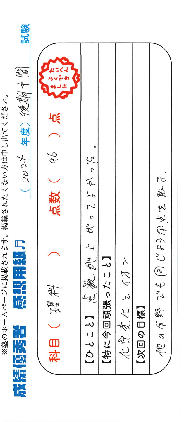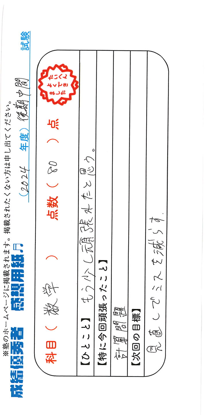 定期試験で優秀な成績を取った生徒さんのメッセージです。