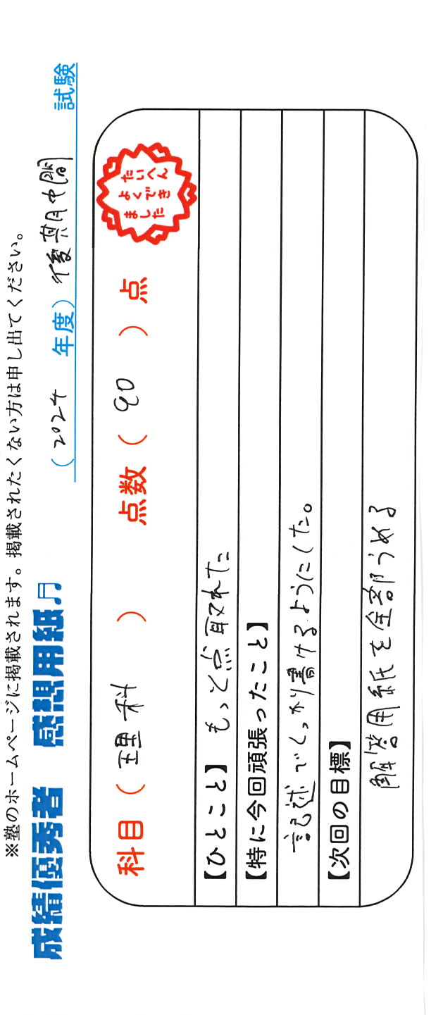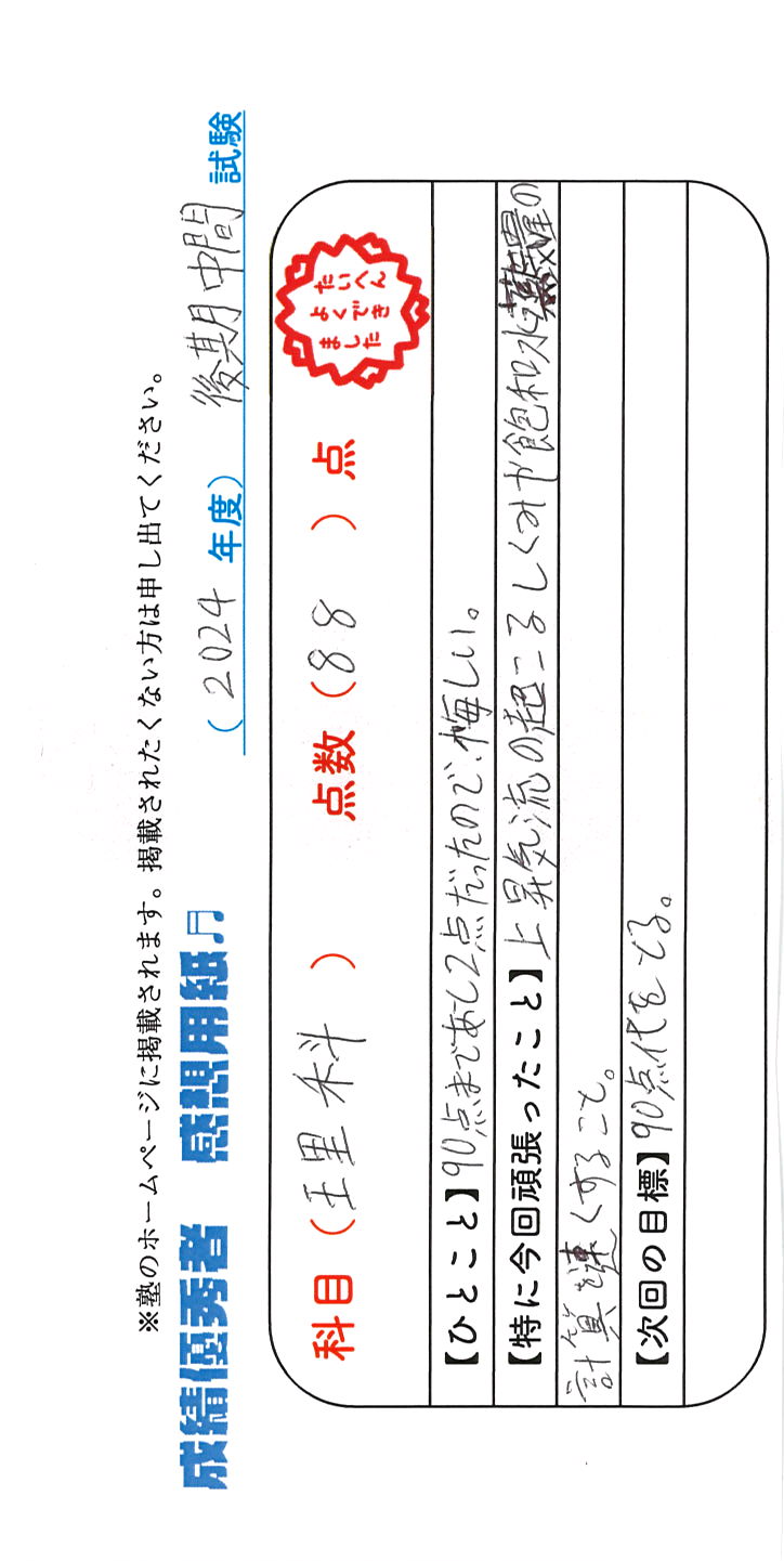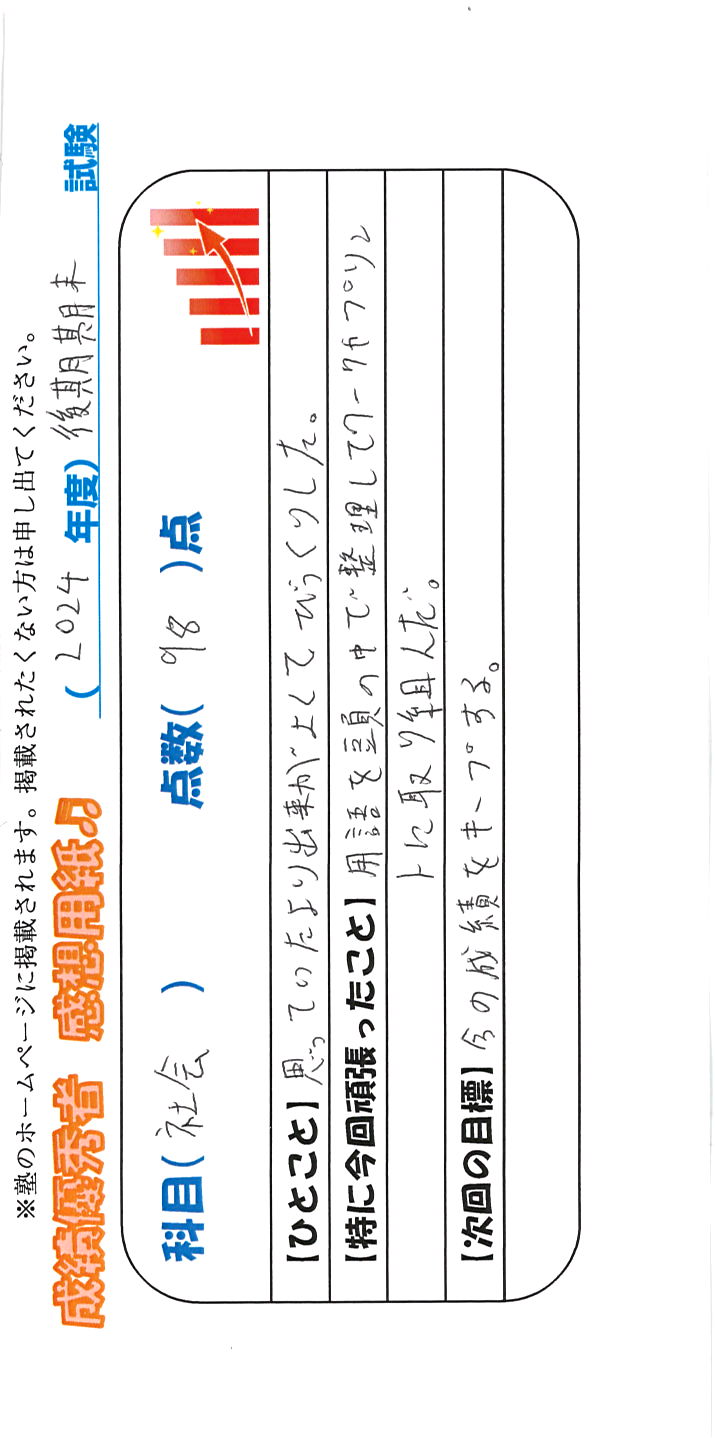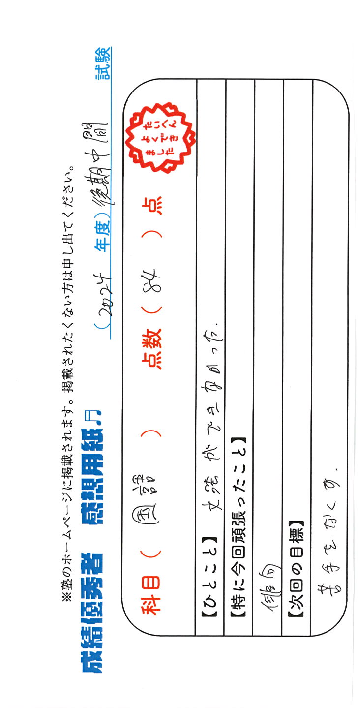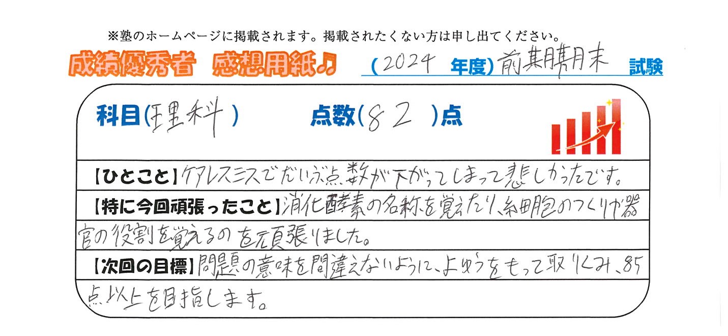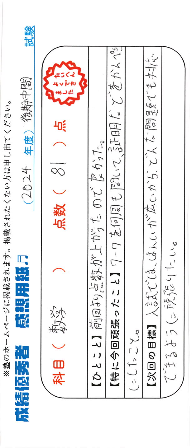 定期試験で優秀な成績を取った生徒さんのメッセージです。