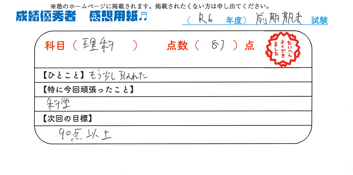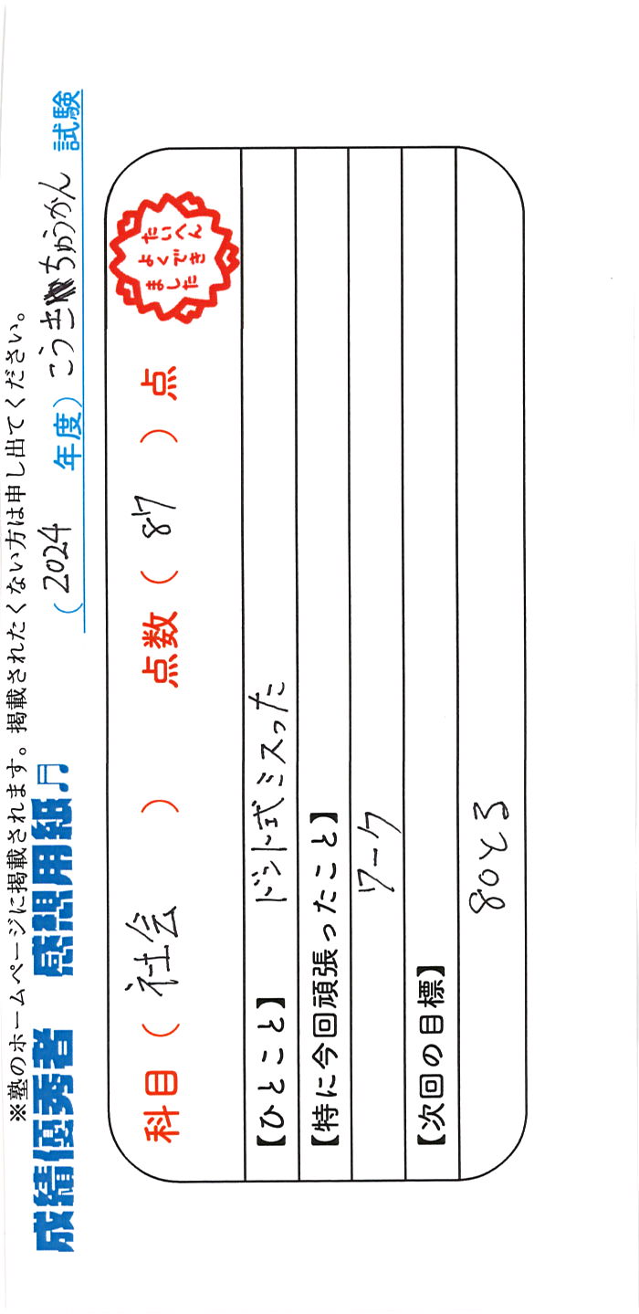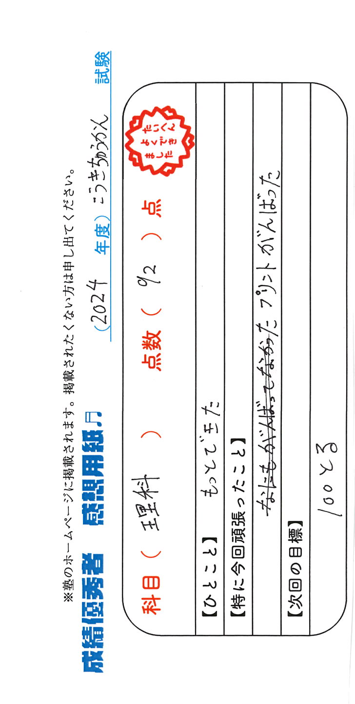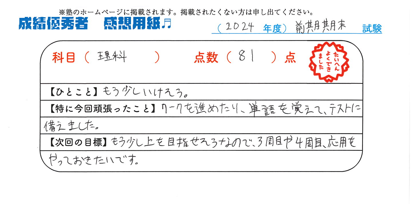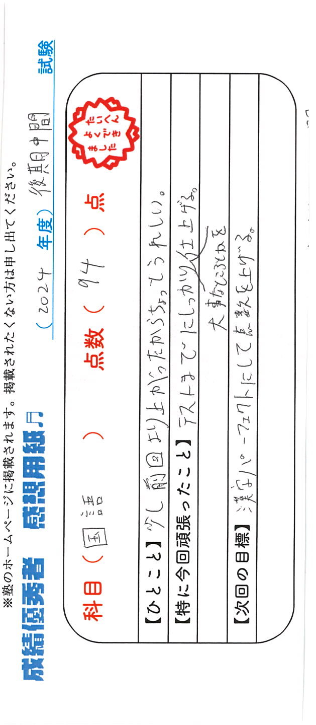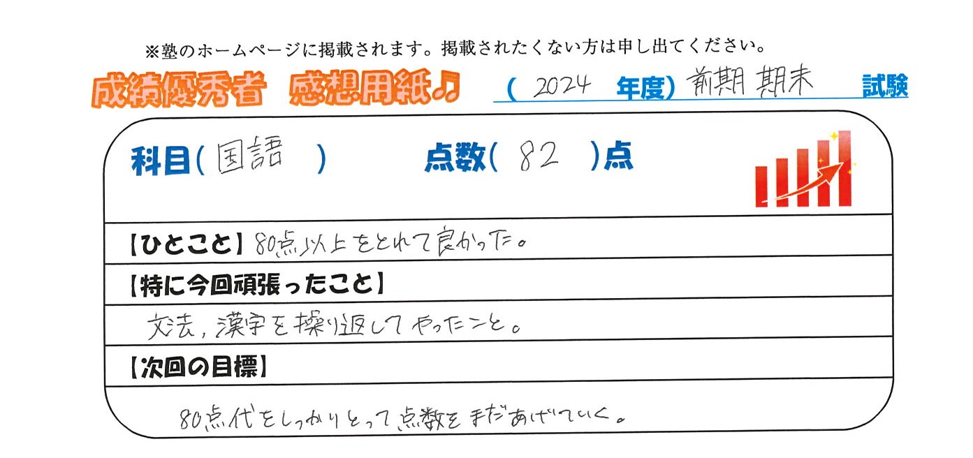 定期試験で優秀な成績を取った生徒さんのメッセージです。