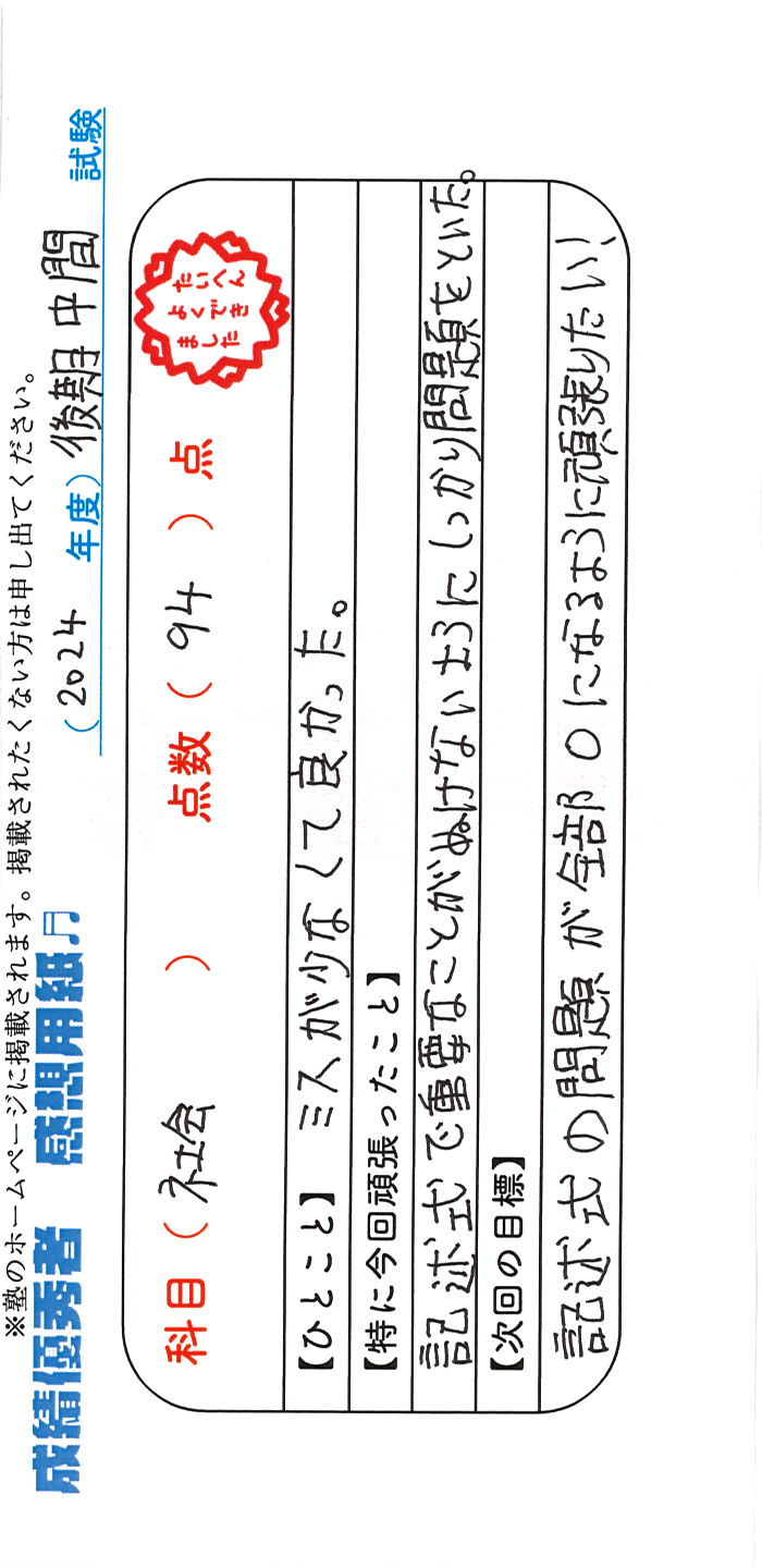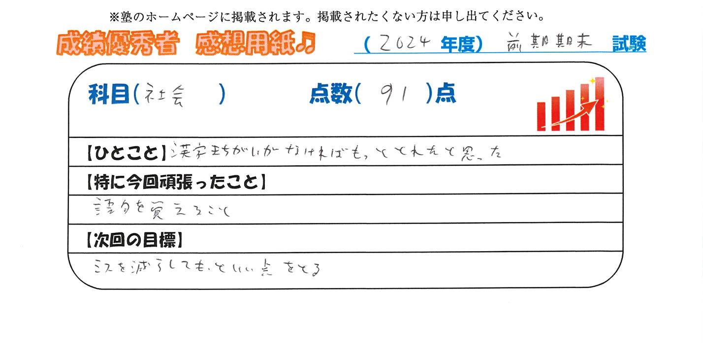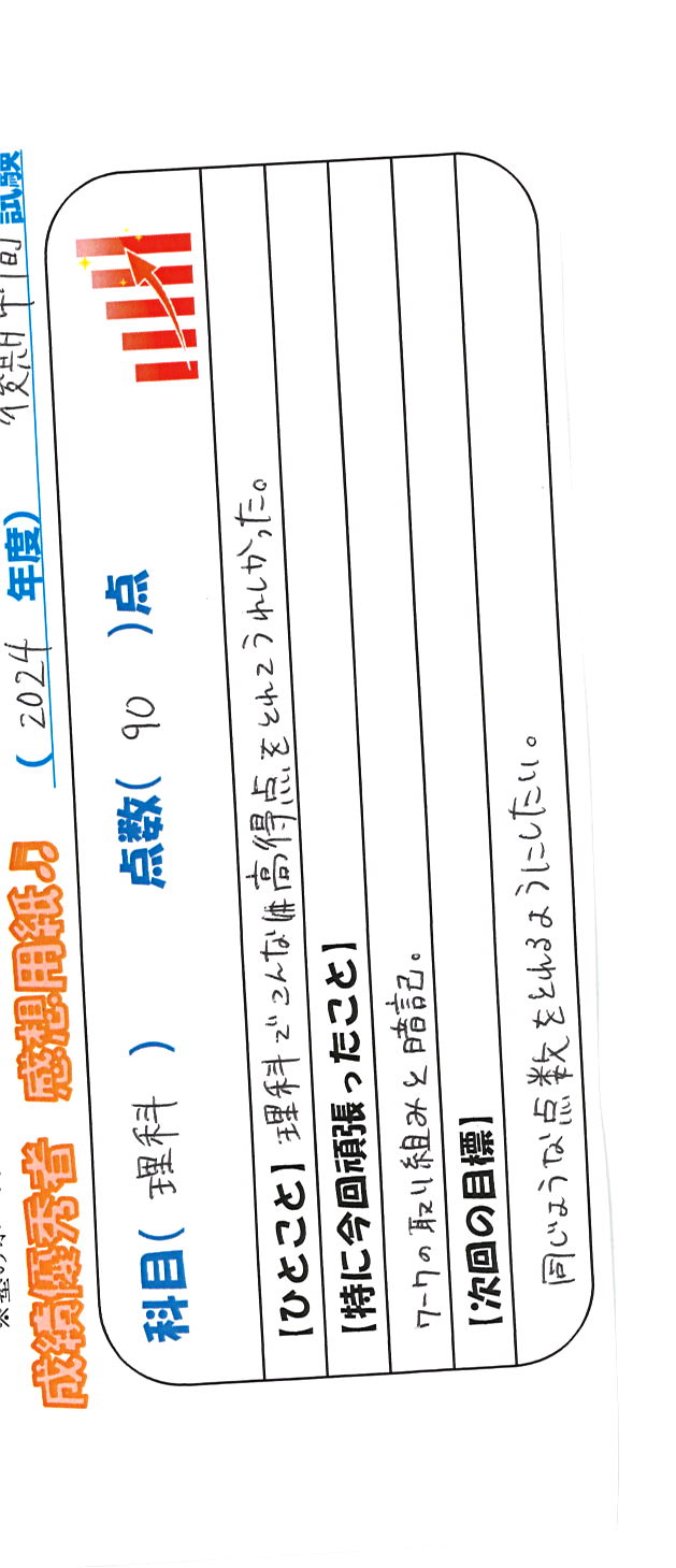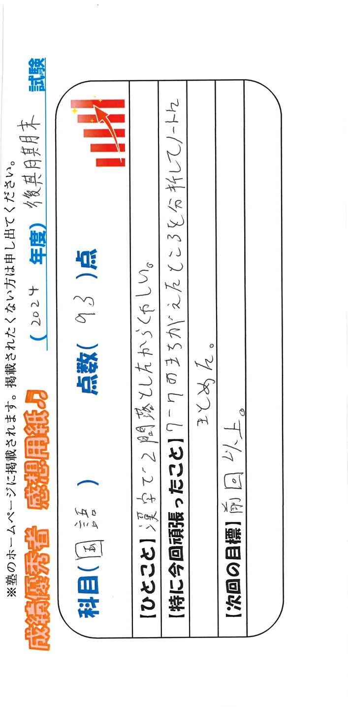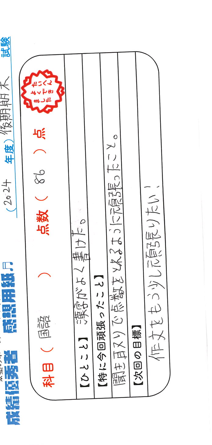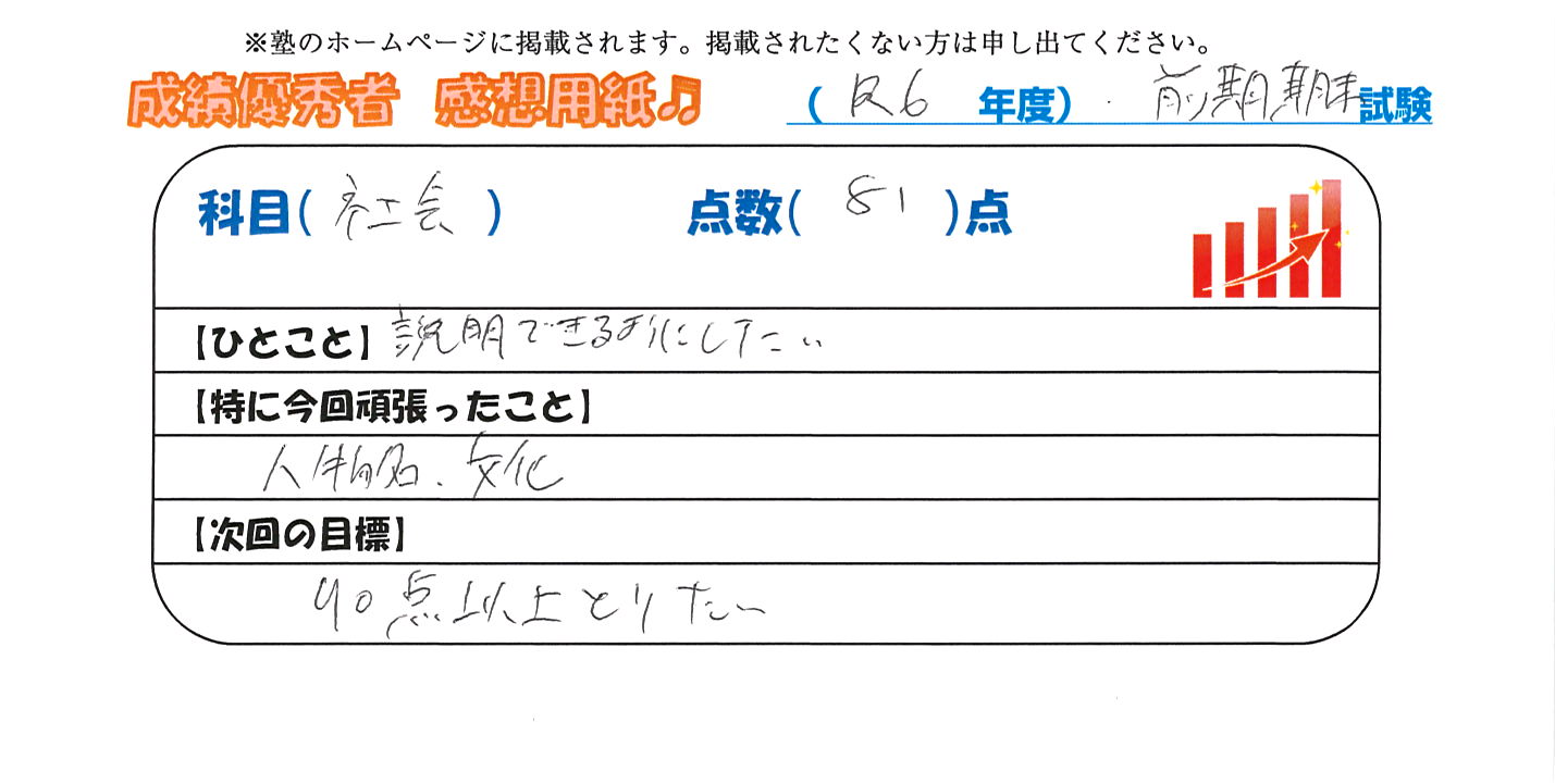 定期試験で優秀な成績を取った生徒さんのメッセージです。
