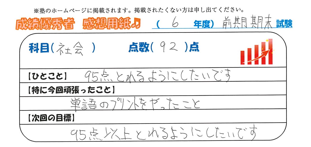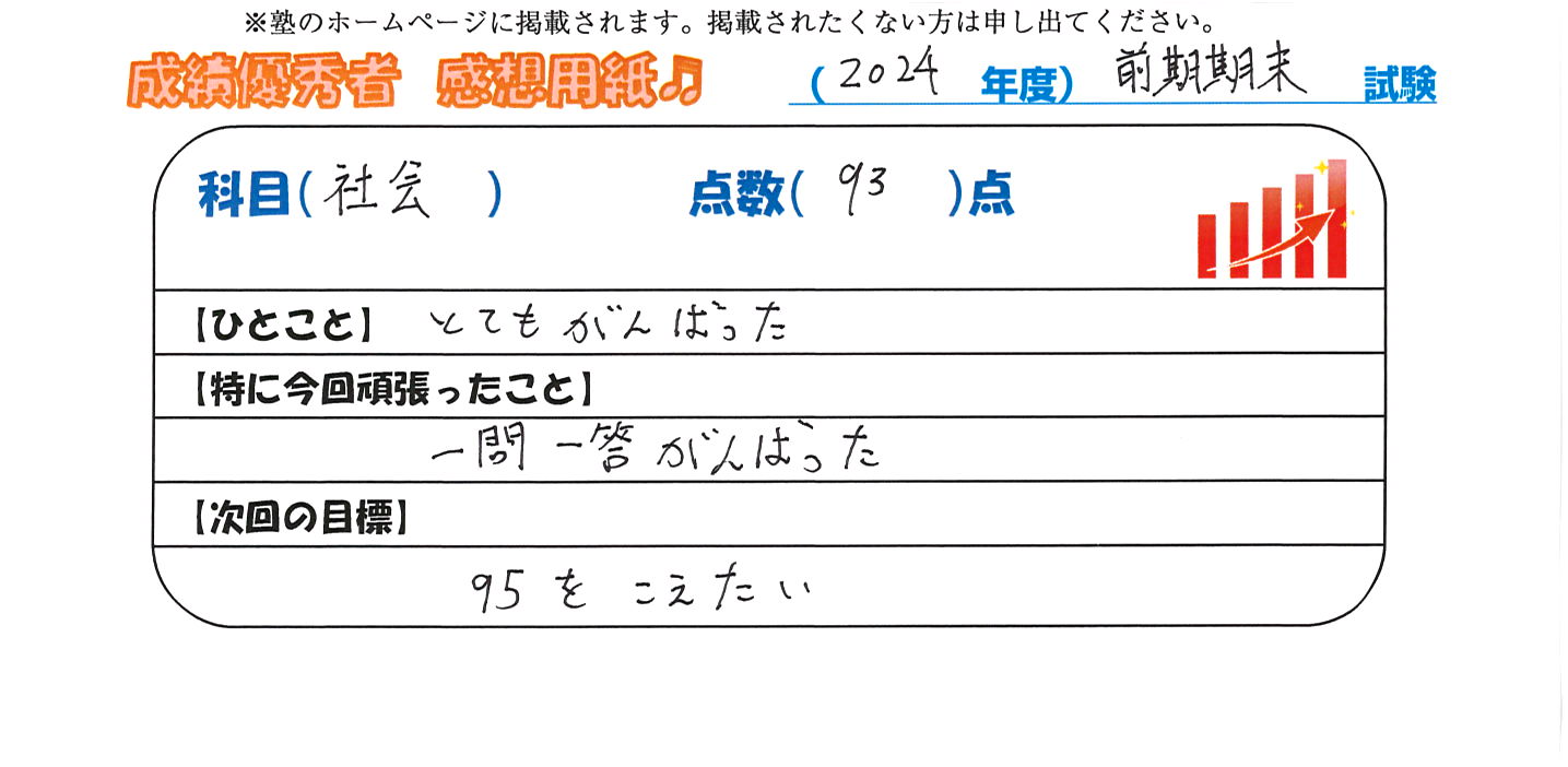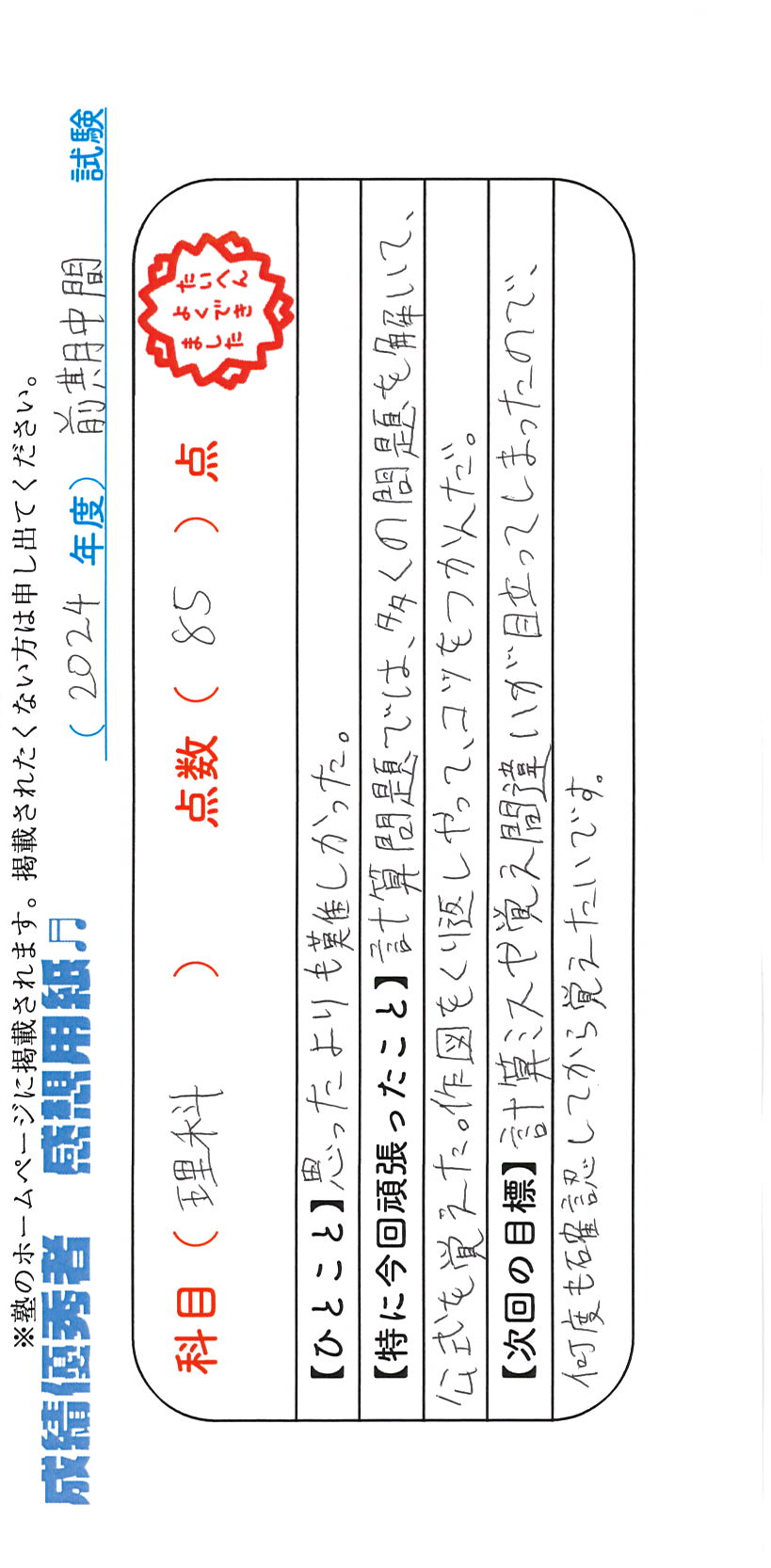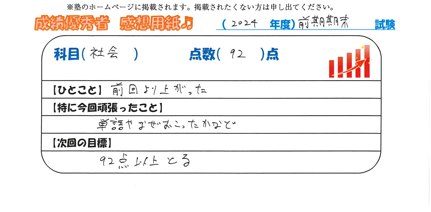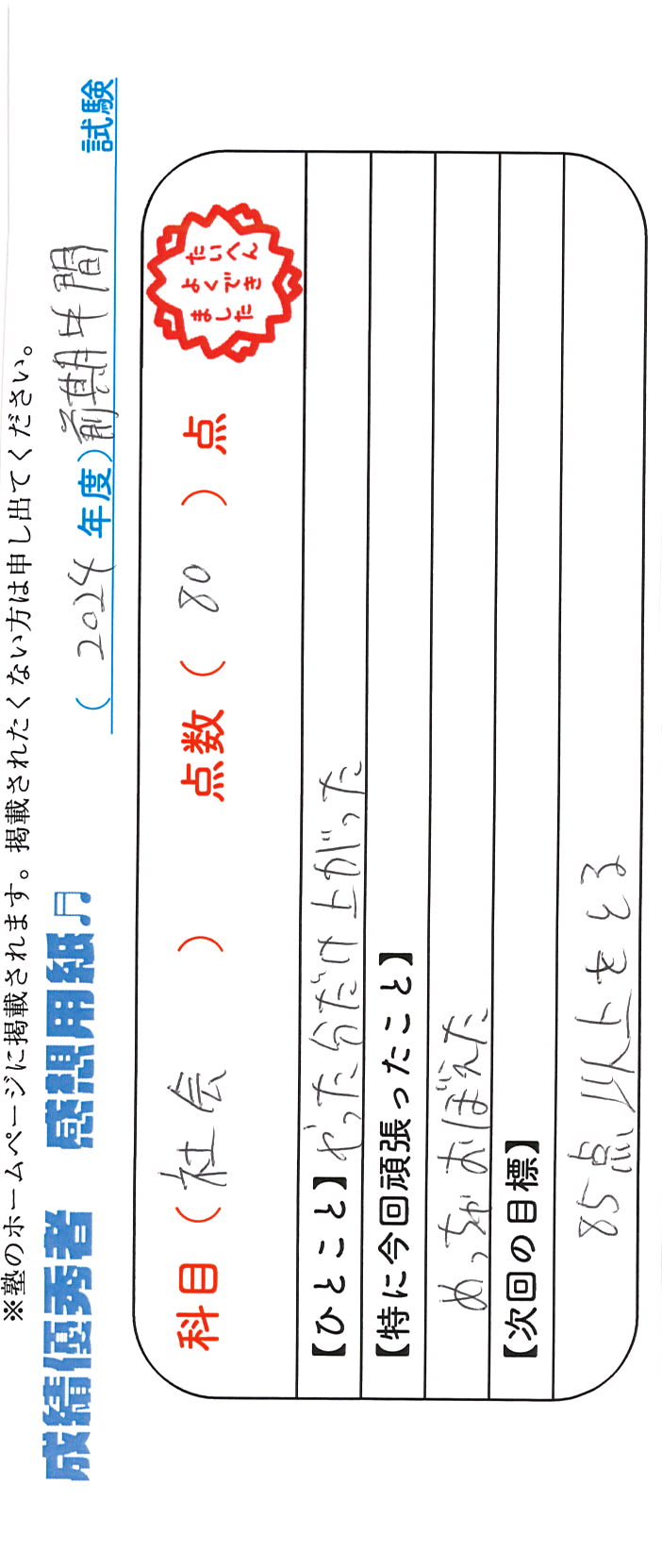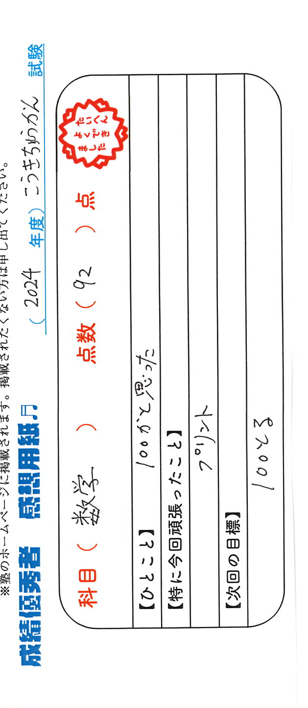 定期試験で優秀な成績を取った生徒さんのメッセージです。