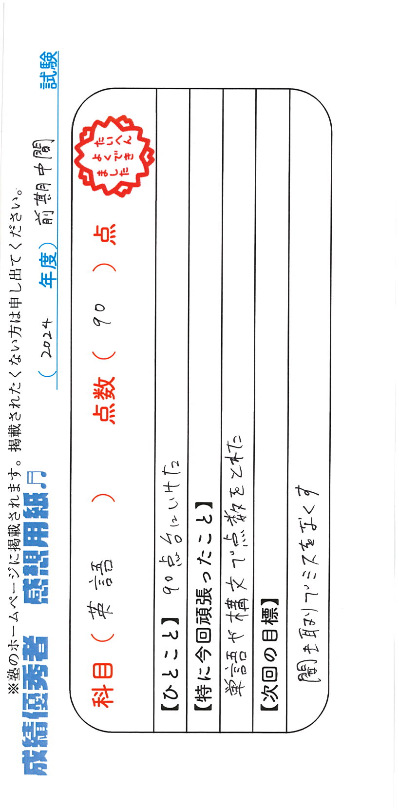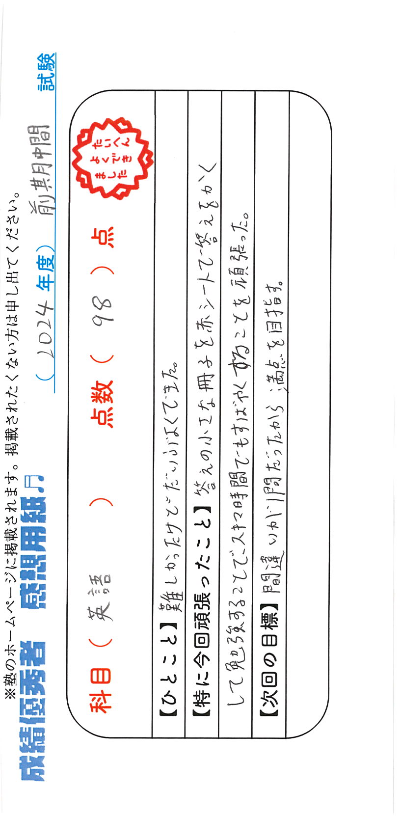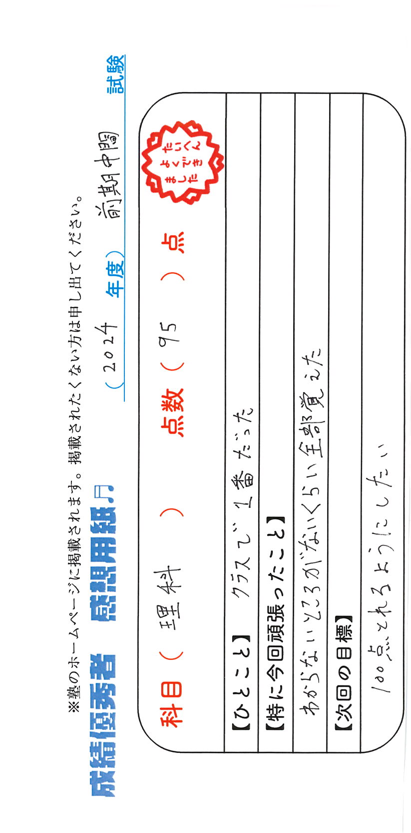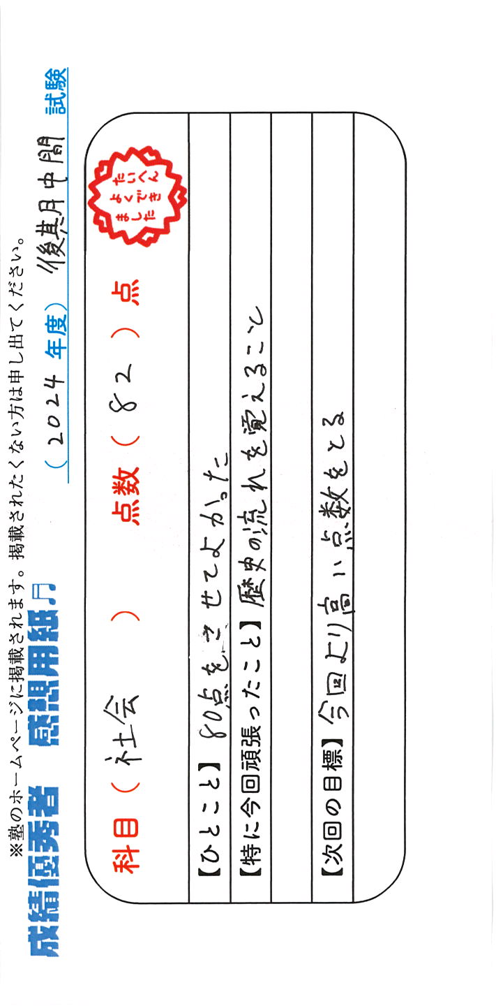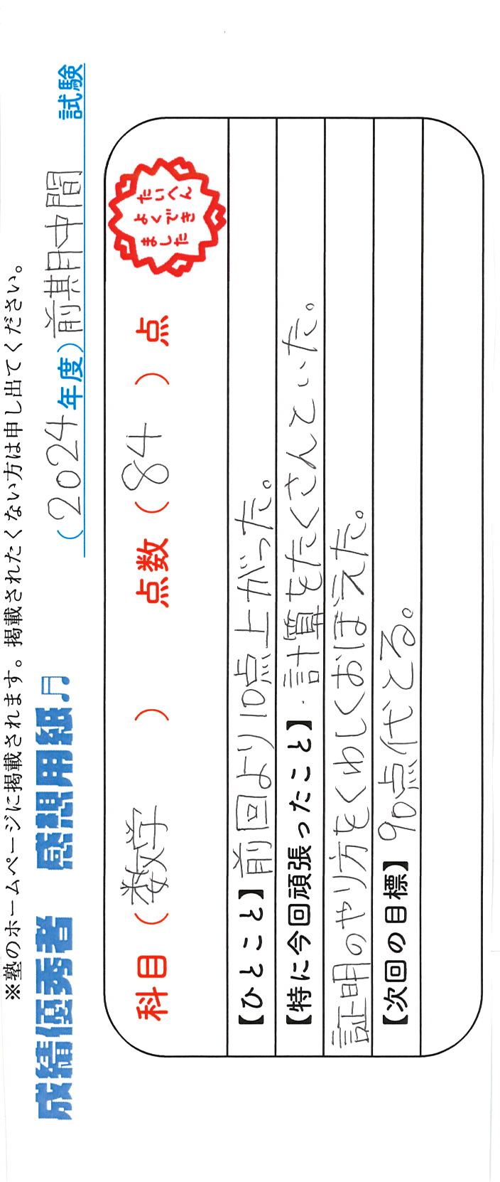 定期試験で優秀な成績を取った生徒さんのメッセージです。