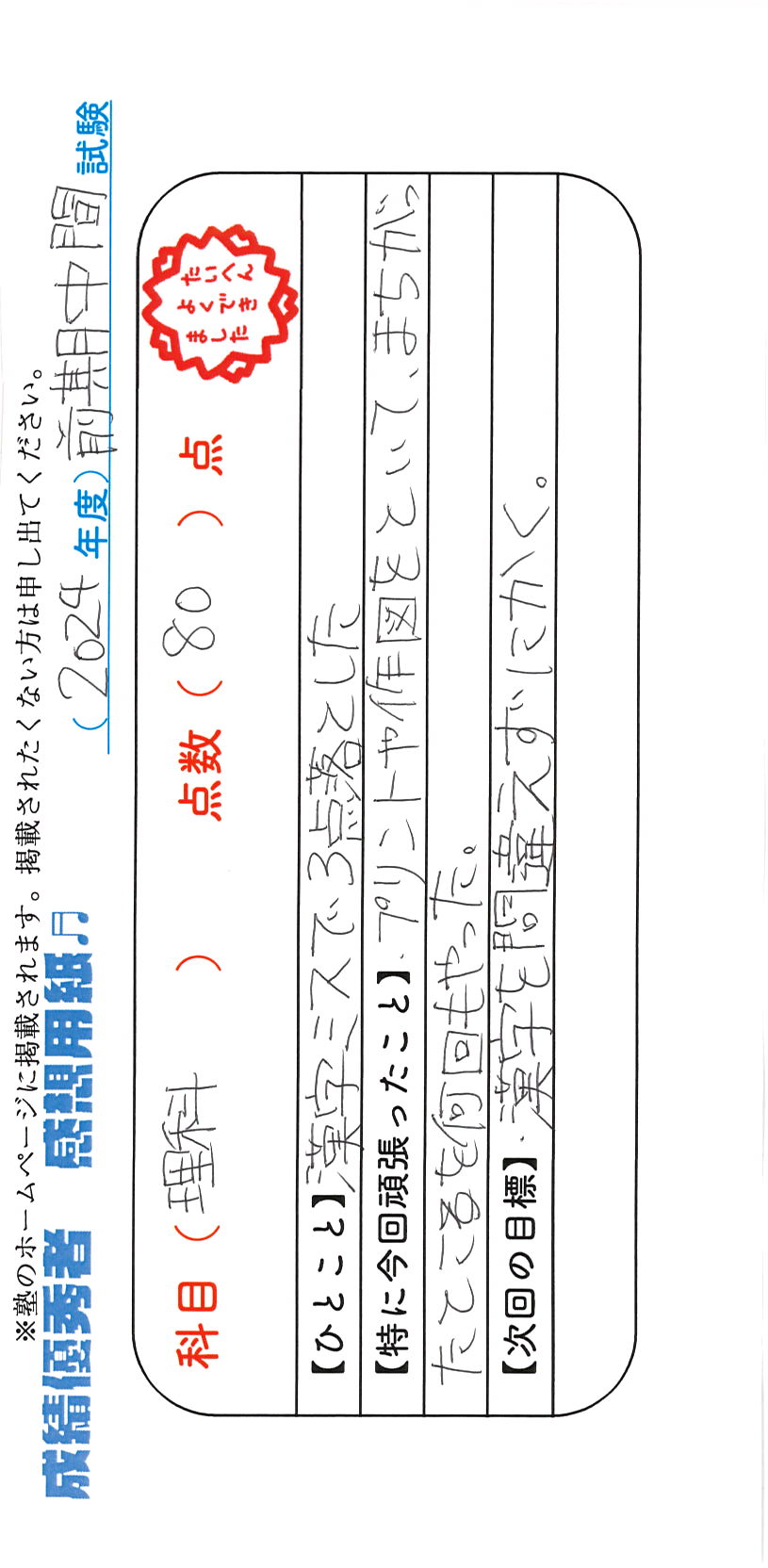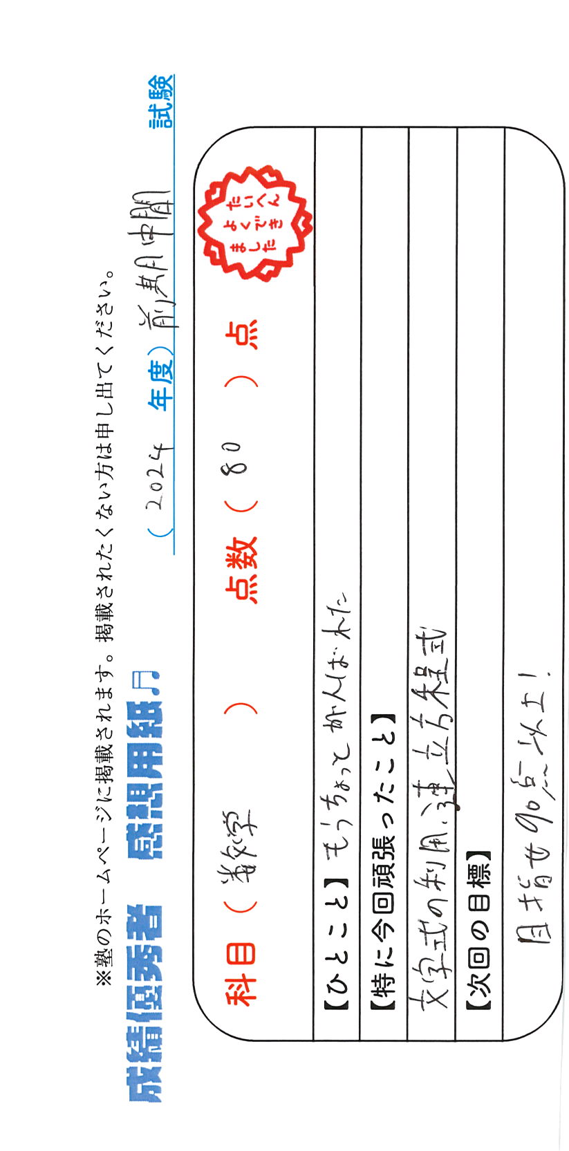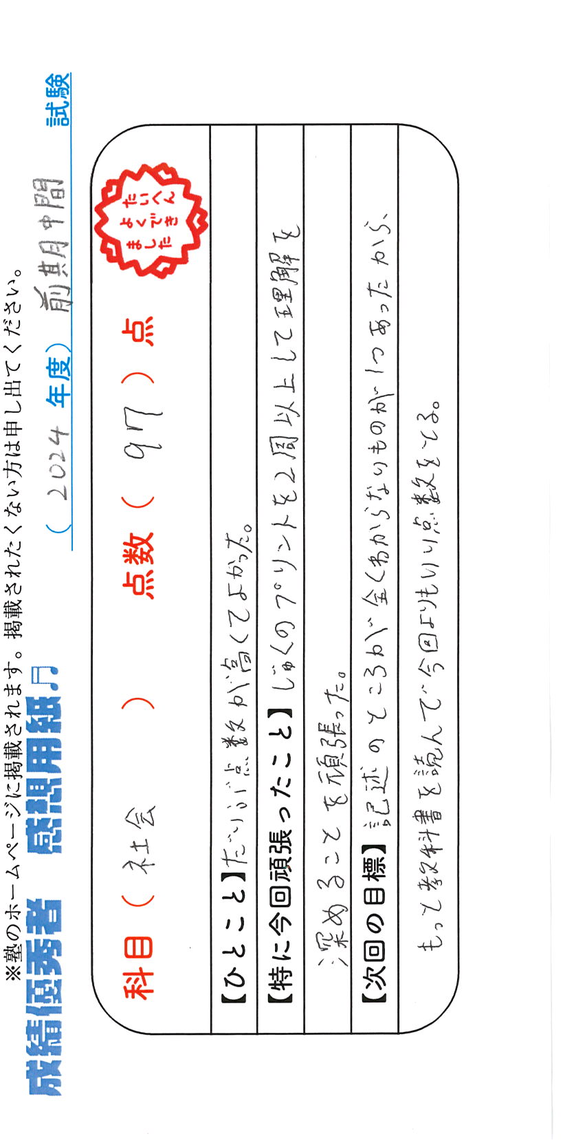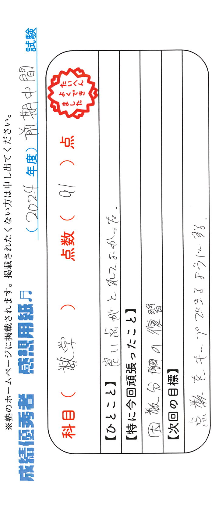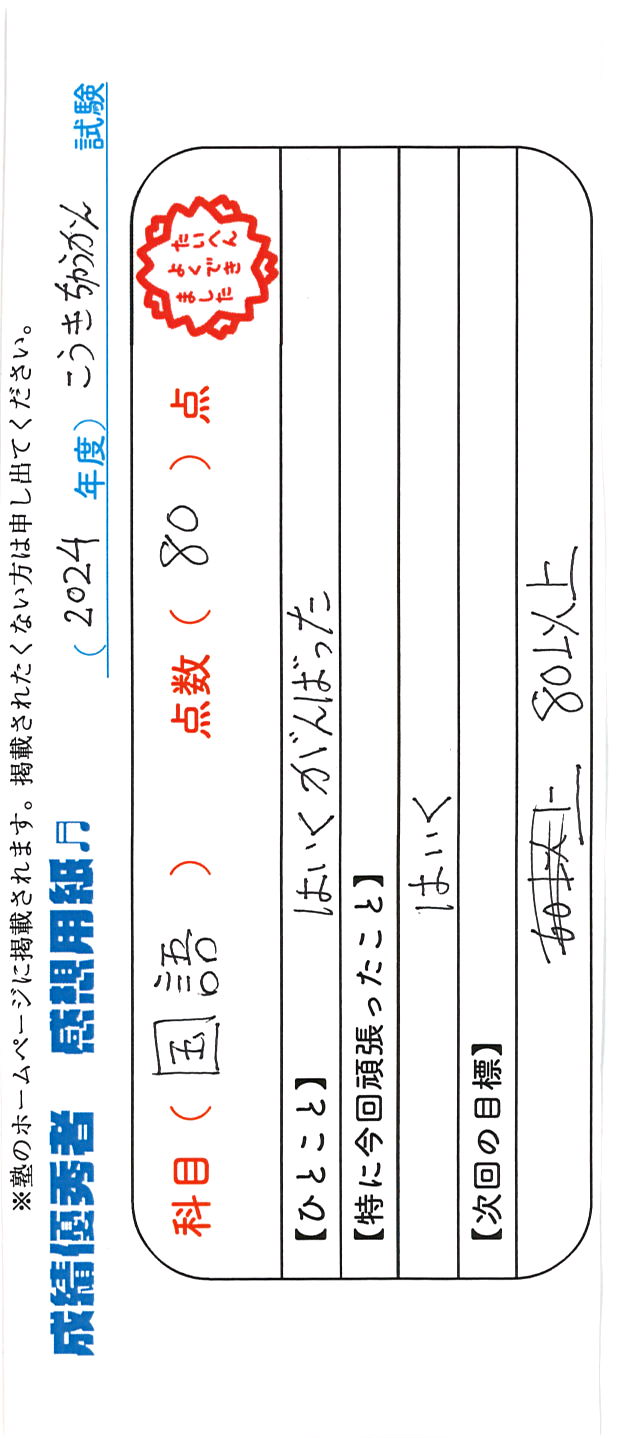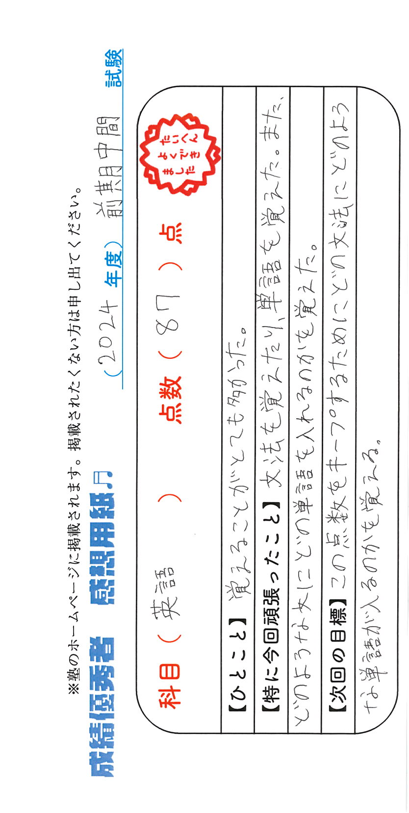 定期試験で優秀な成績を取った生徒さんのメッセージです。