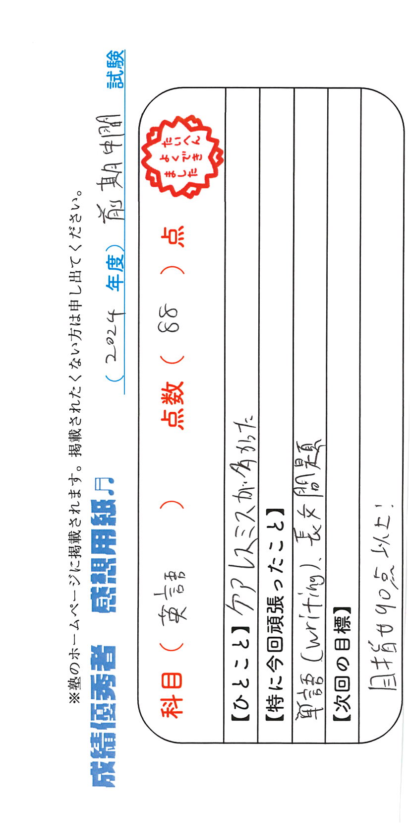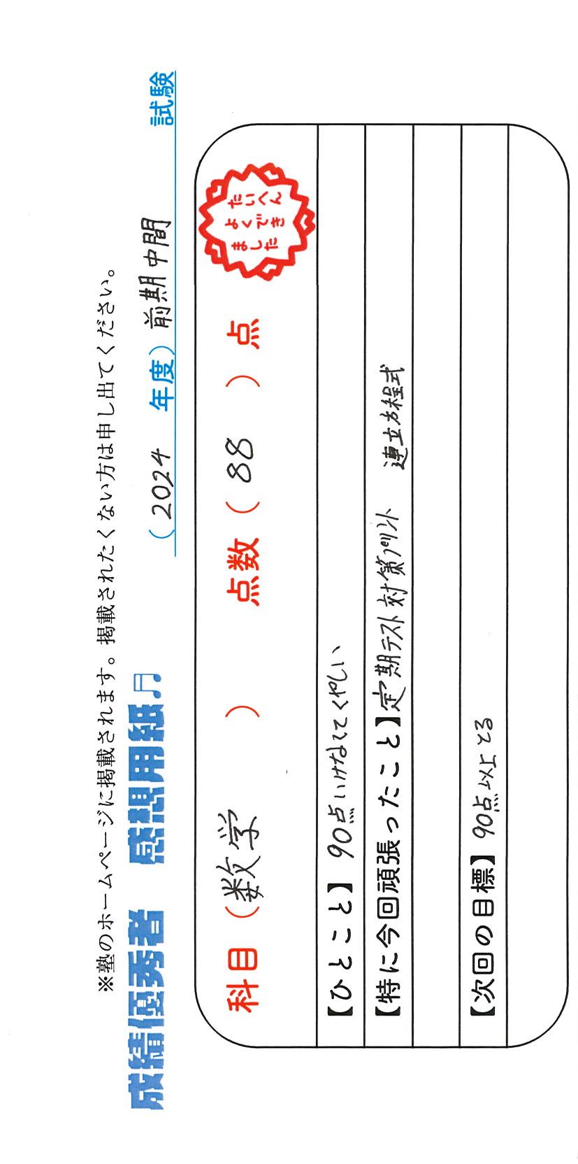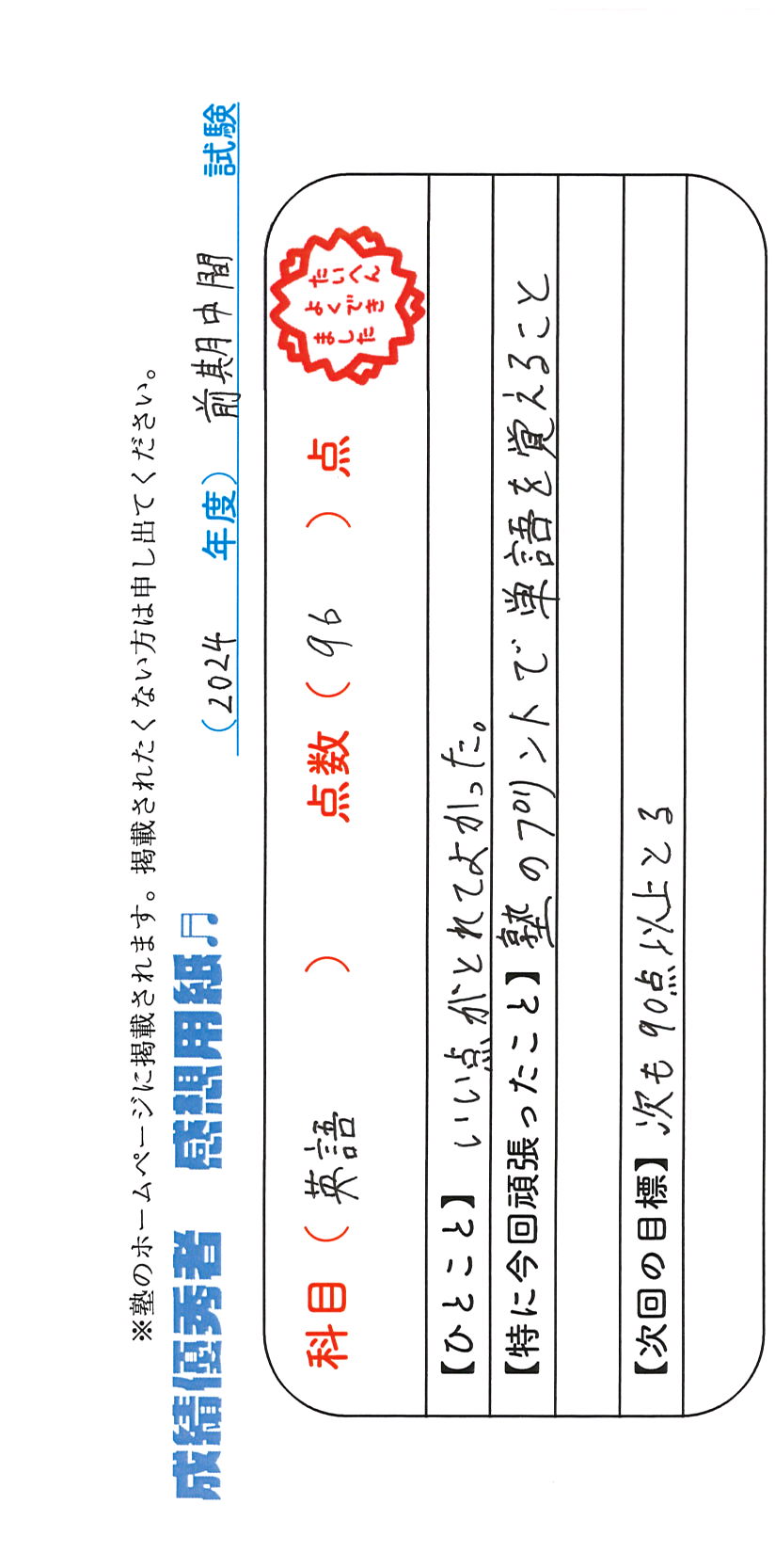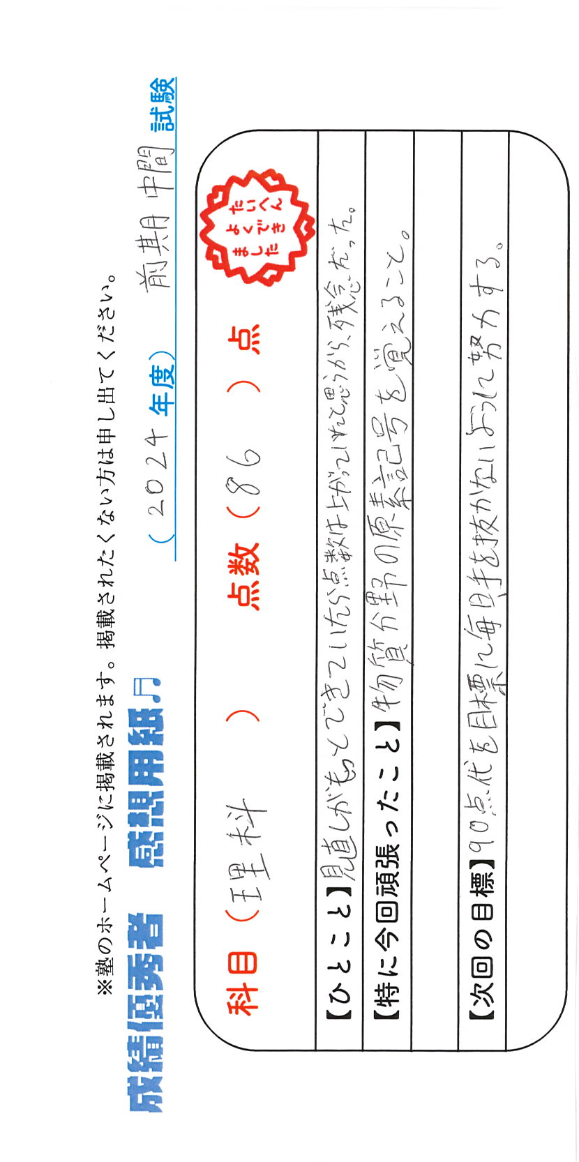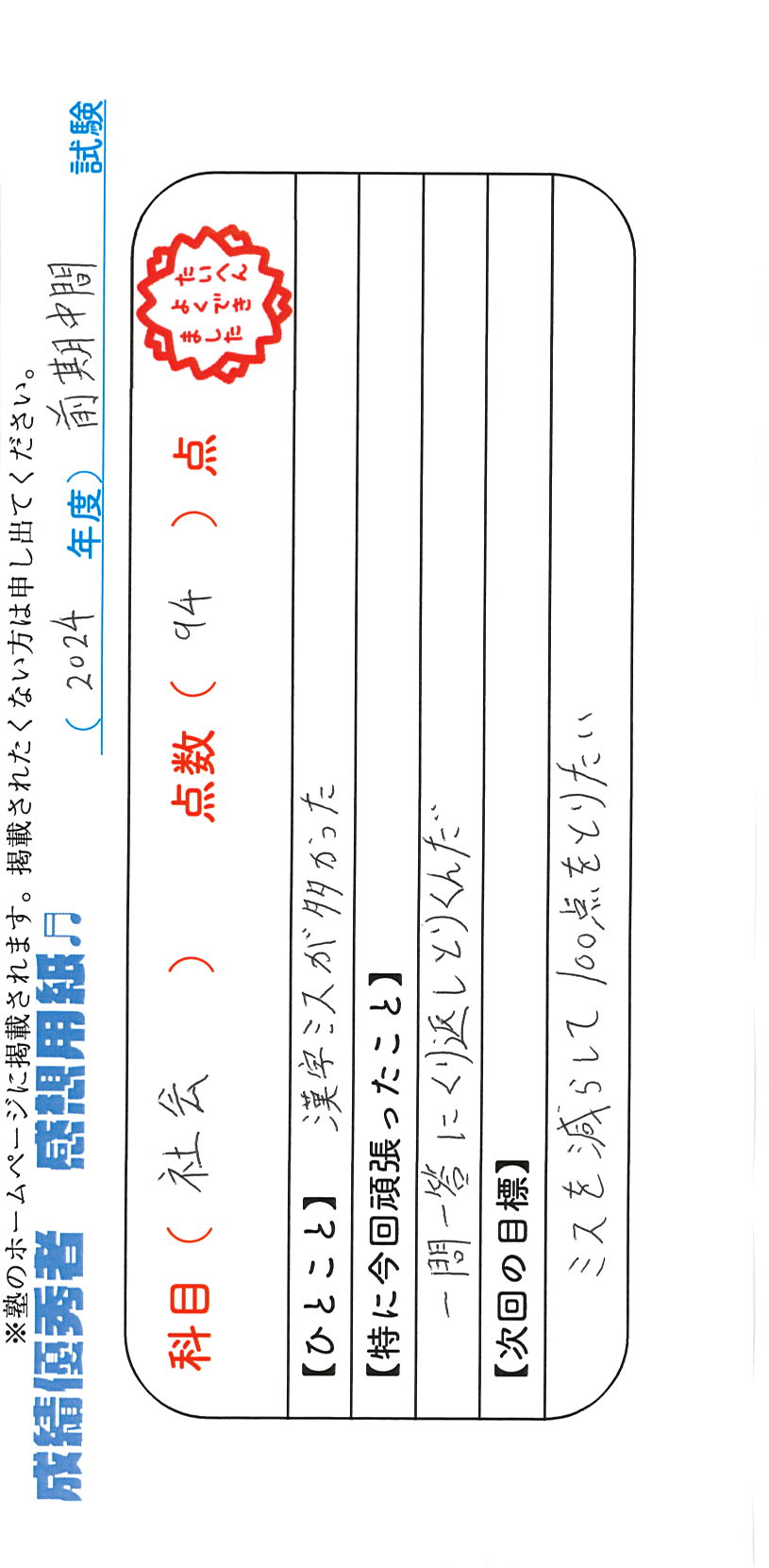 定期試験で優秀な成績を取った生徒さんのメッセージです。