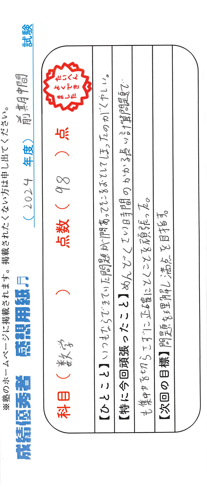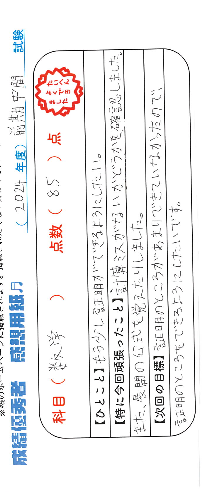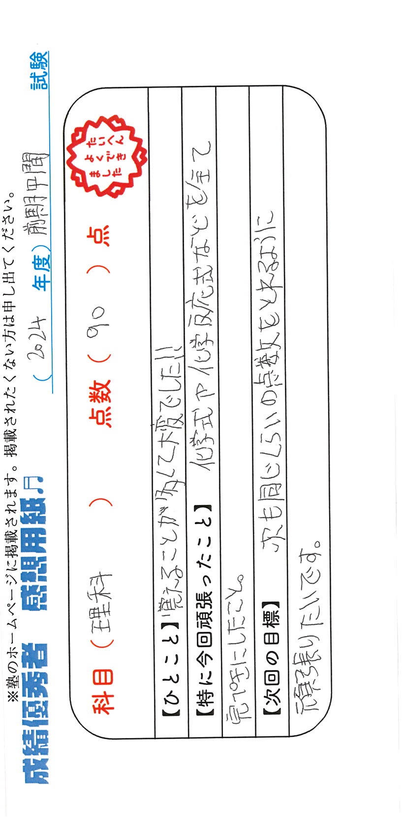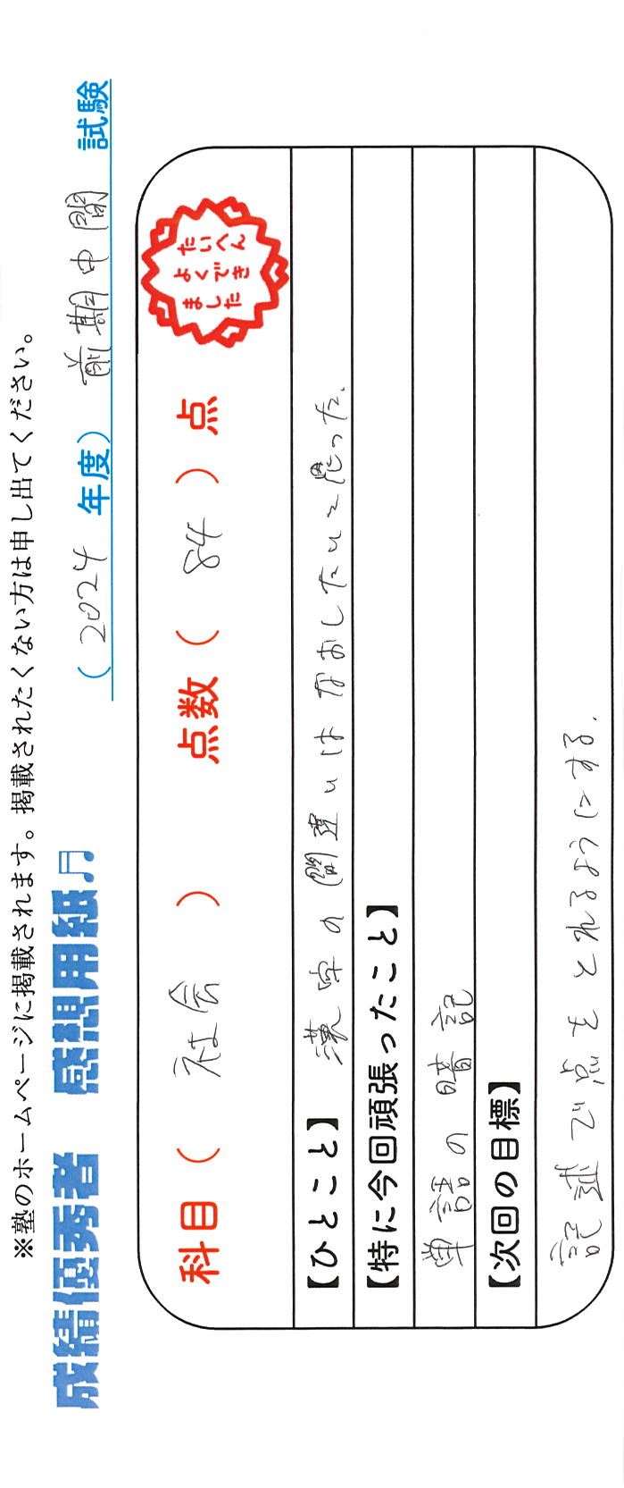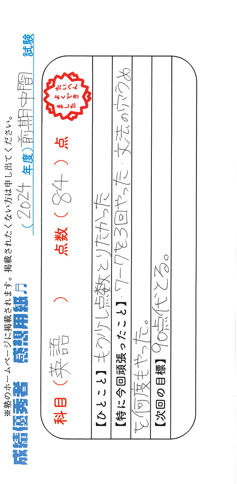 定期試験で優秀な成績を取った生徒さんのメッセージです。