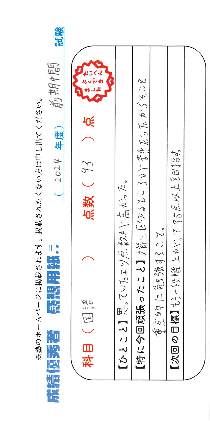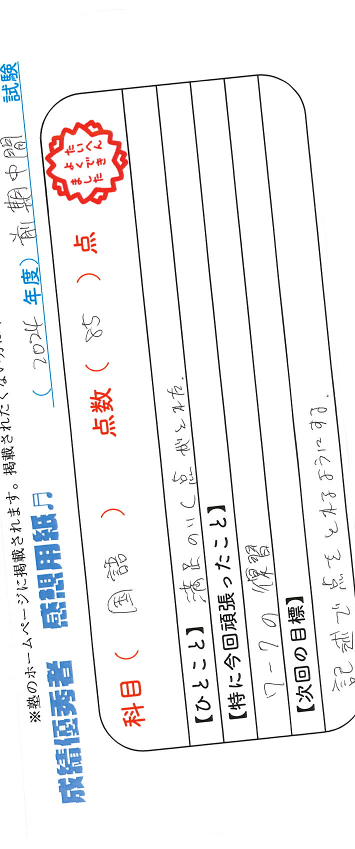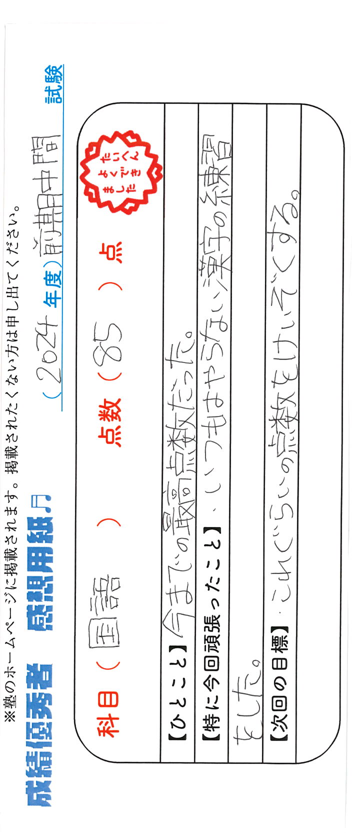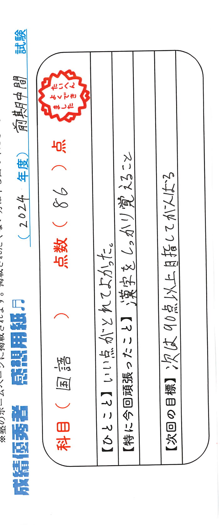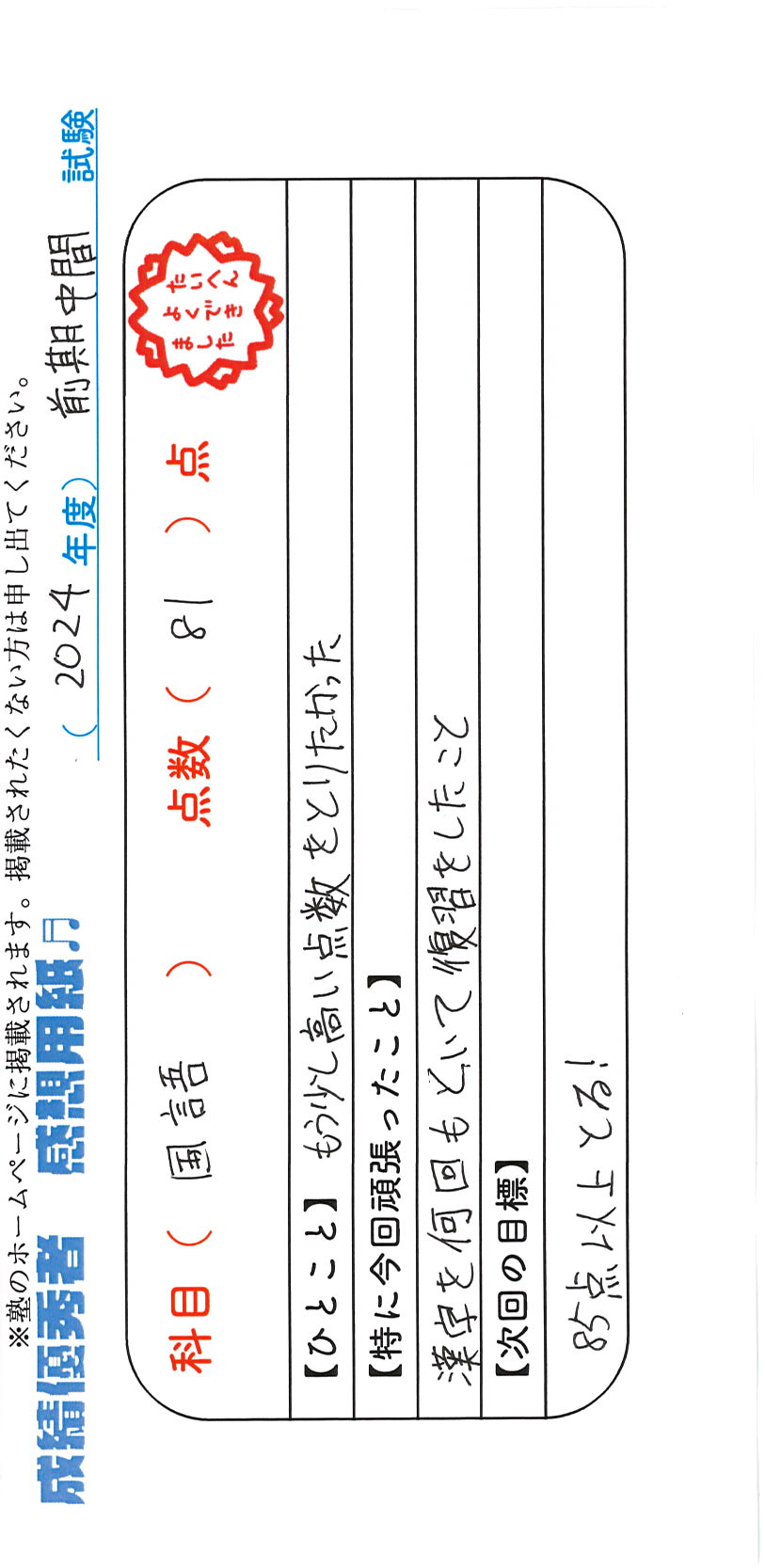 定期試験で優秀な成績を取った生徒さんのメッセージです。