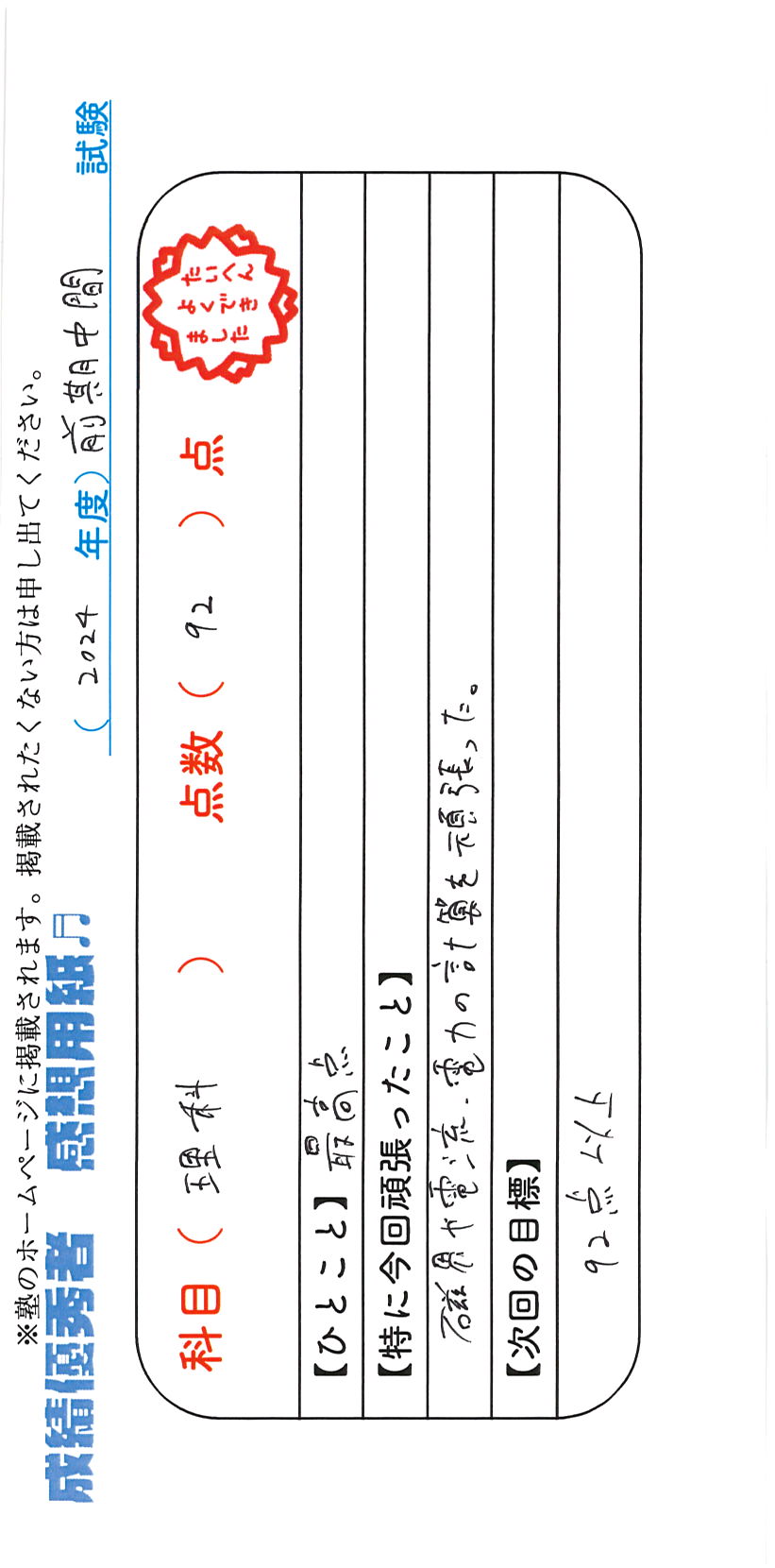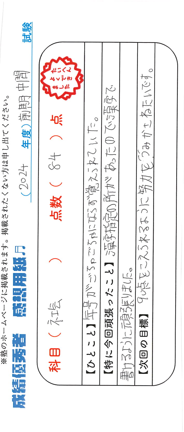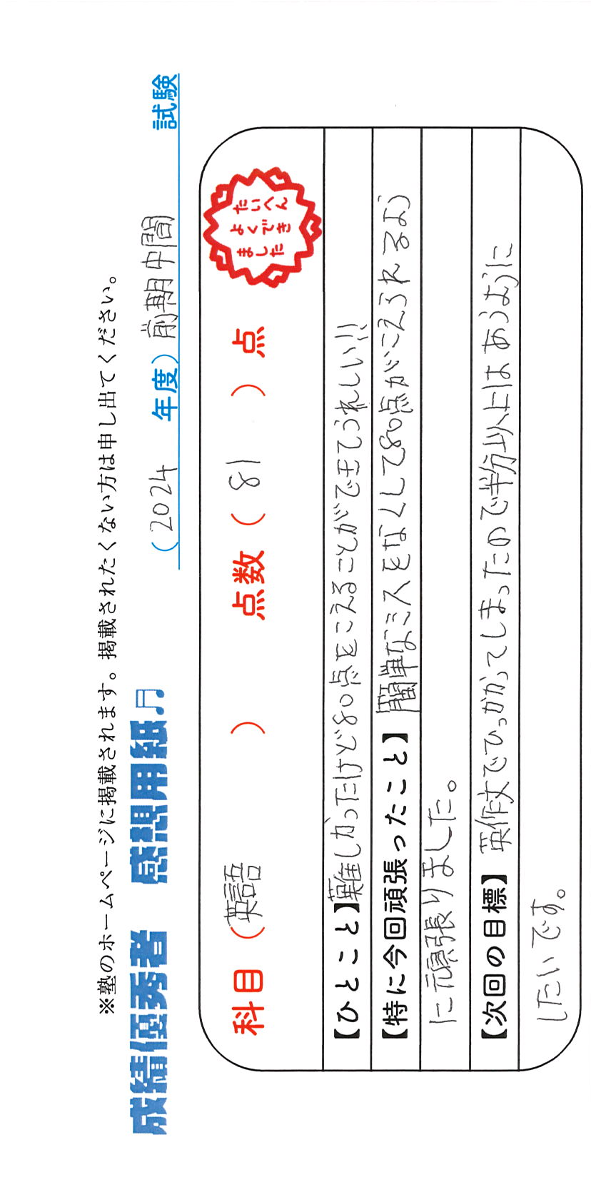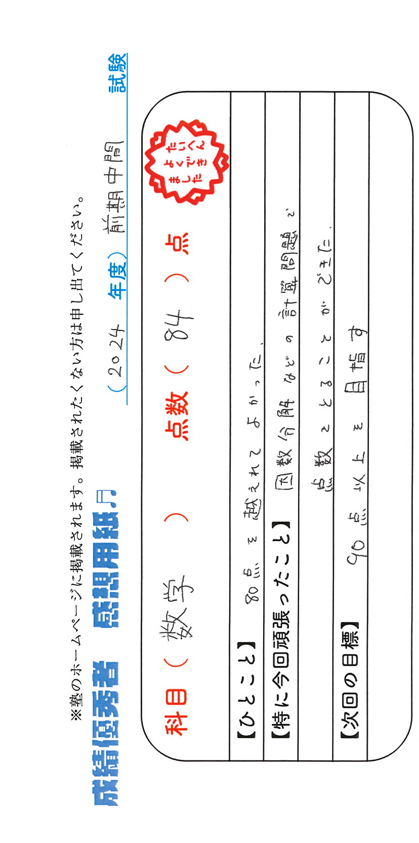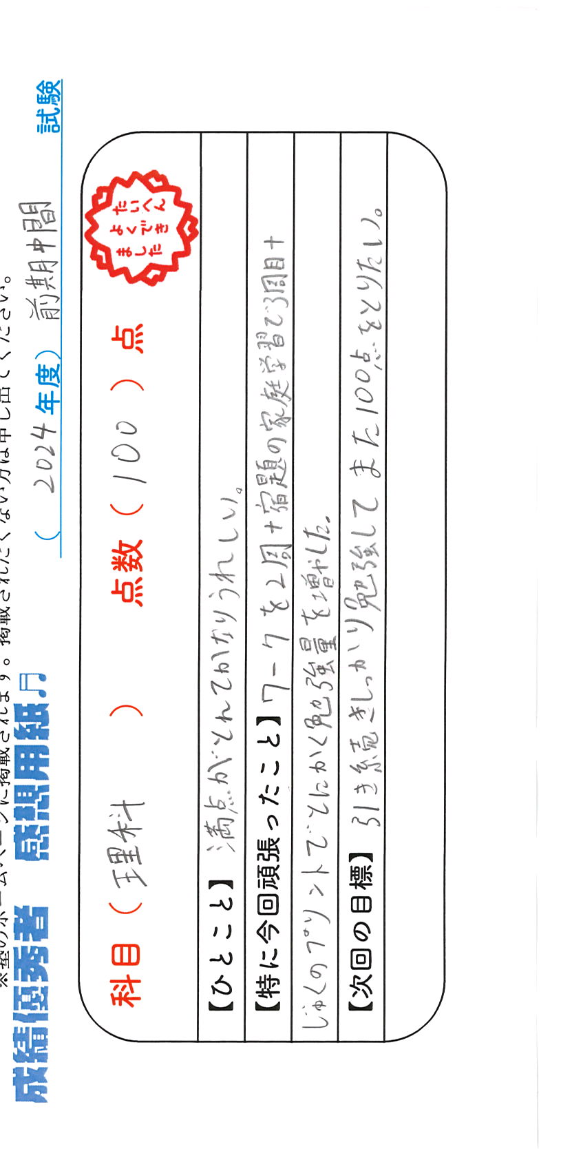 定期試験で優秀な成績を取った生徒さんのメッセージです。