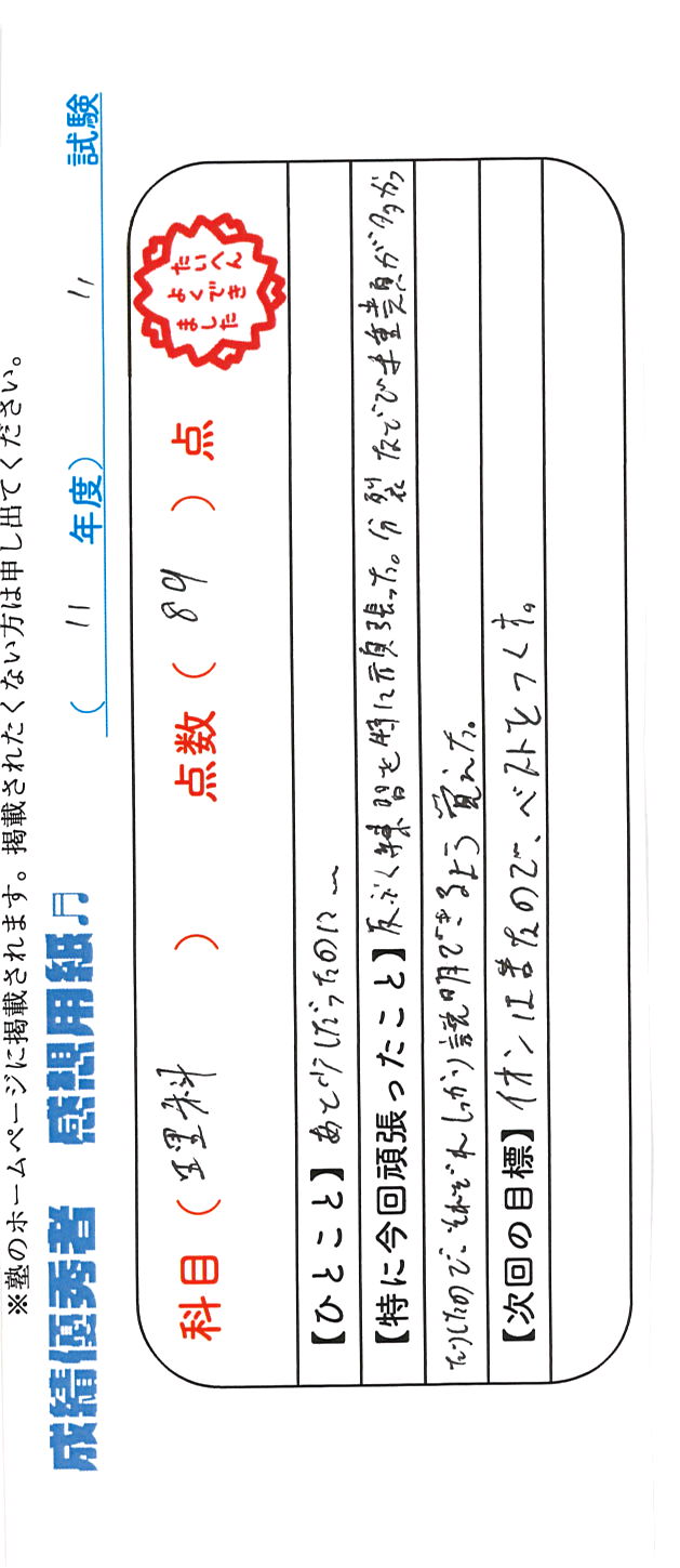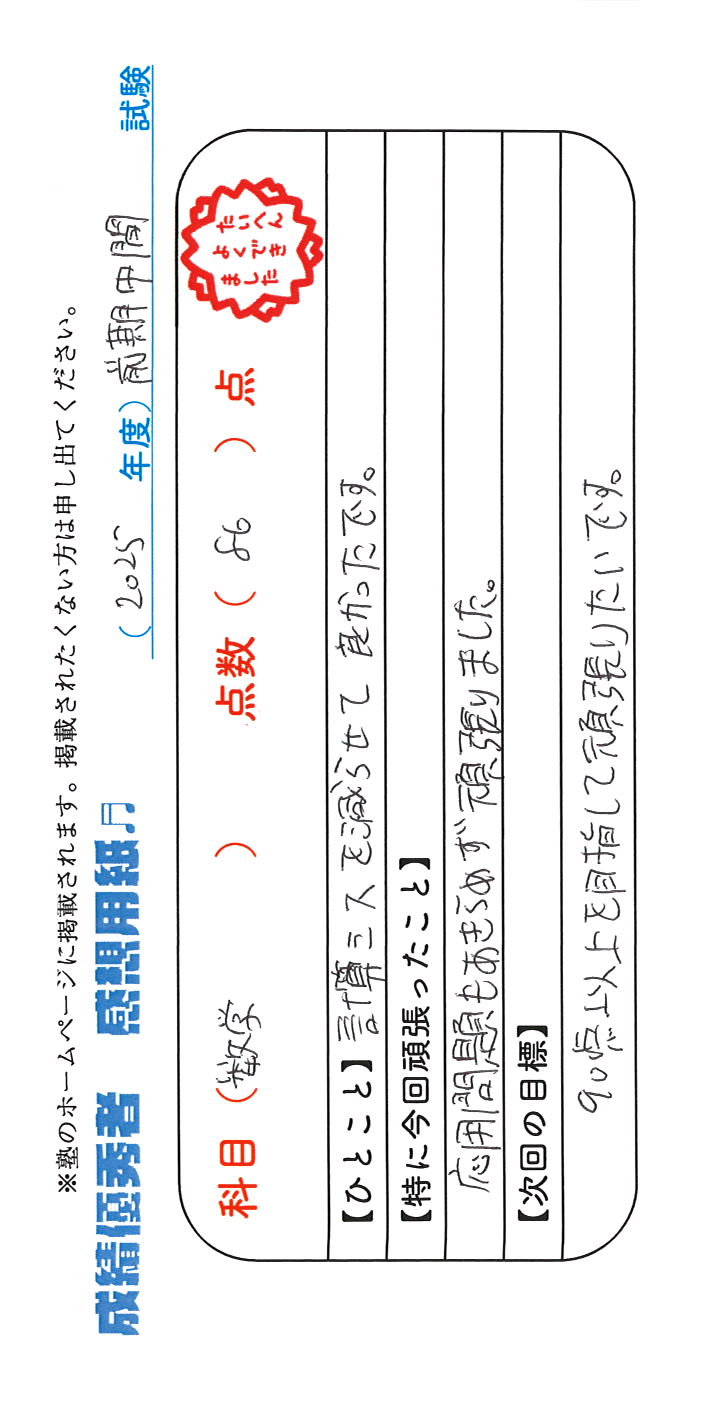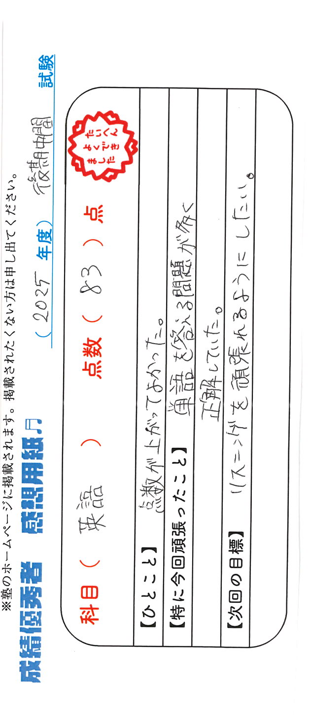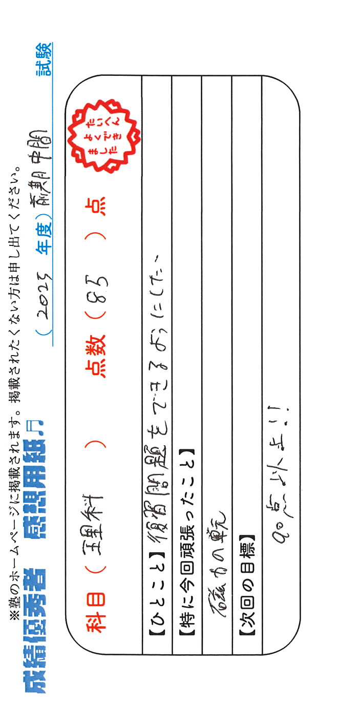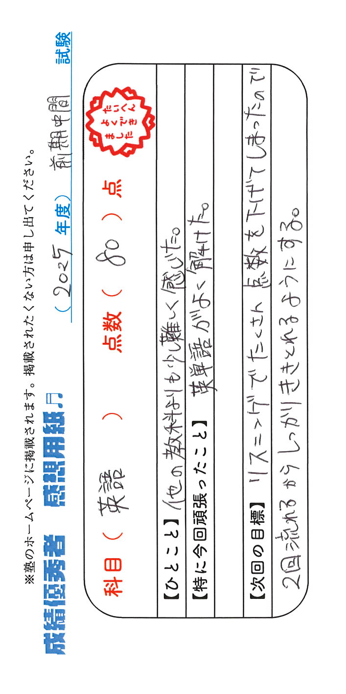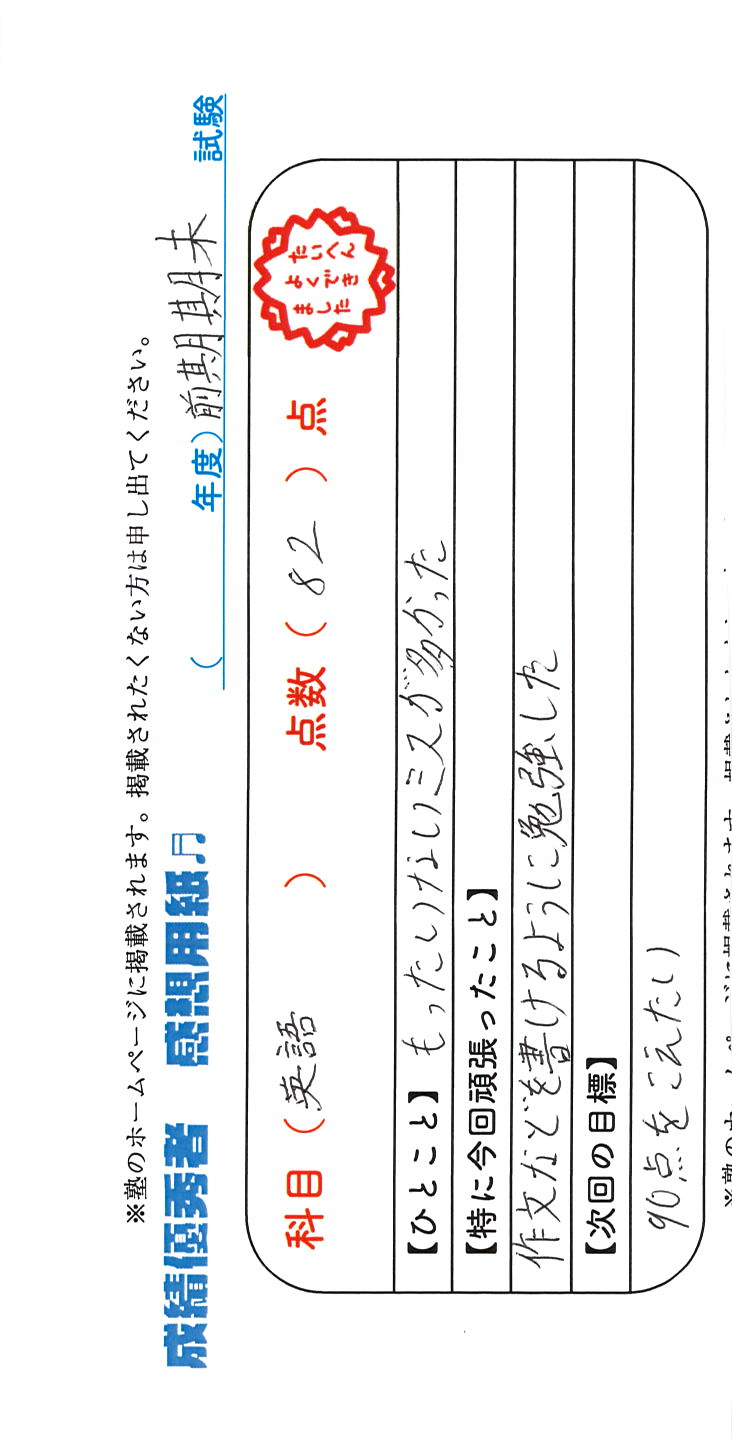 定期試験で優秀な成績を取った生徒さんのメッセージです。