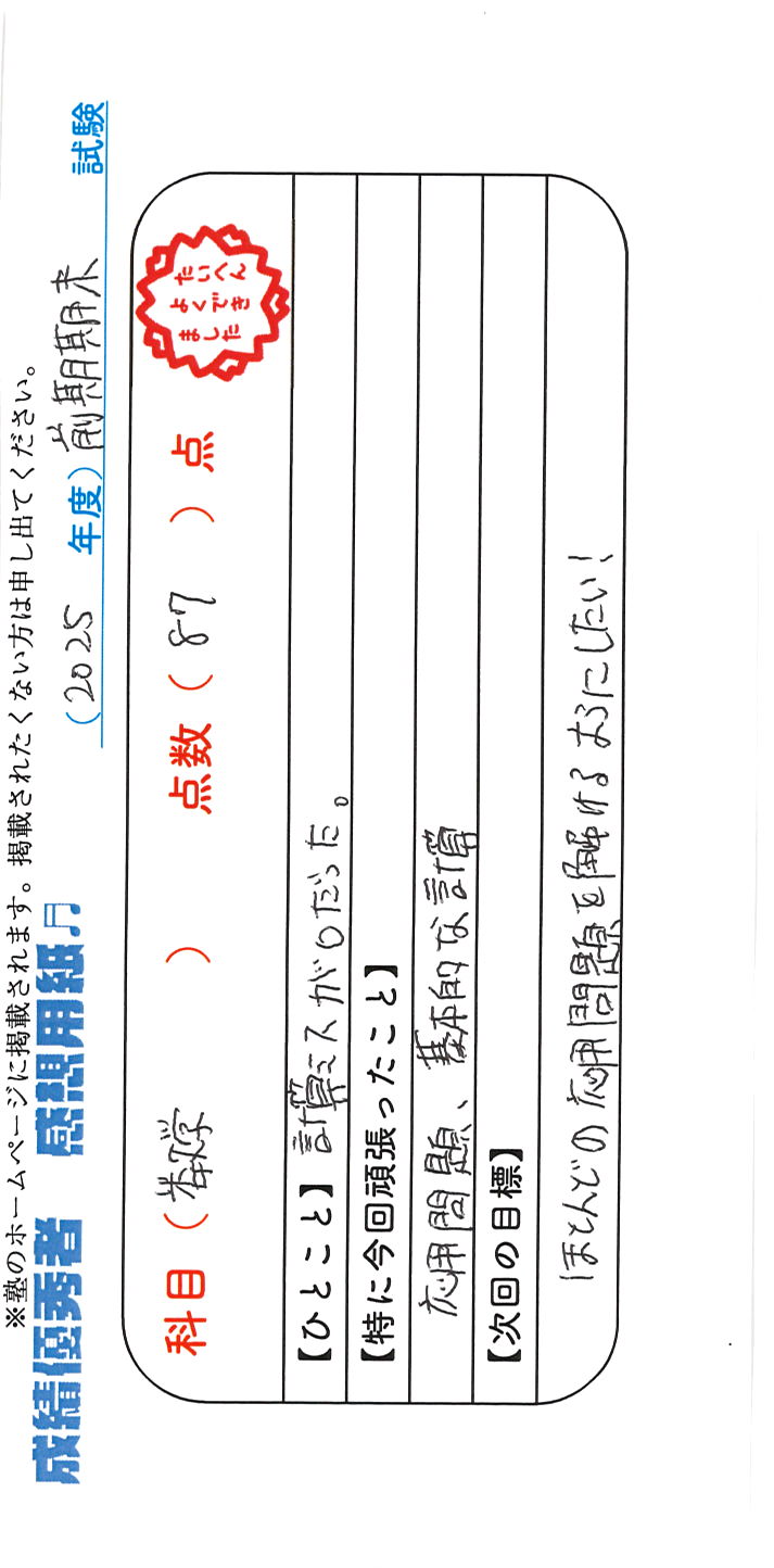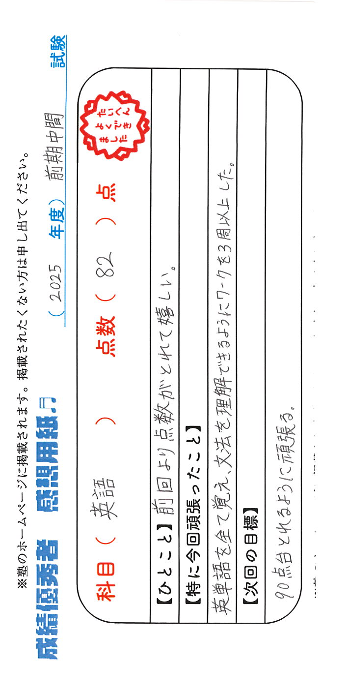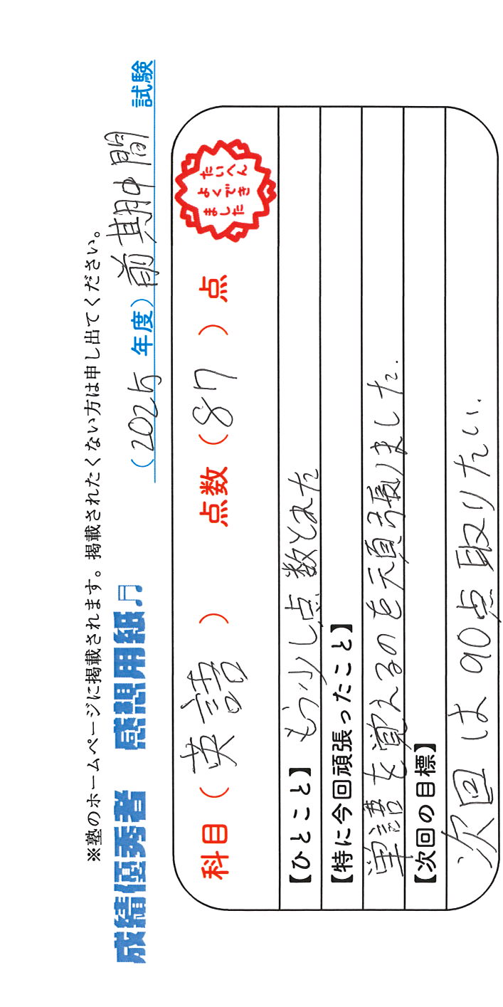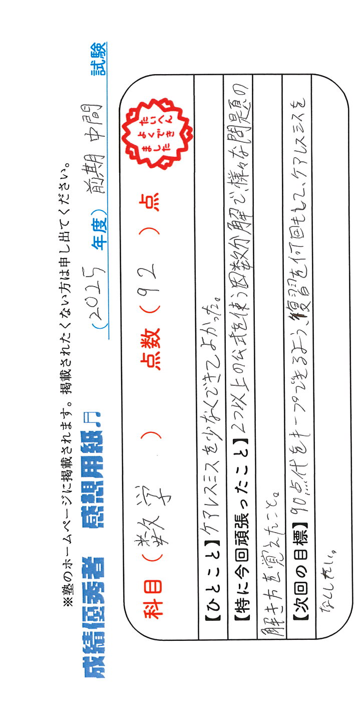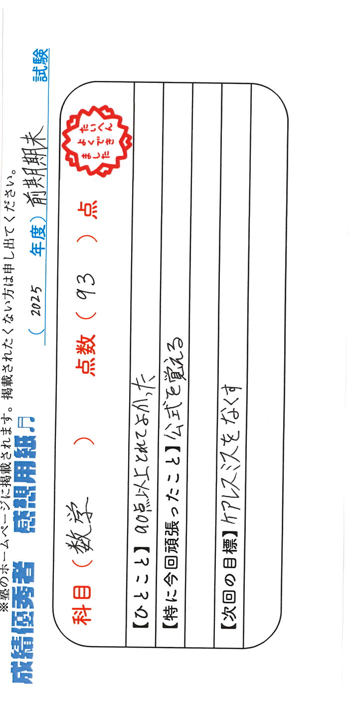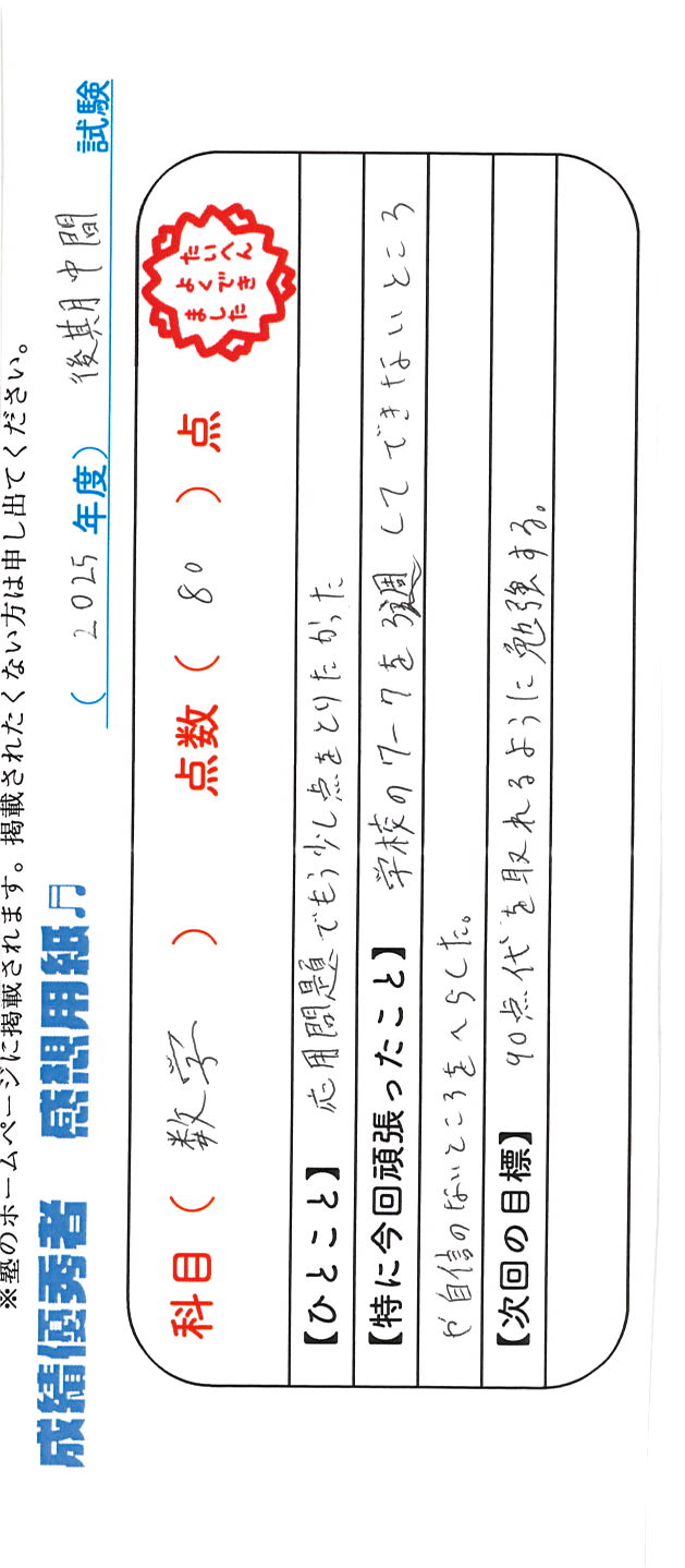 定期試験で優秀な成績を取った生徒さんのメッセージです。