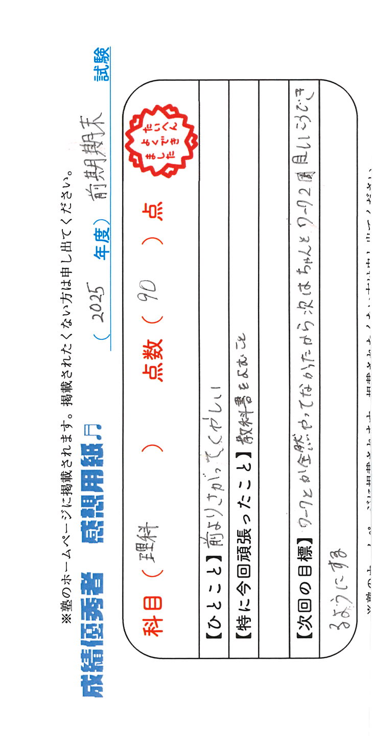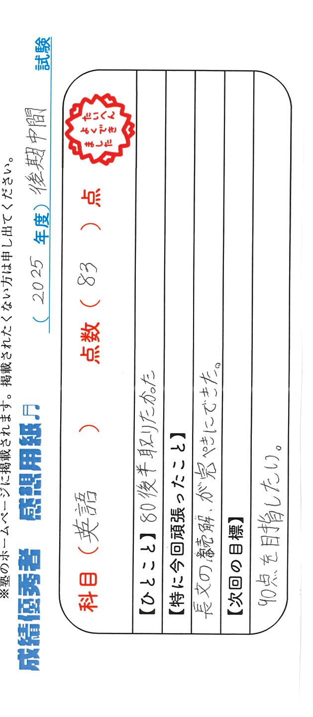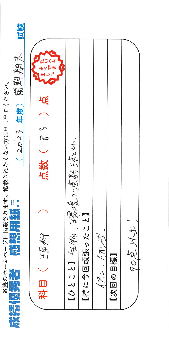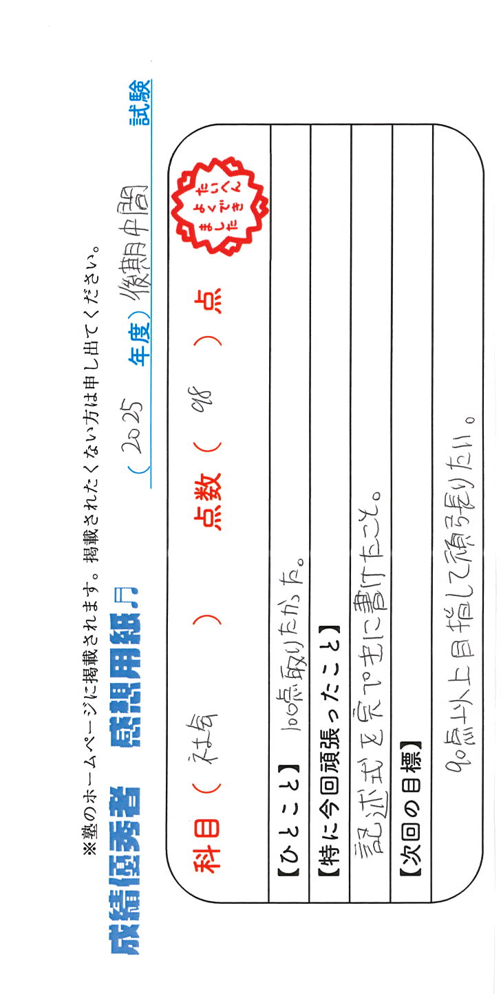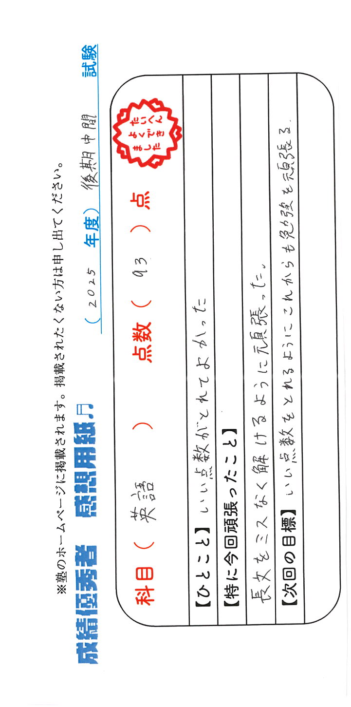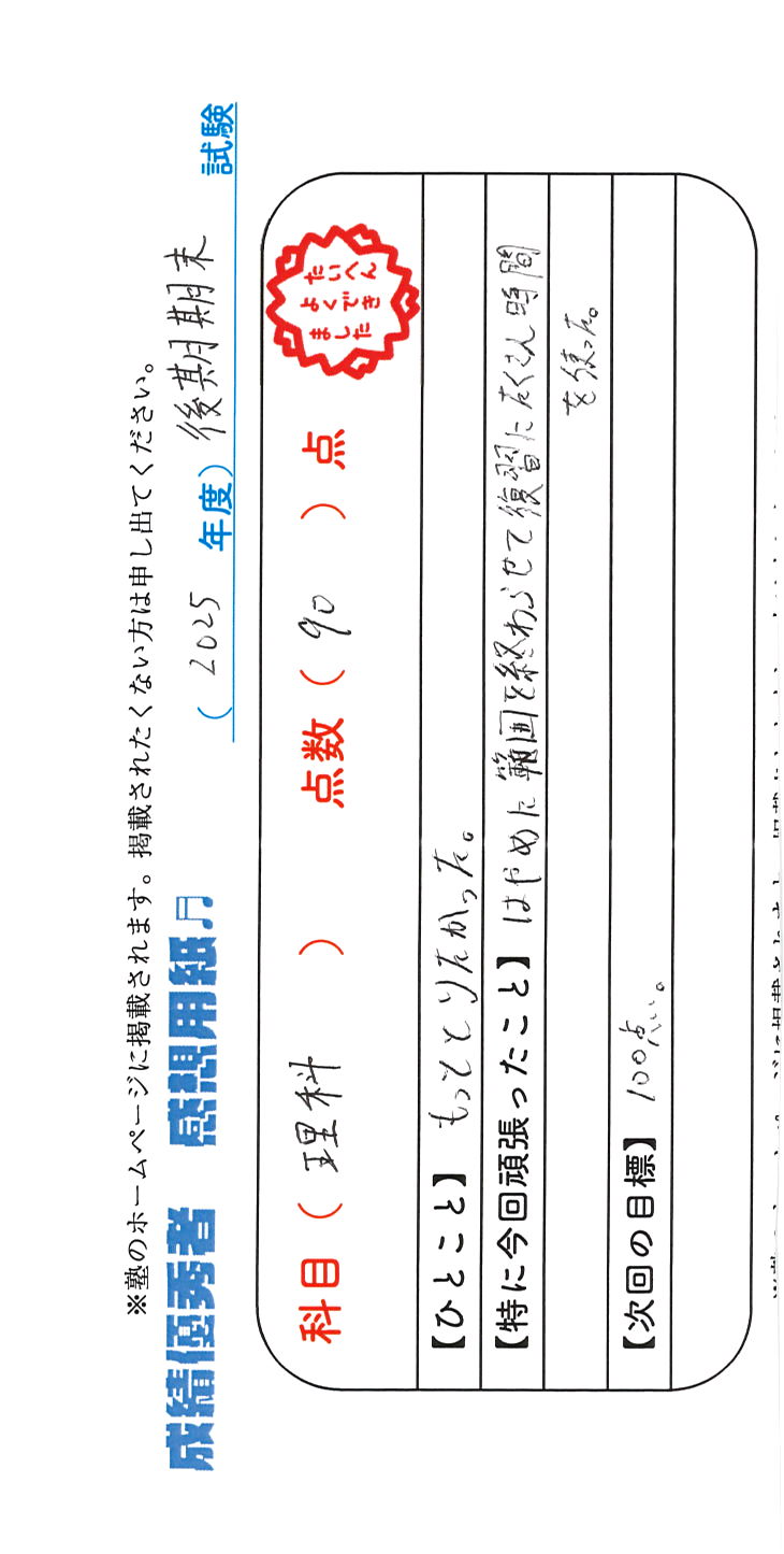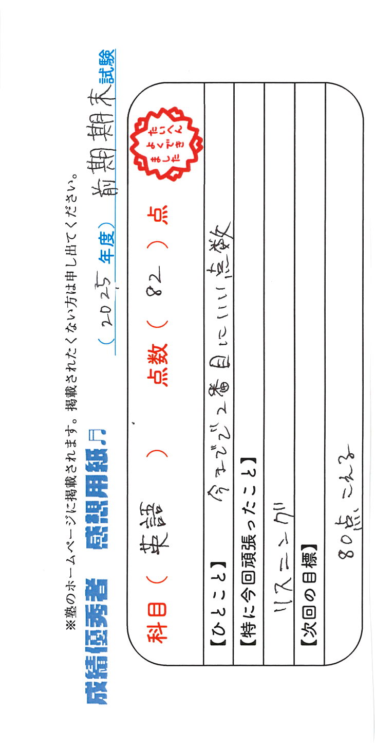 定期試験で優秀な成績を取った生徒さんのメッセージです。
