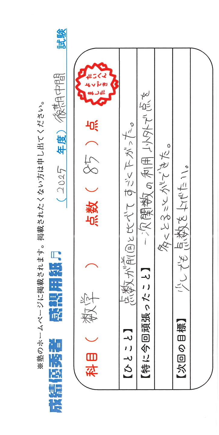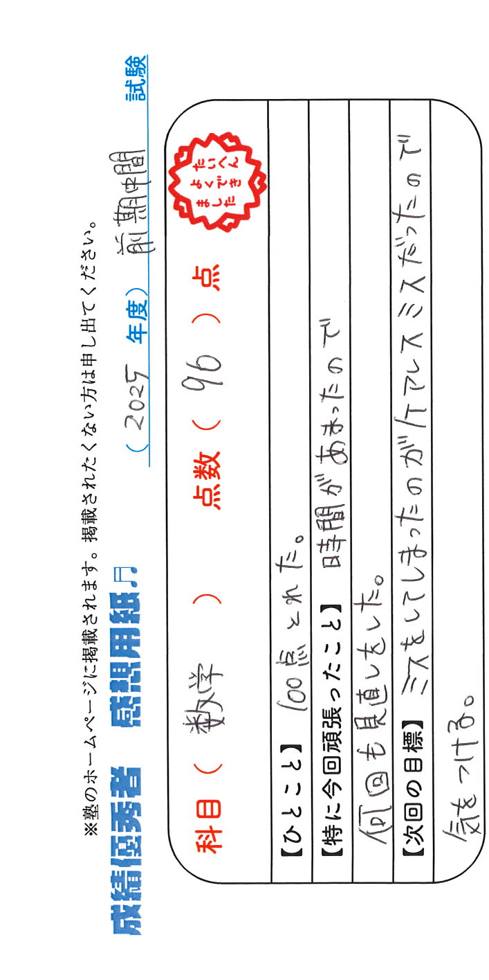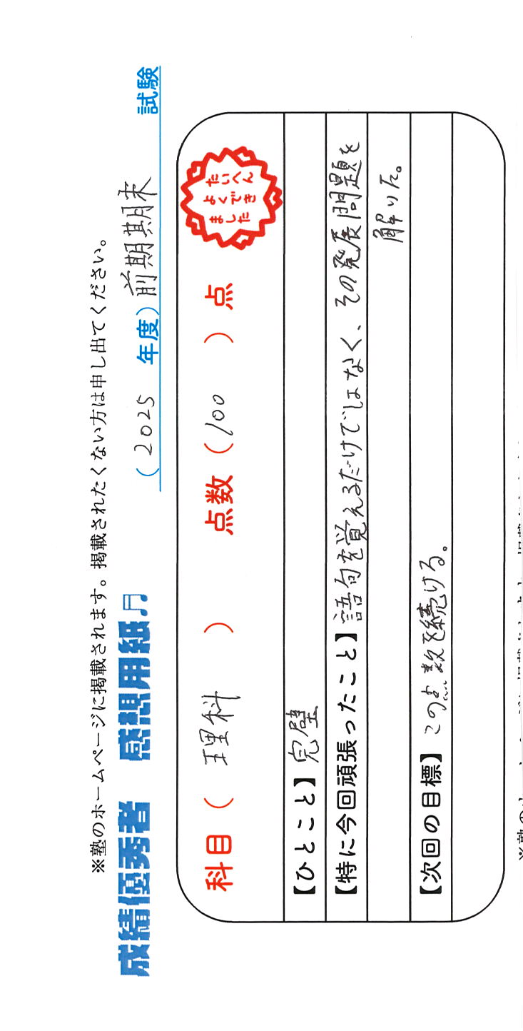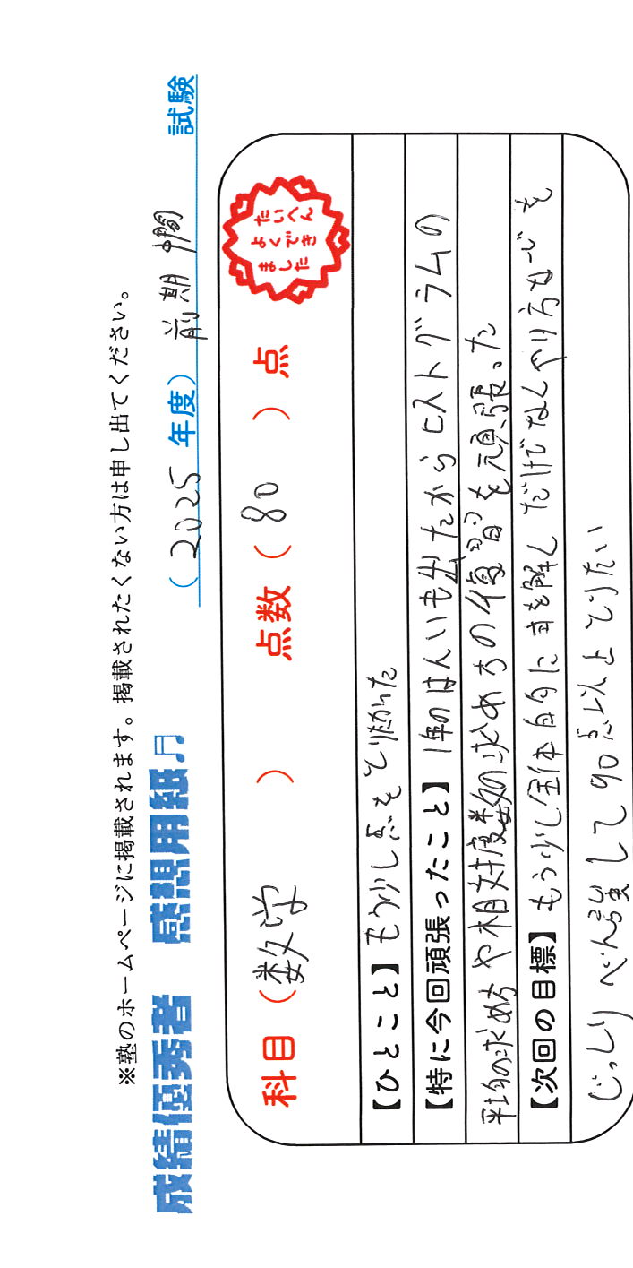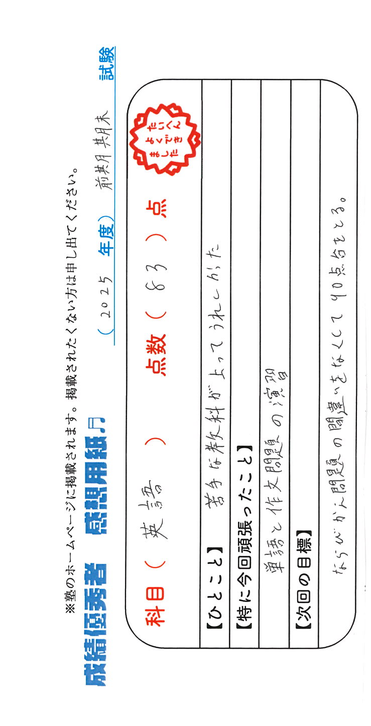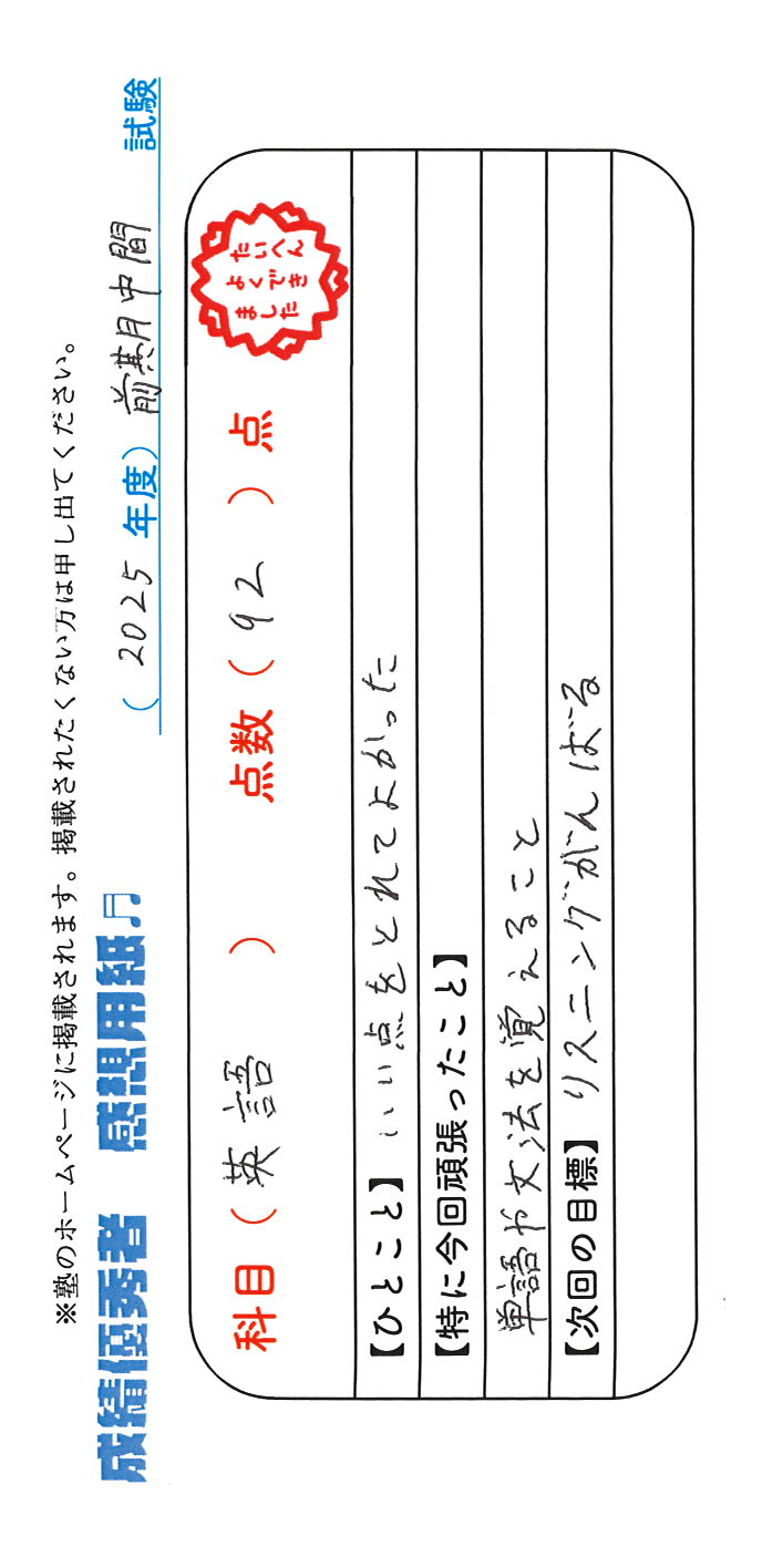 定期試験で優秀な成績を取った生徒さんのメッセージです。