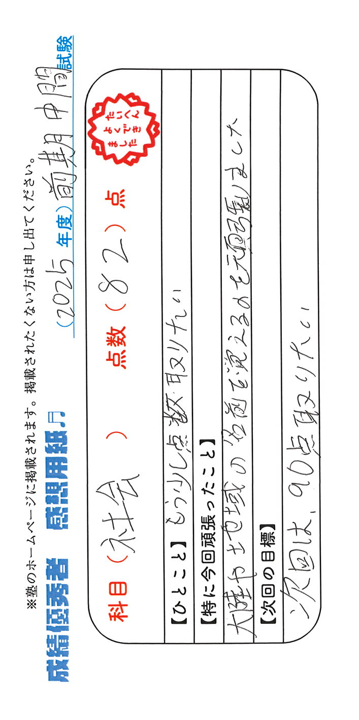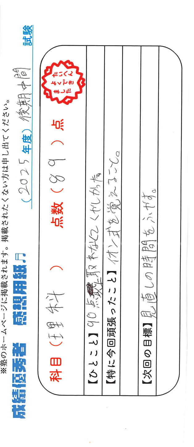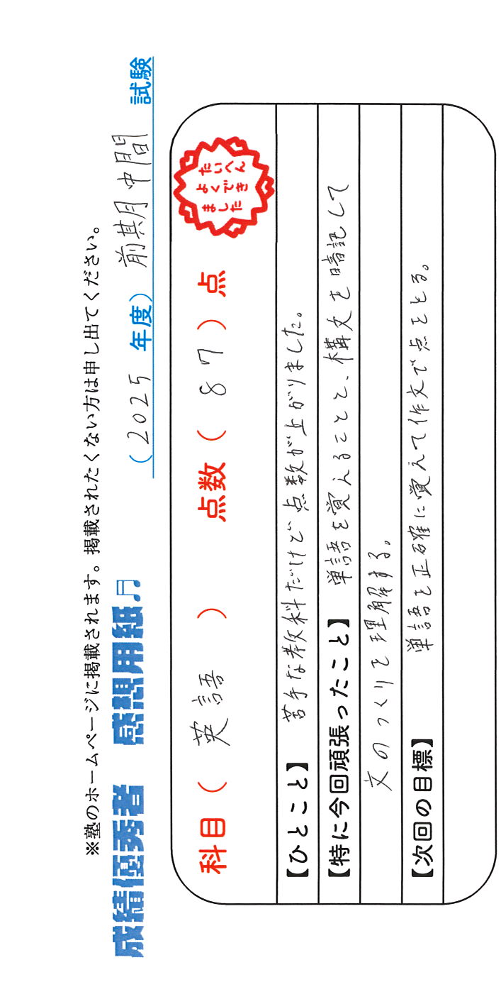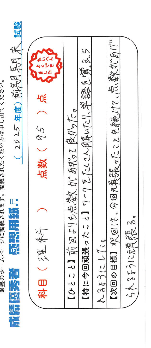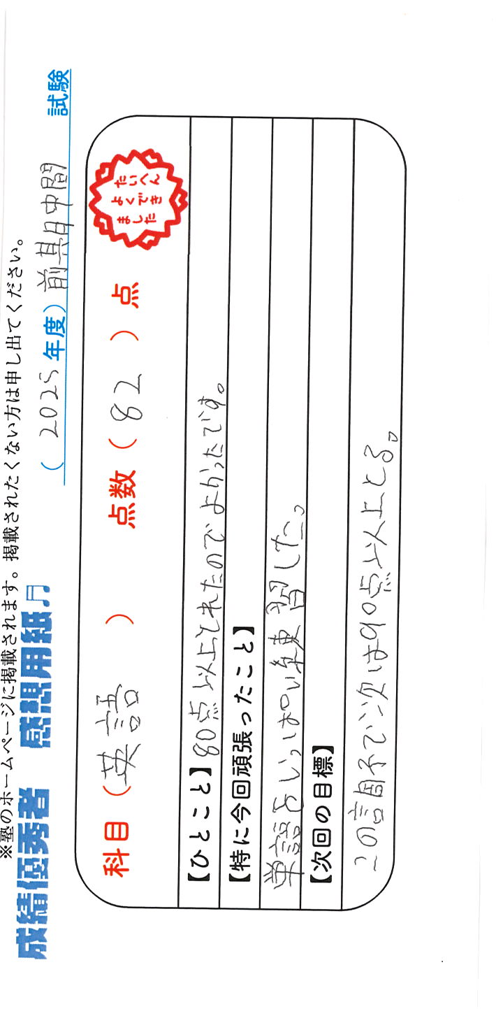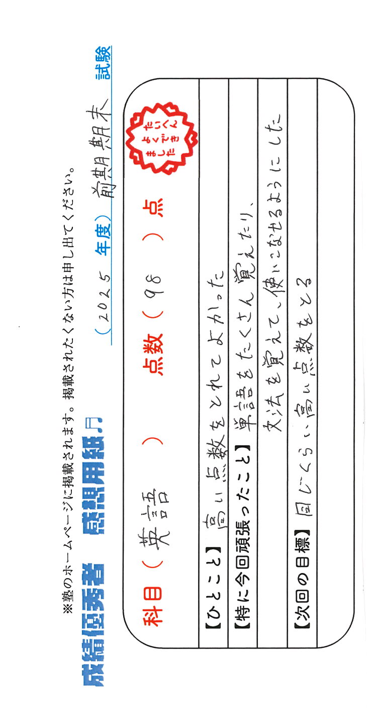 定期試験で優秀な成績を取った生徒さんのメッセージです。