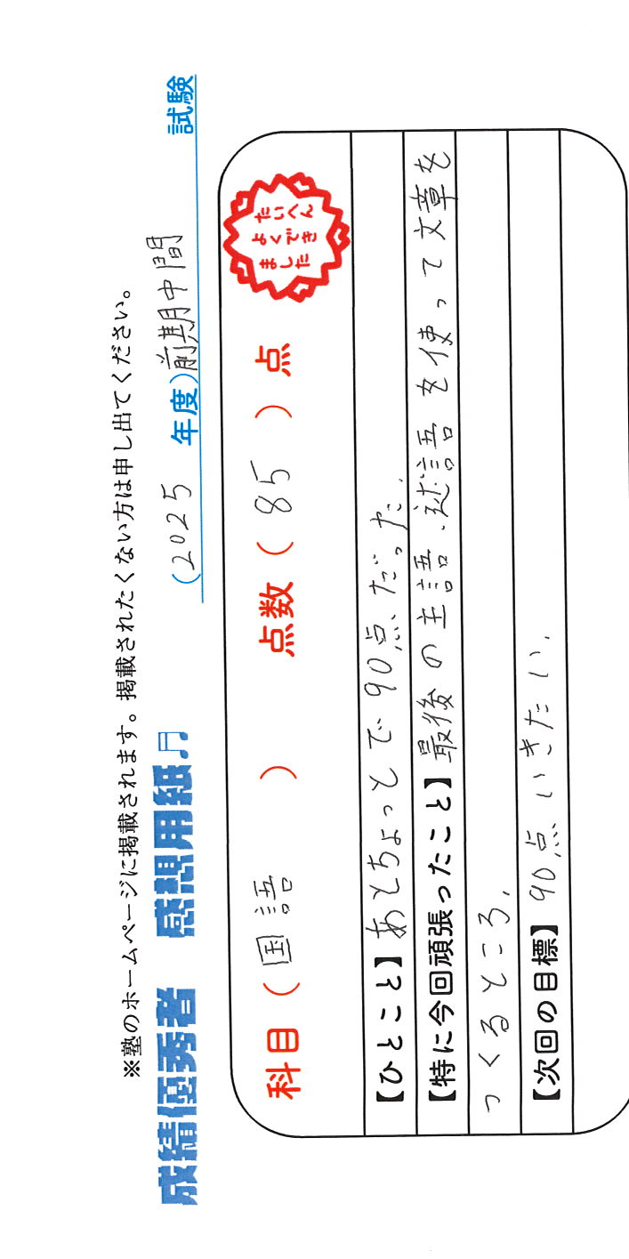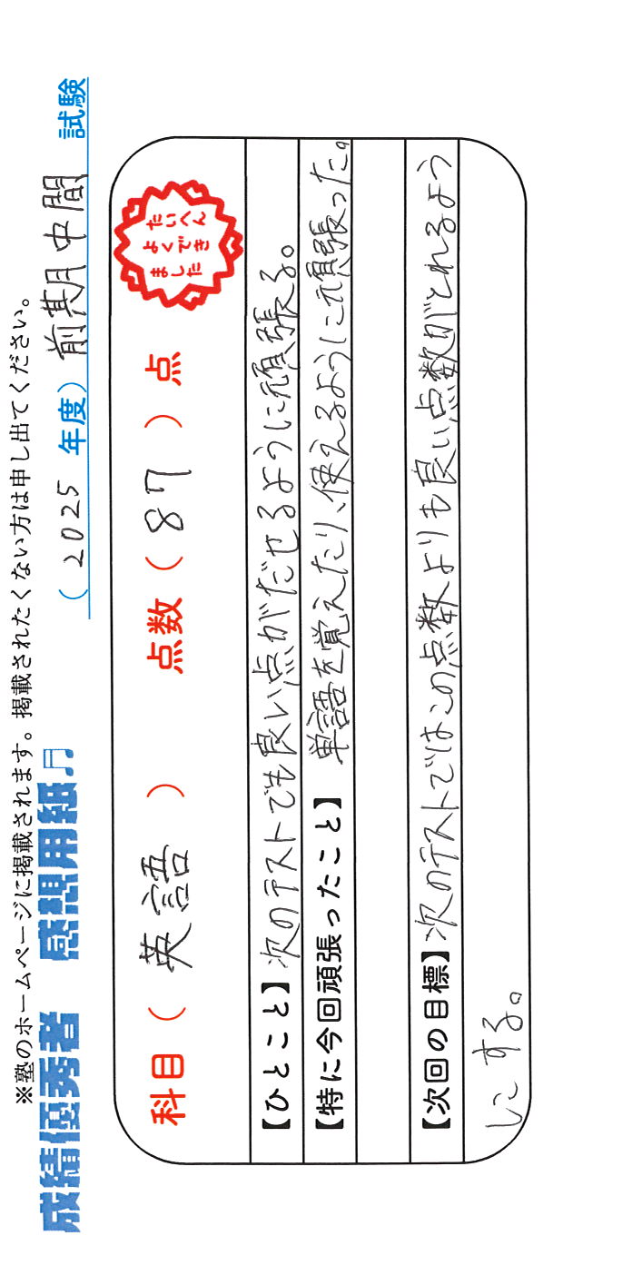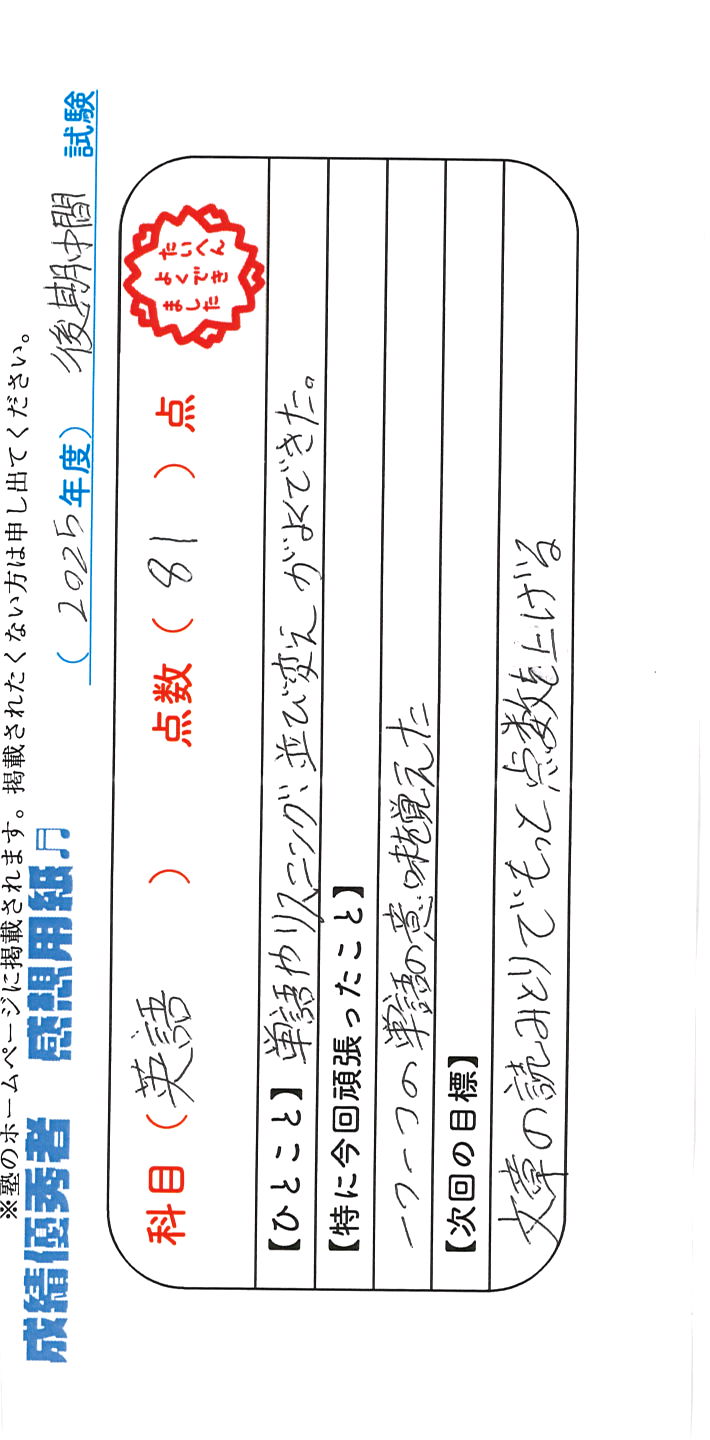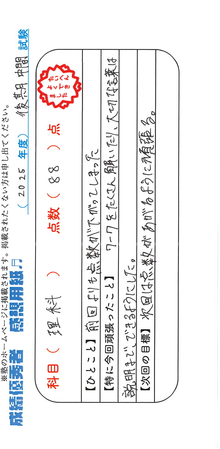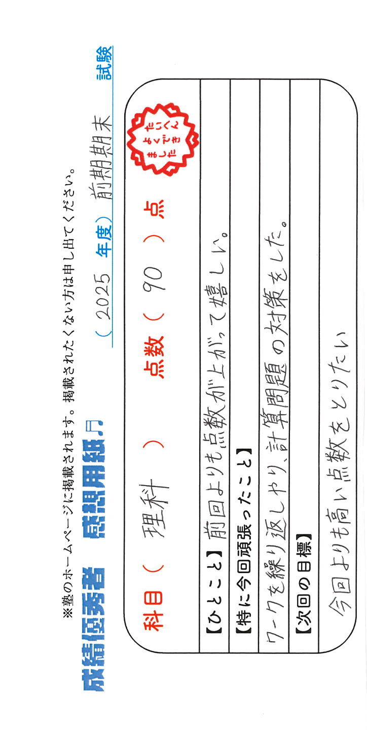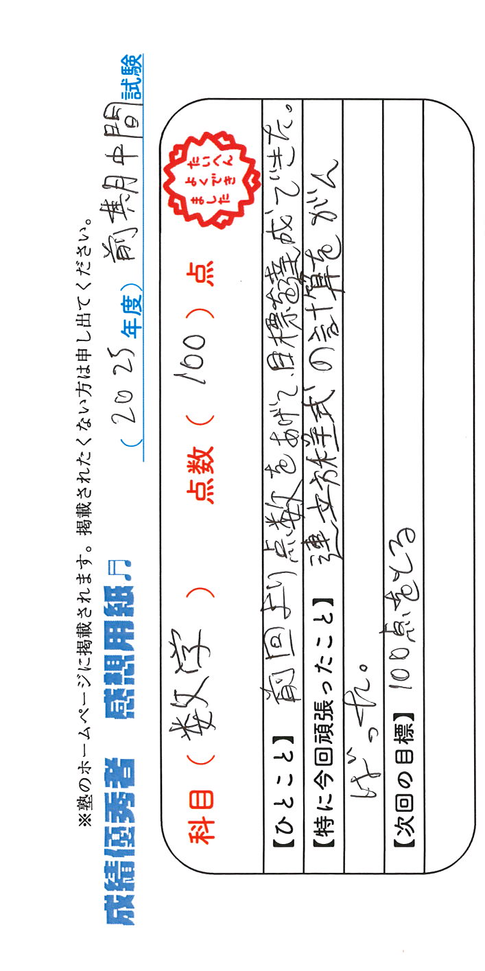 定期試験で優秀な成績を取った生徒さんのメッセージです。