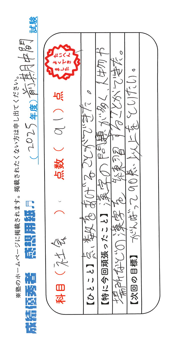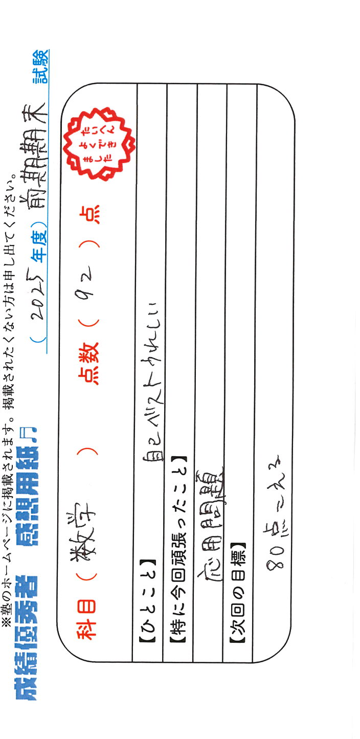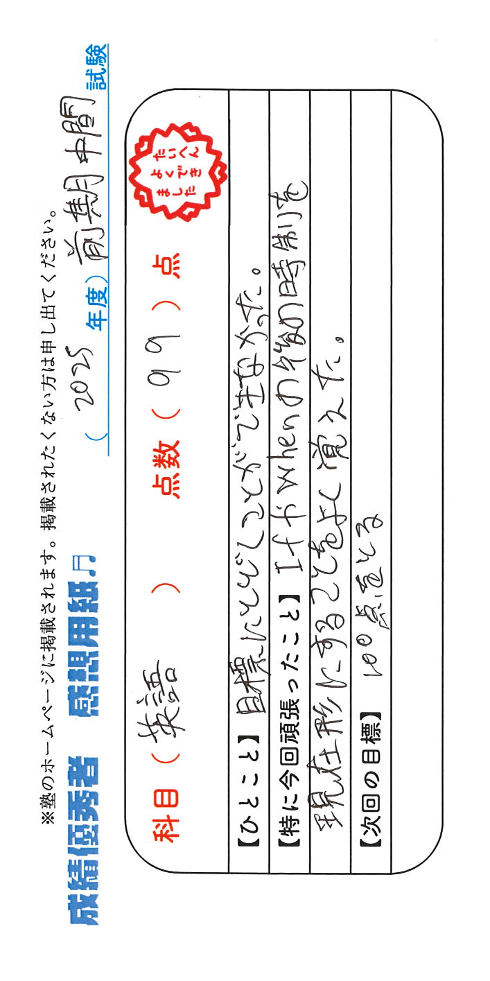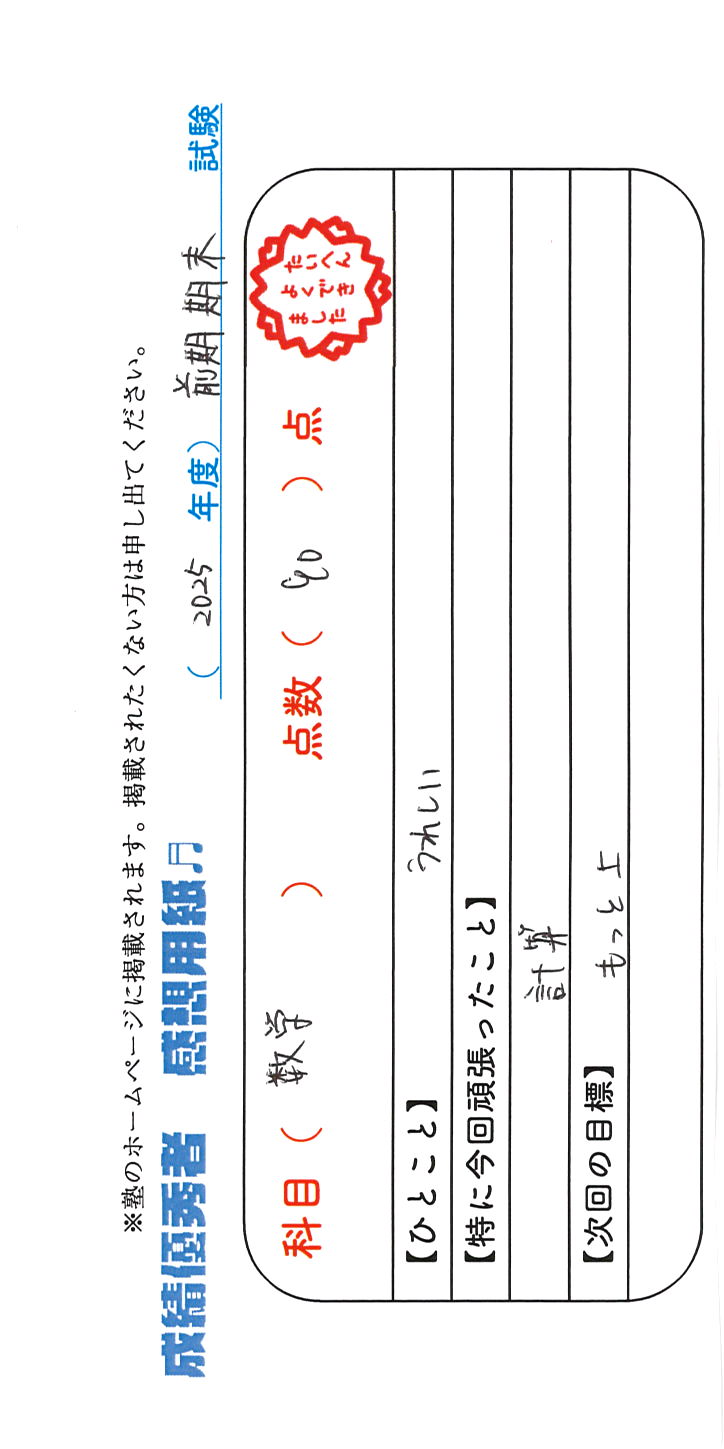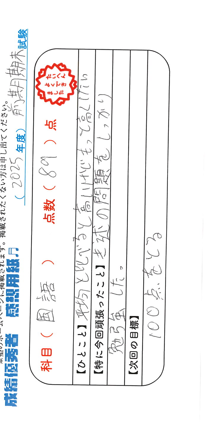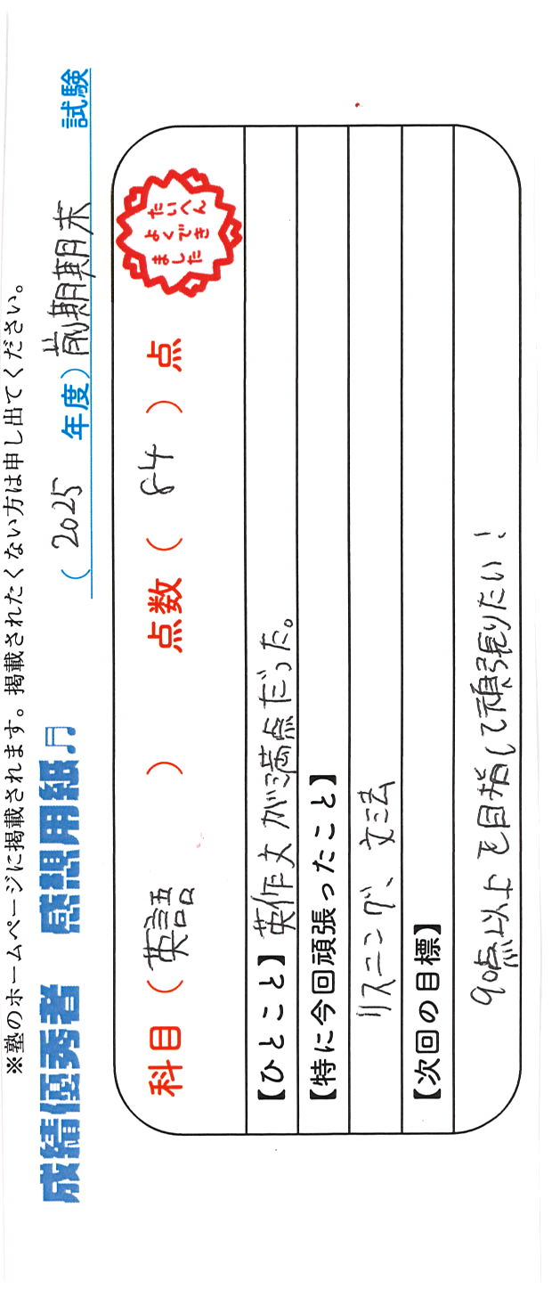 定期試験で優秀な成績を取った生徒さんのメッセージです。