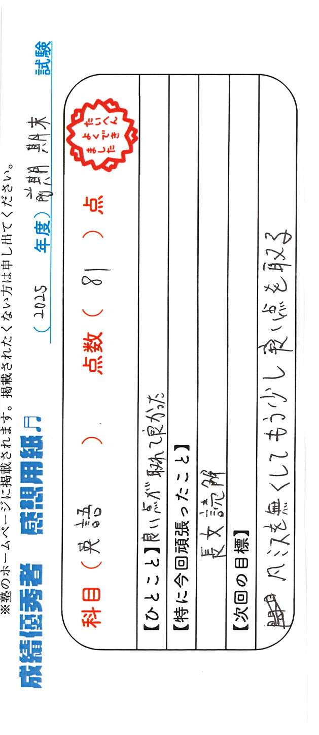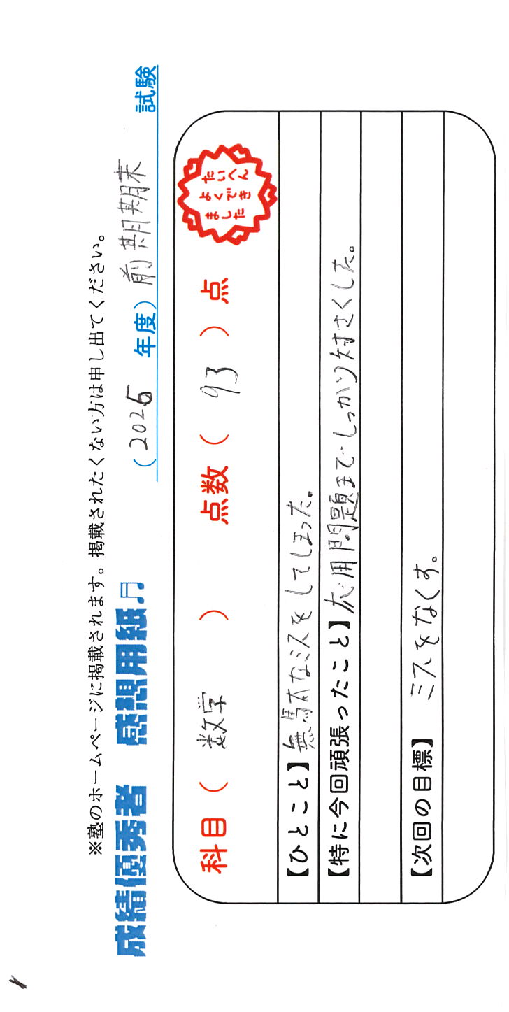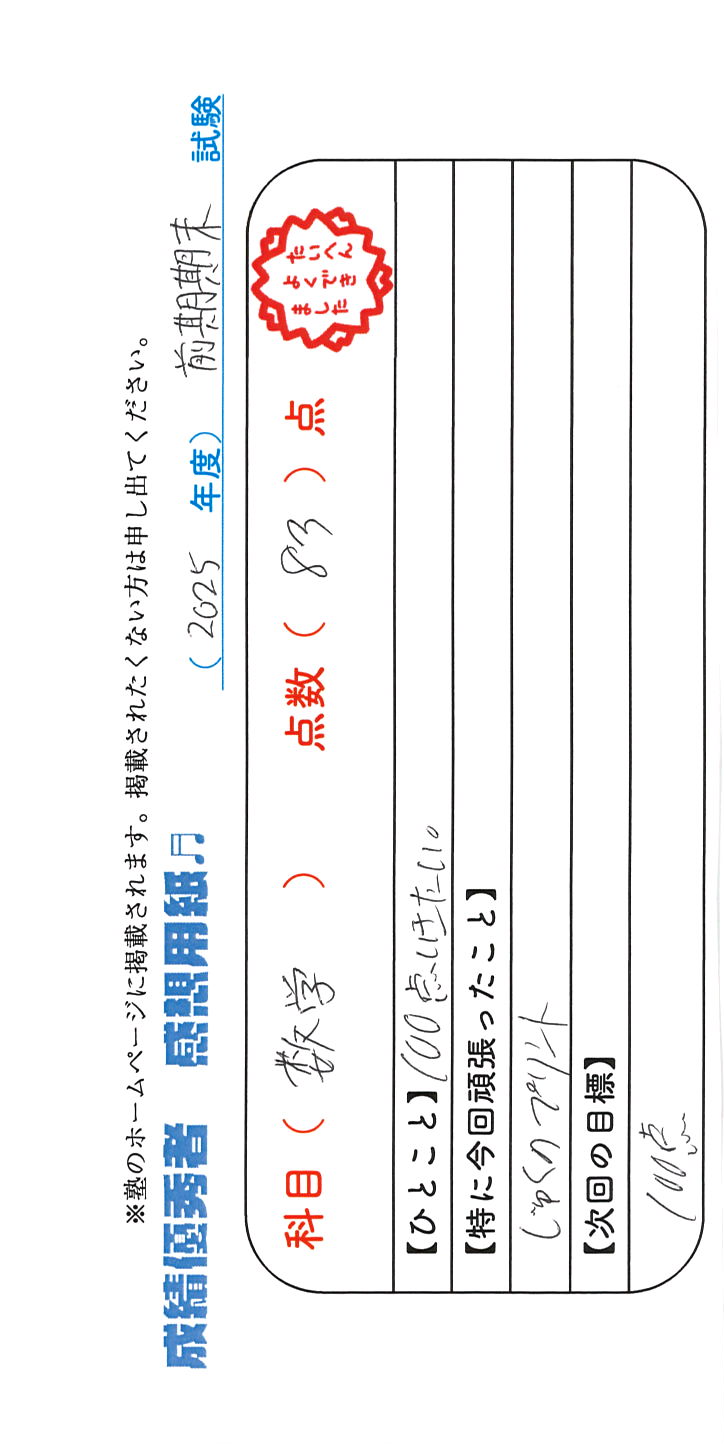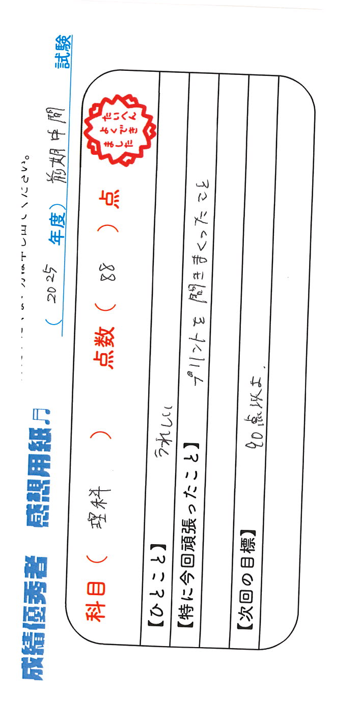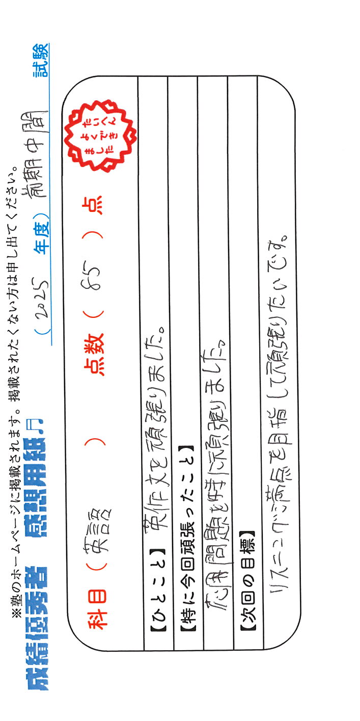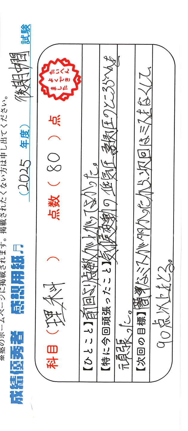 定期試験で優秀な成績を取った生徒さんのメッセージです。