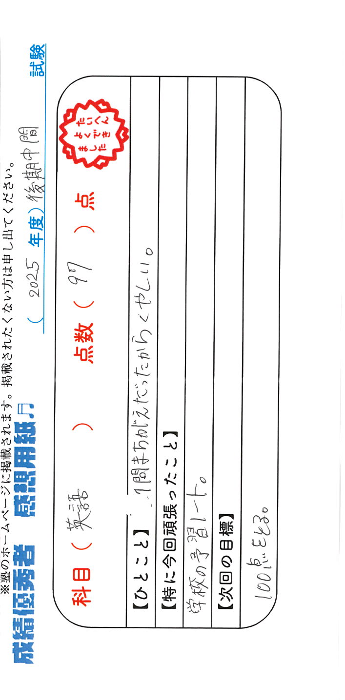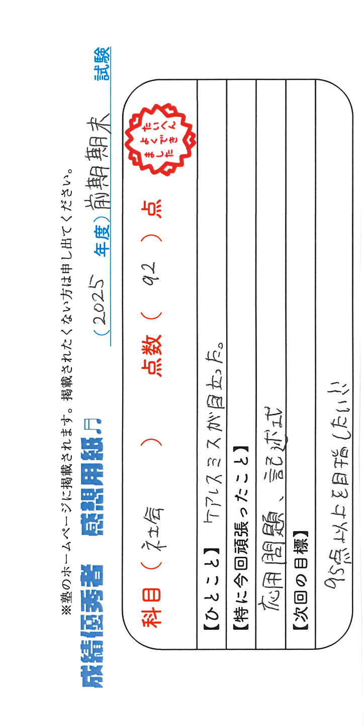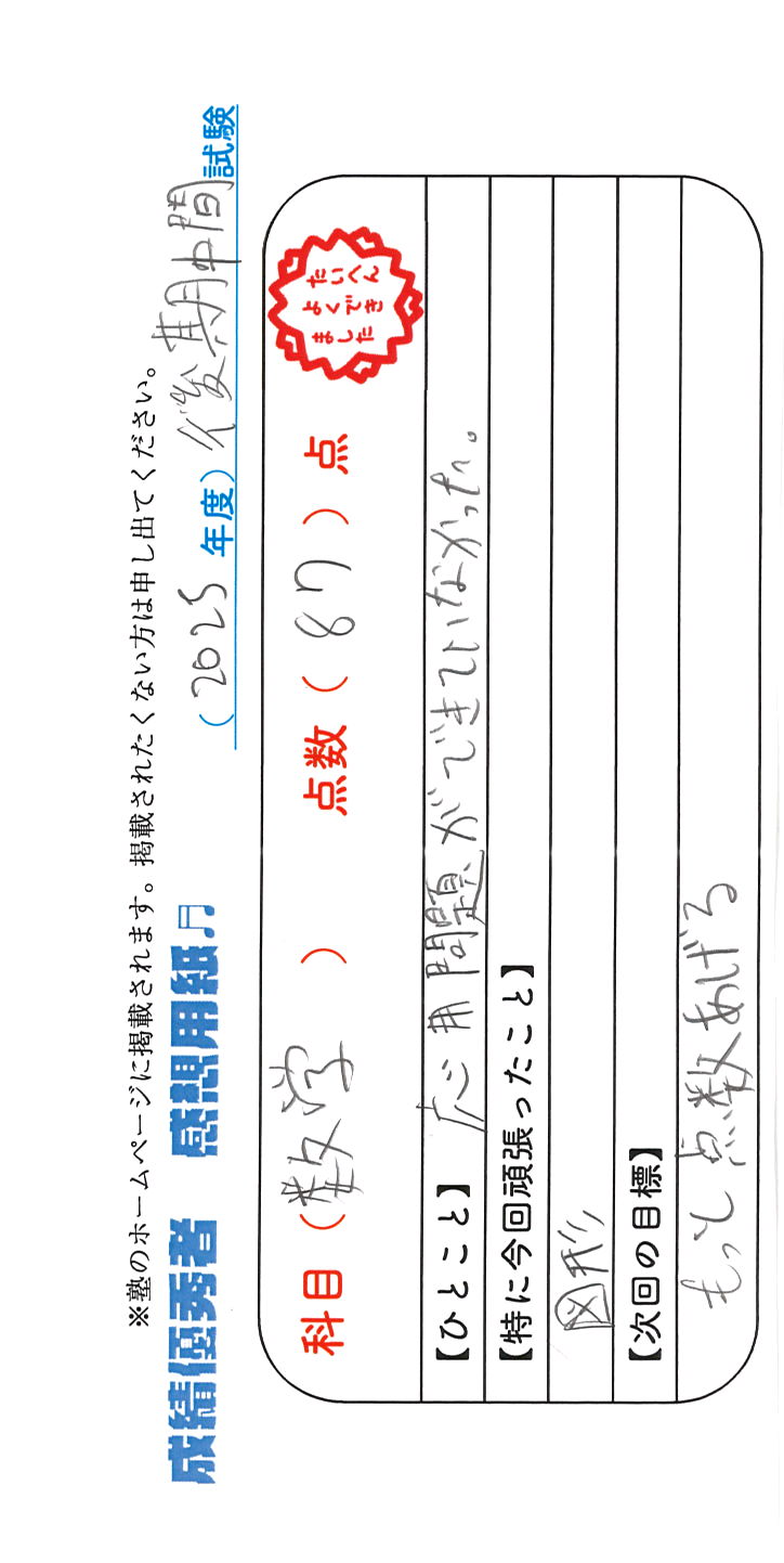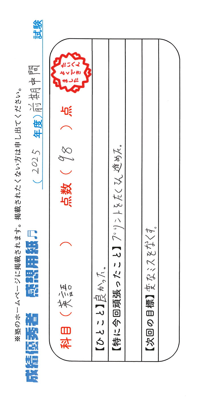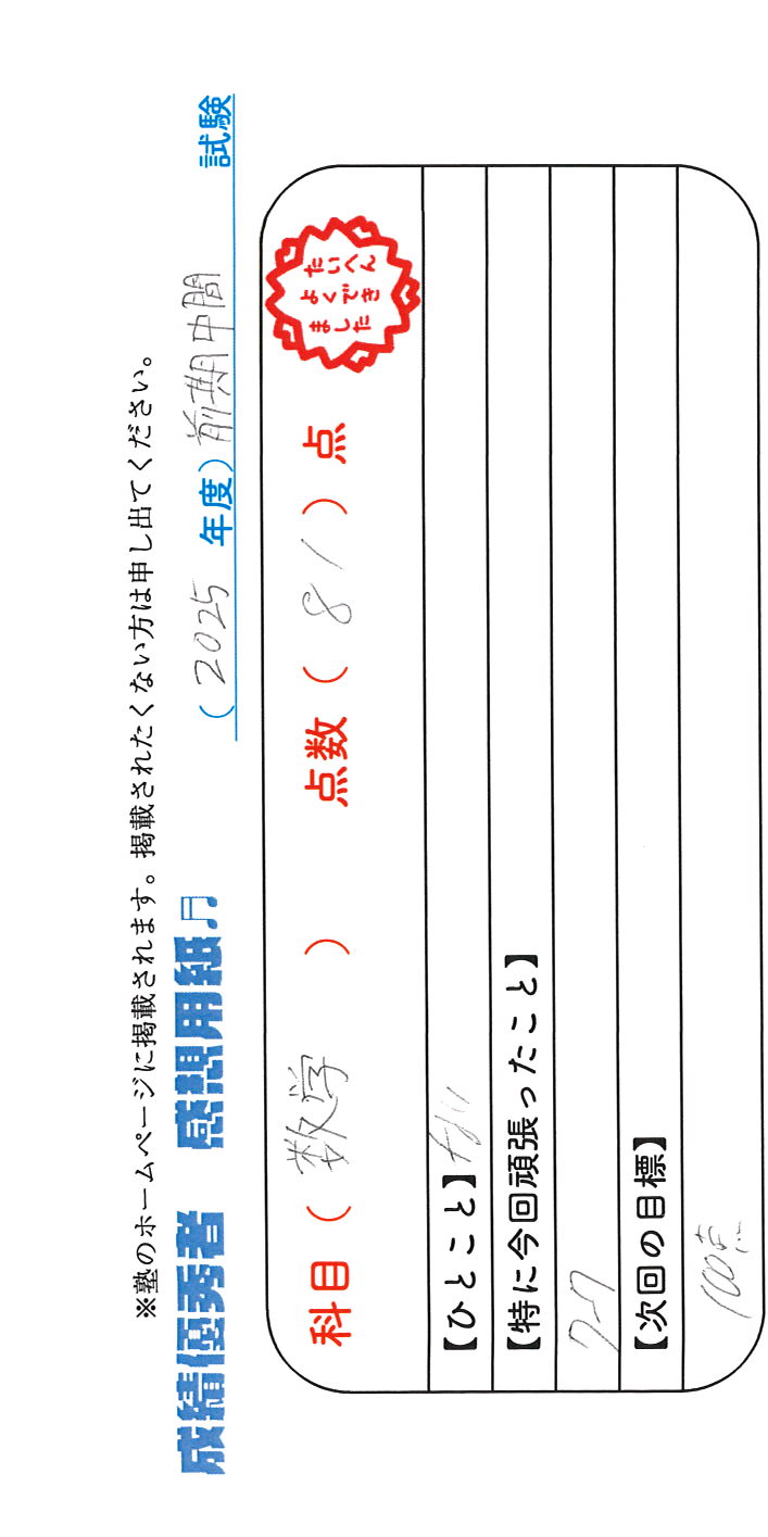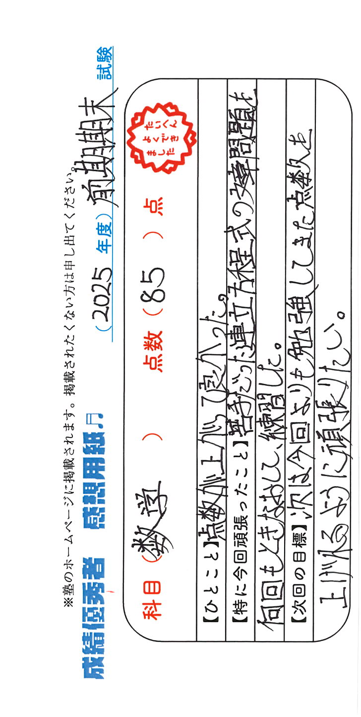 定期試験で優秀な成績を取った生徒さんのメッセージです。