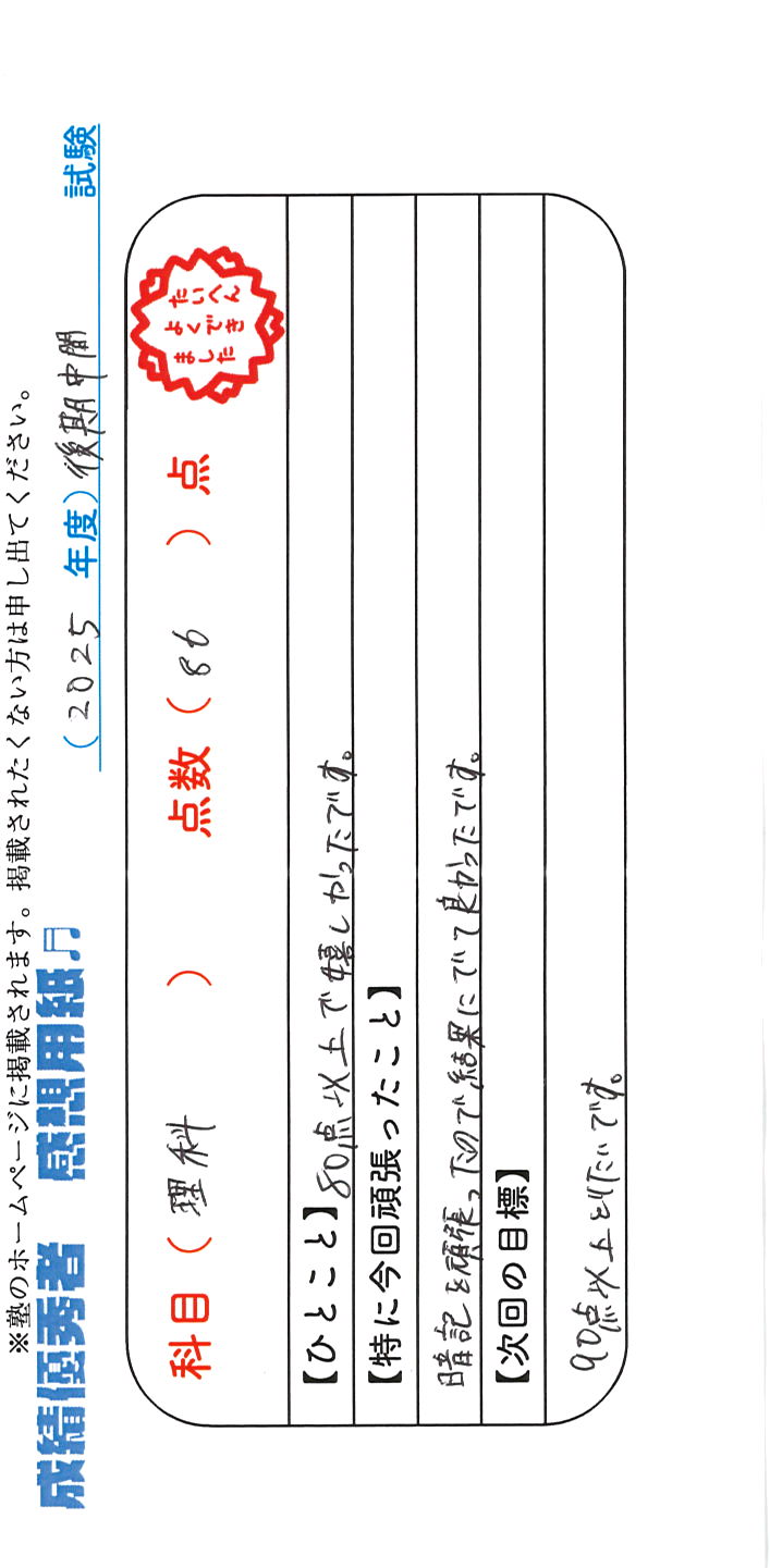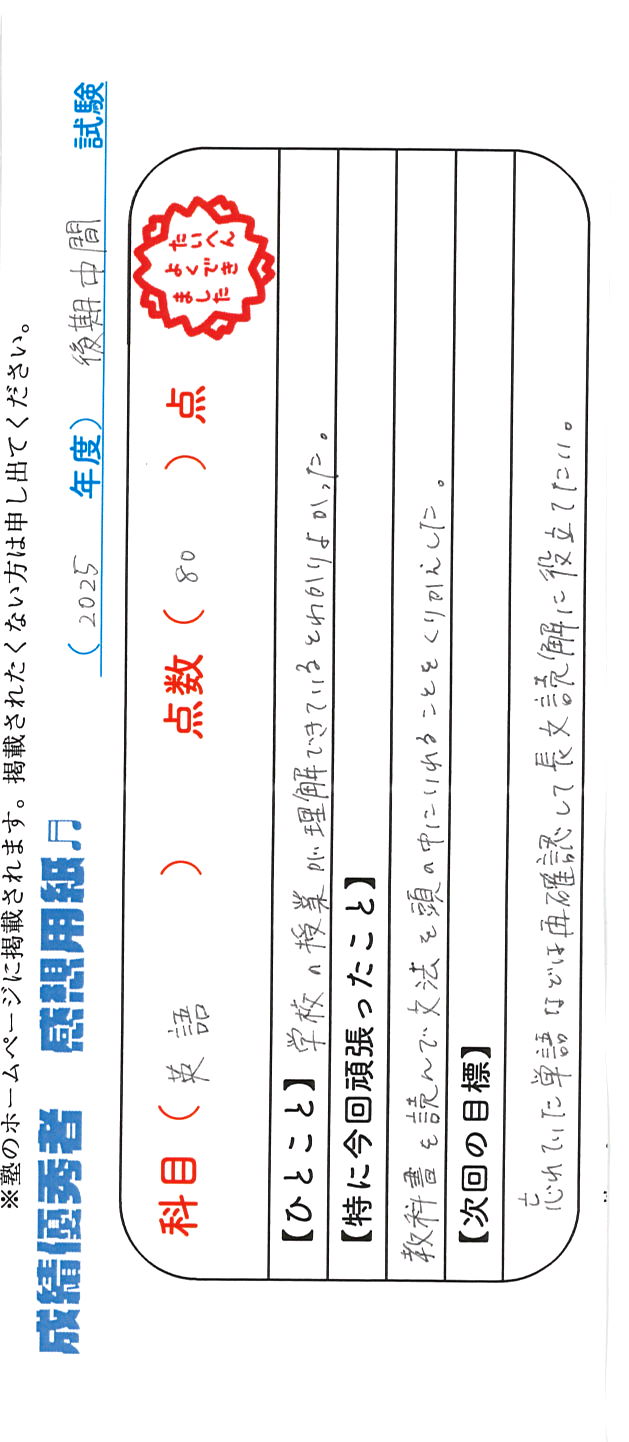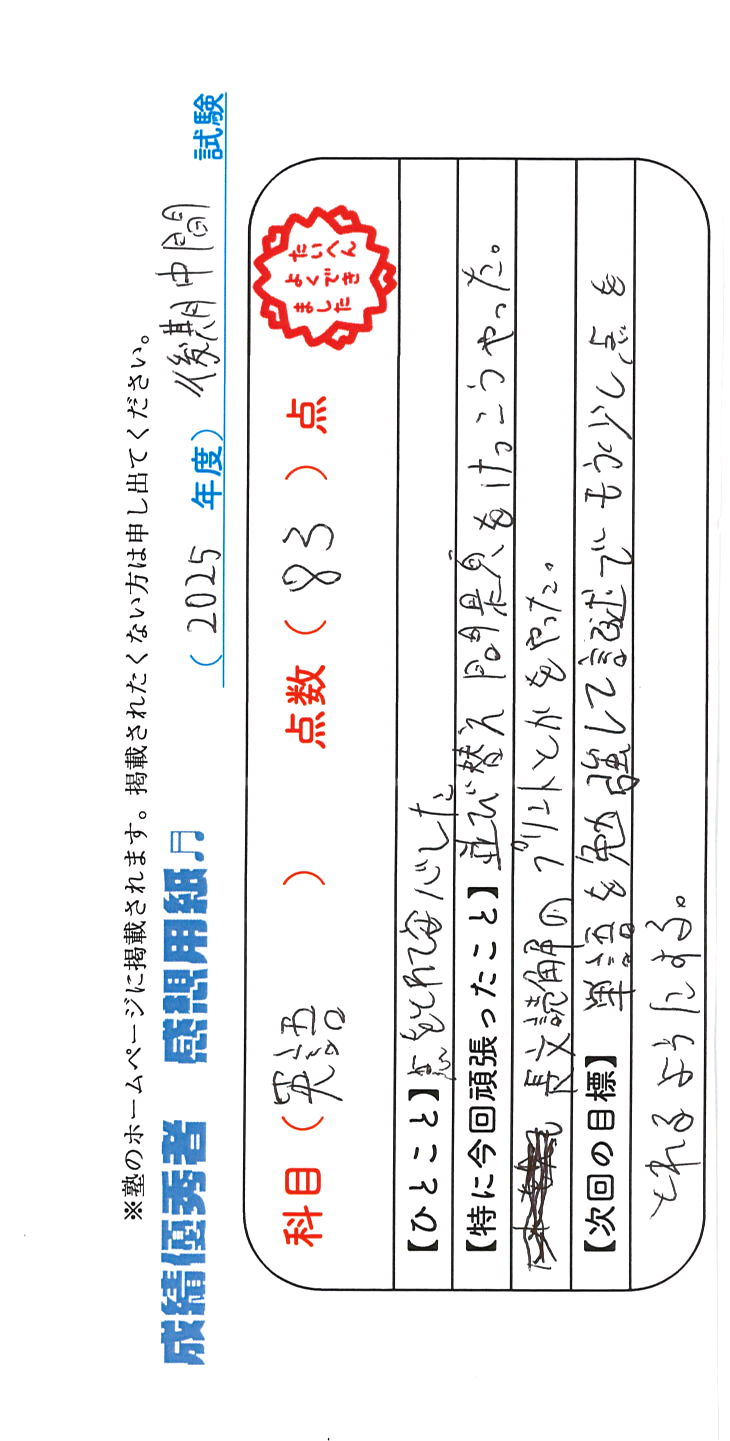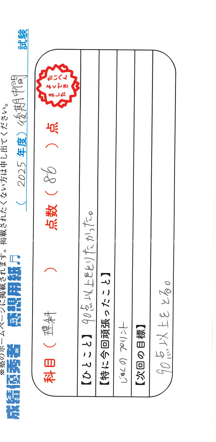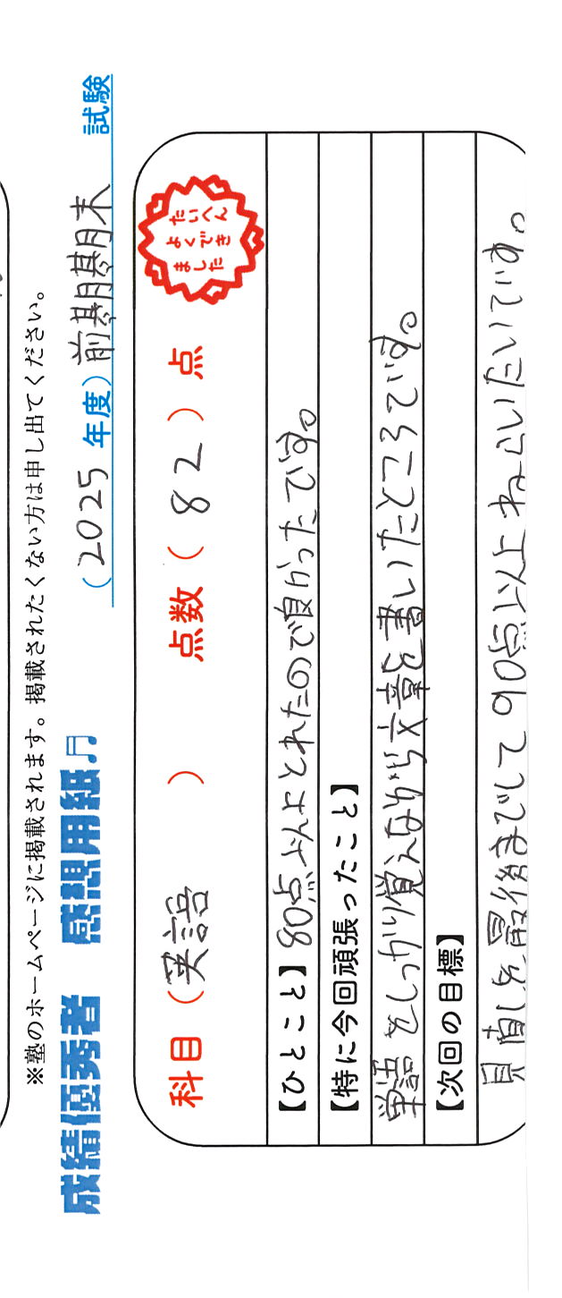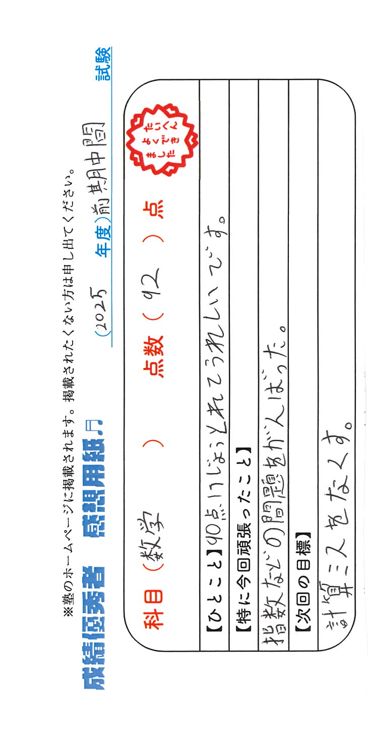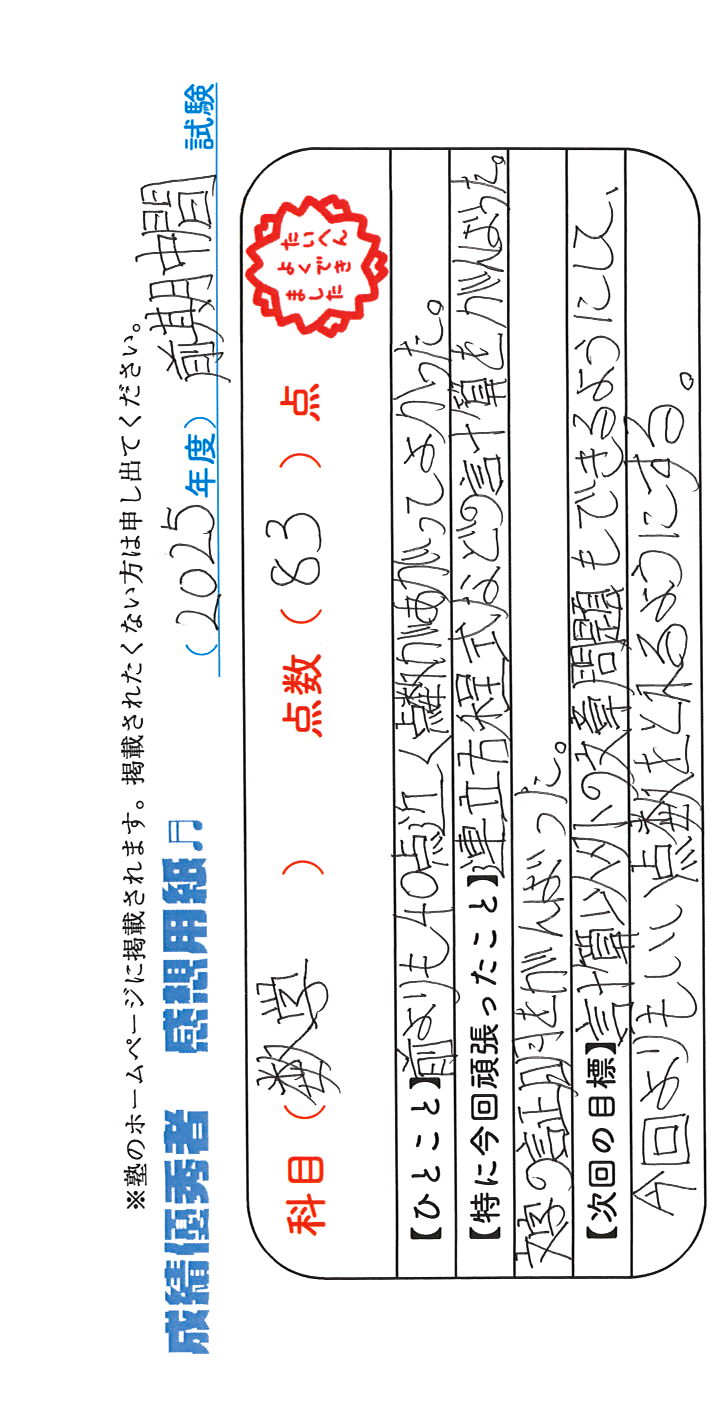 定期試験で優秀な成績を取った生徒さんのメッセージです。