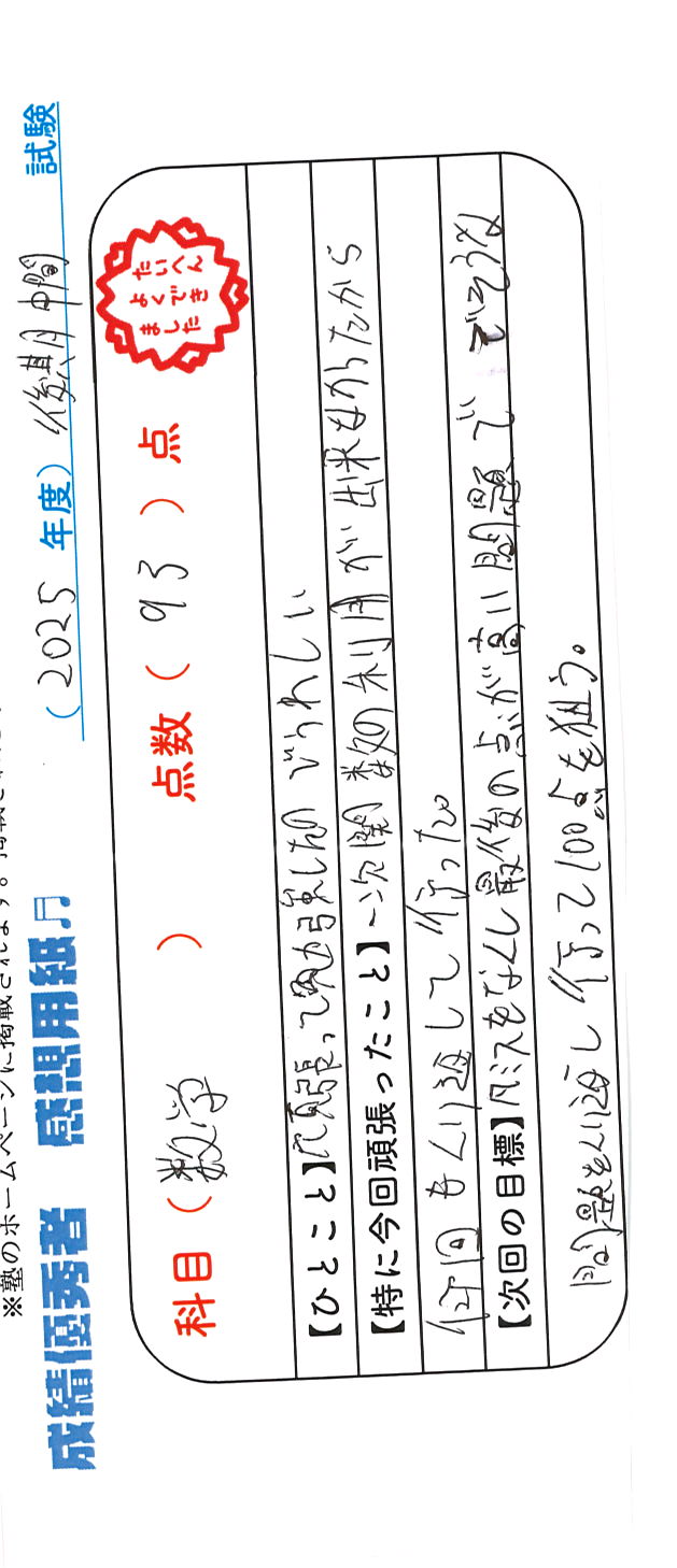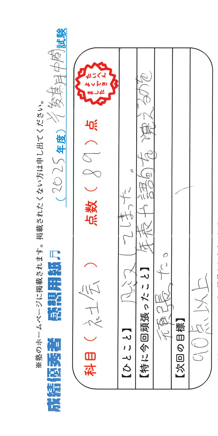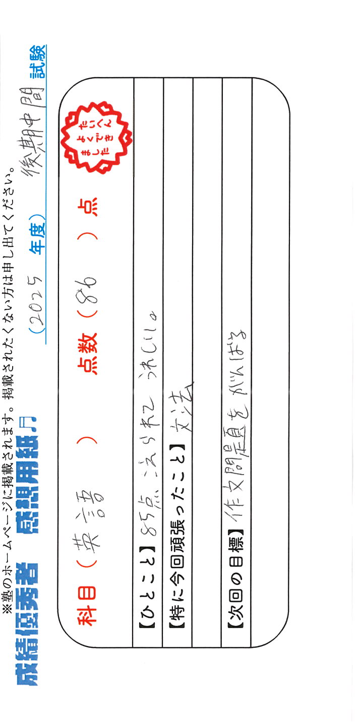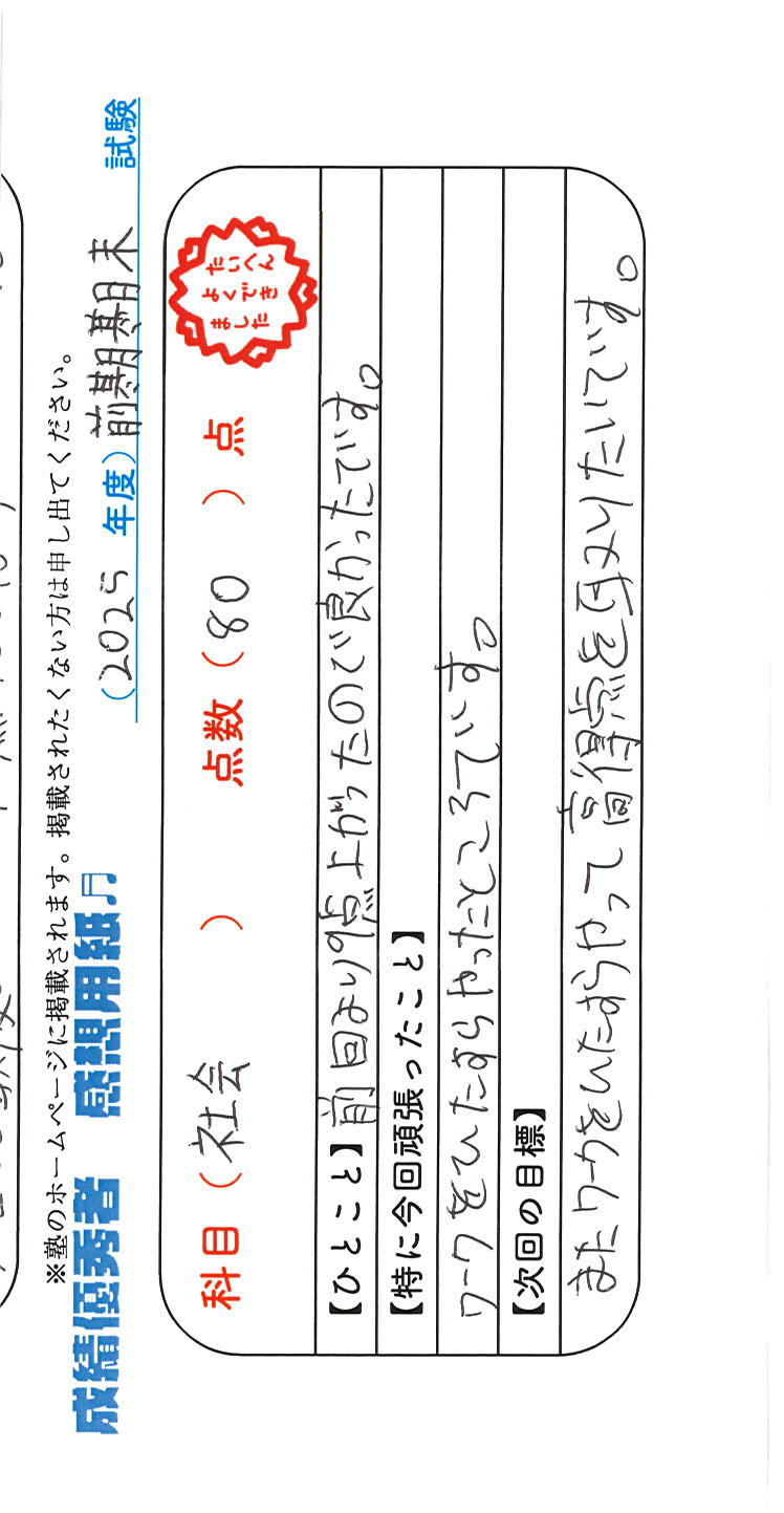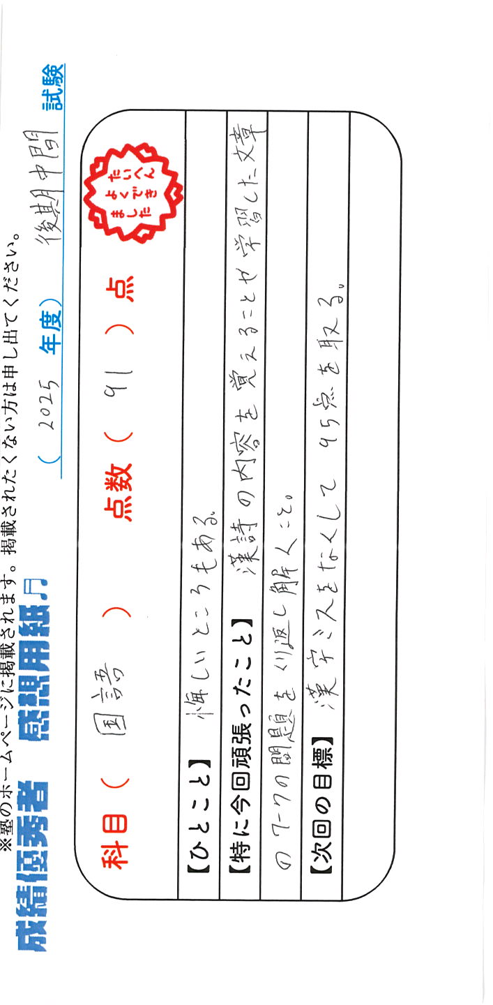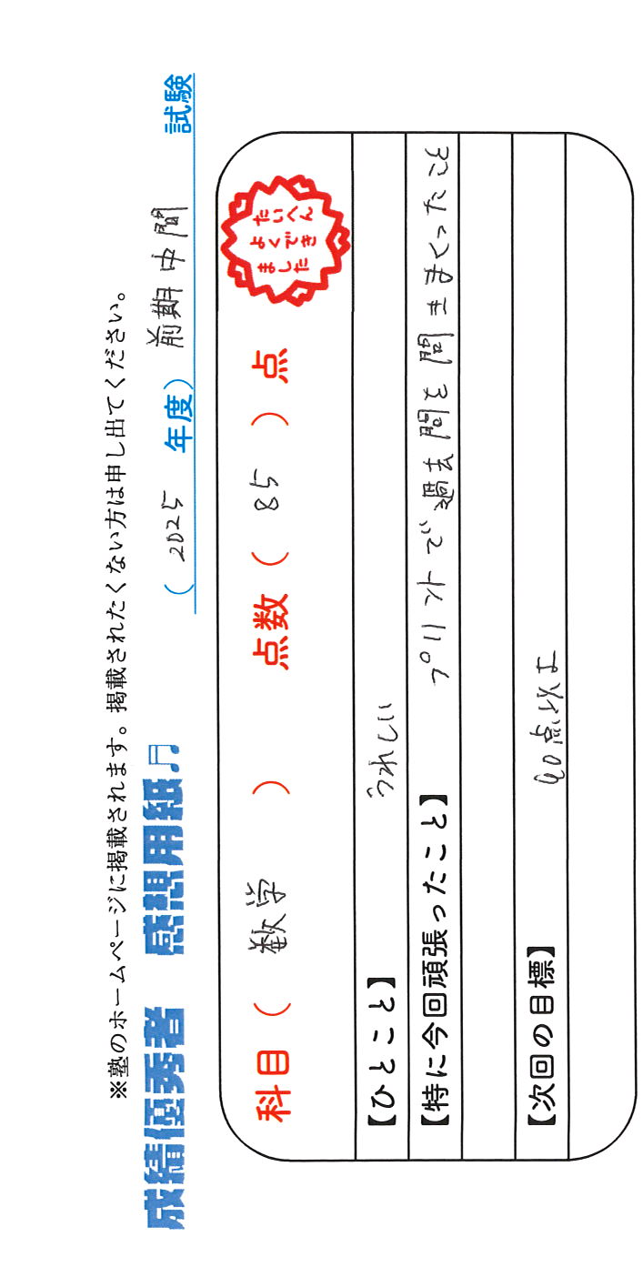 定期試験で優秀な成績を取った生徒さんのメッセージです。