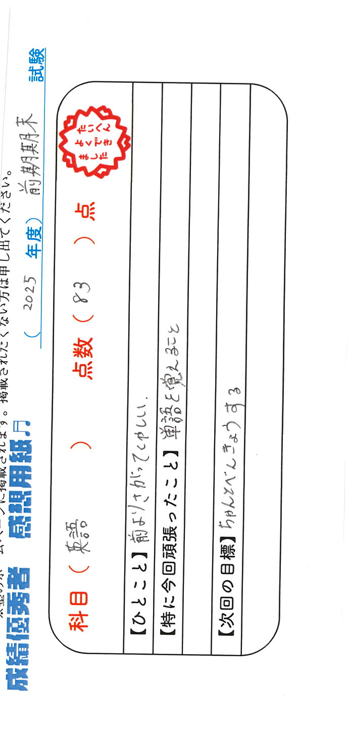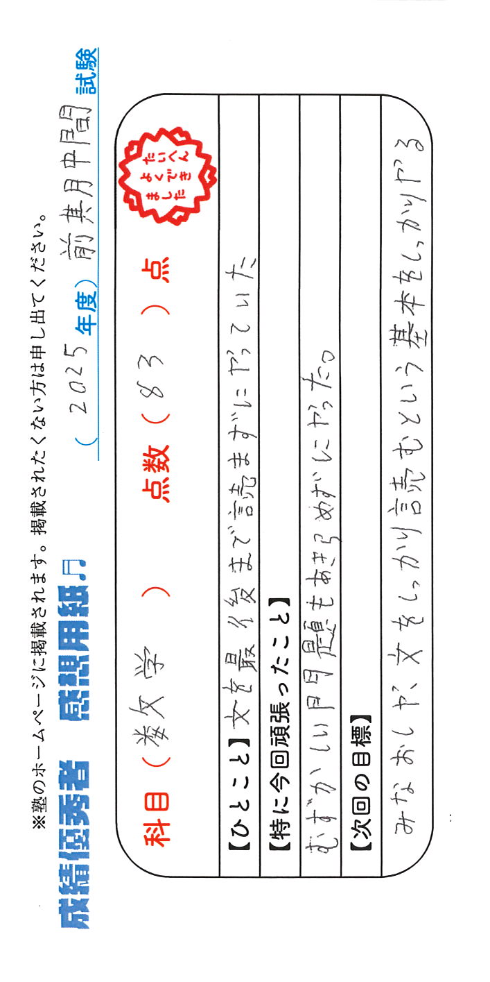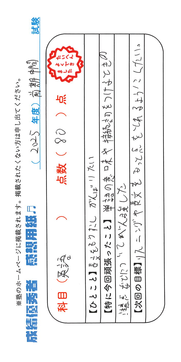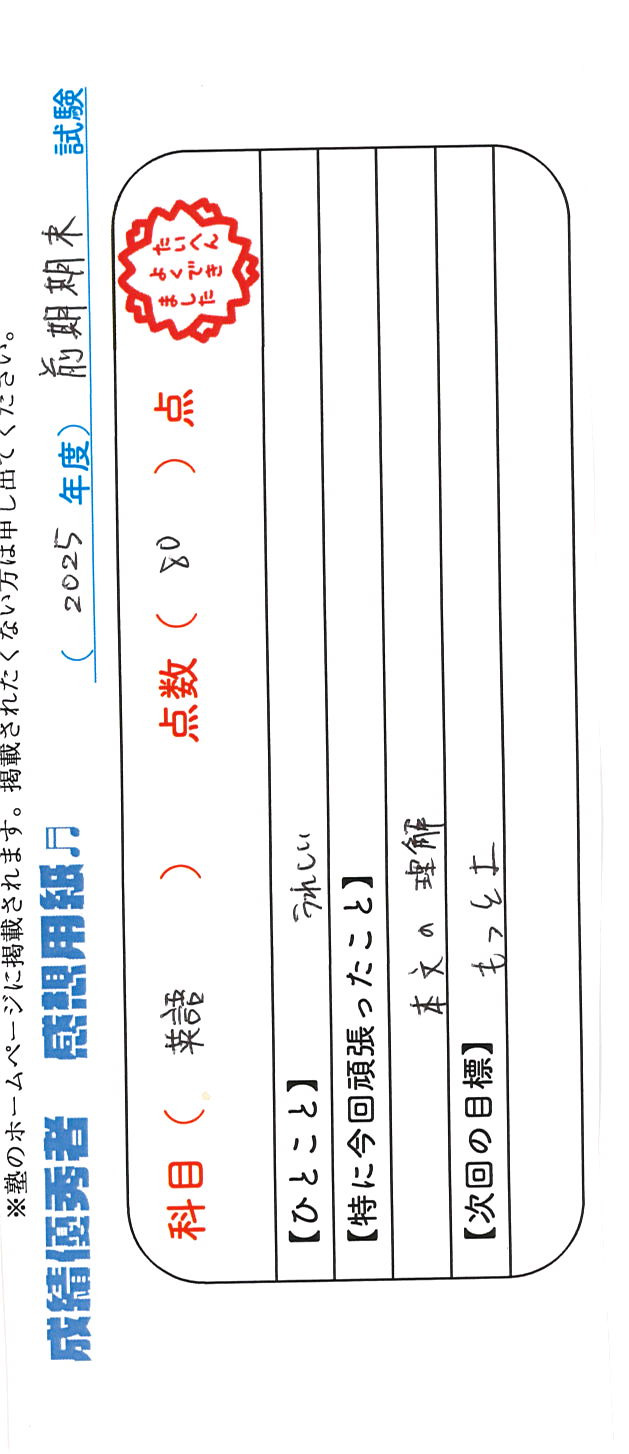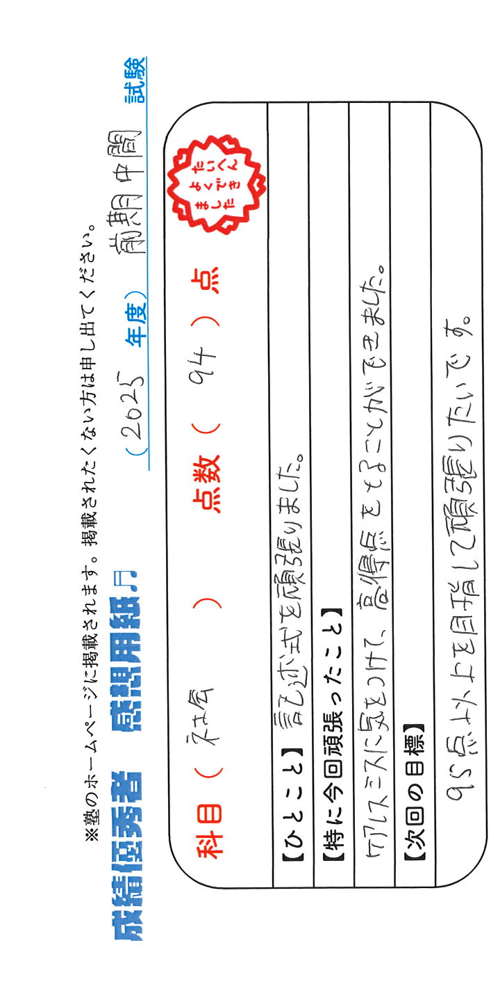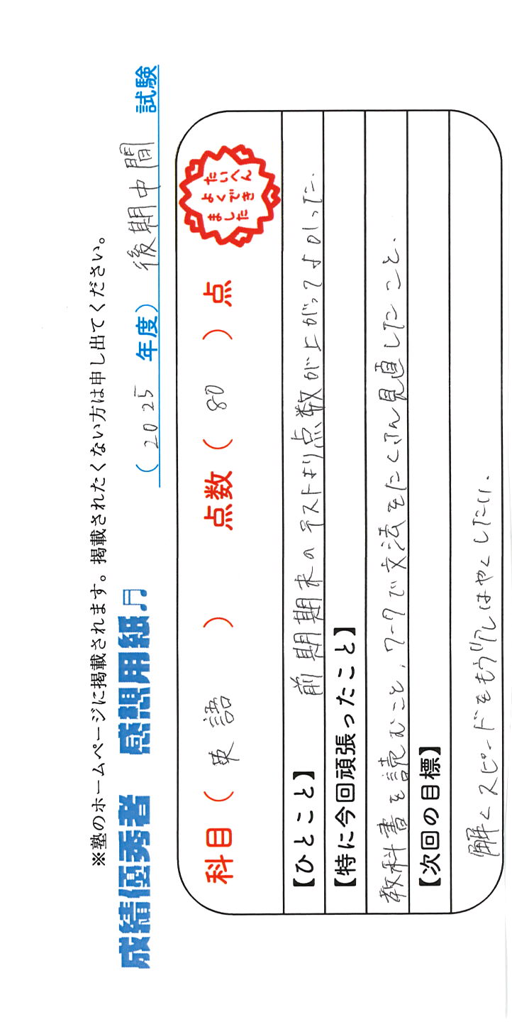 定期試験で優秀な成績を取った生徒さんのメッセージです。