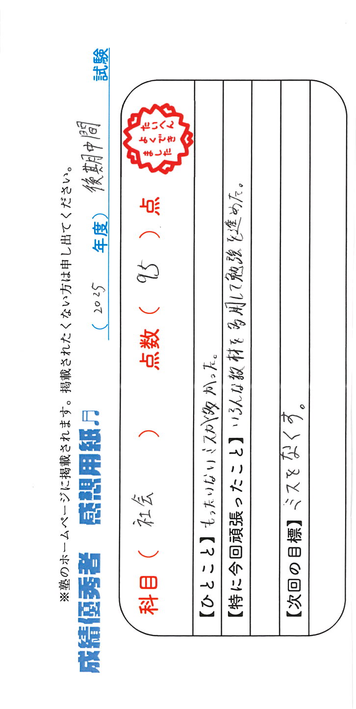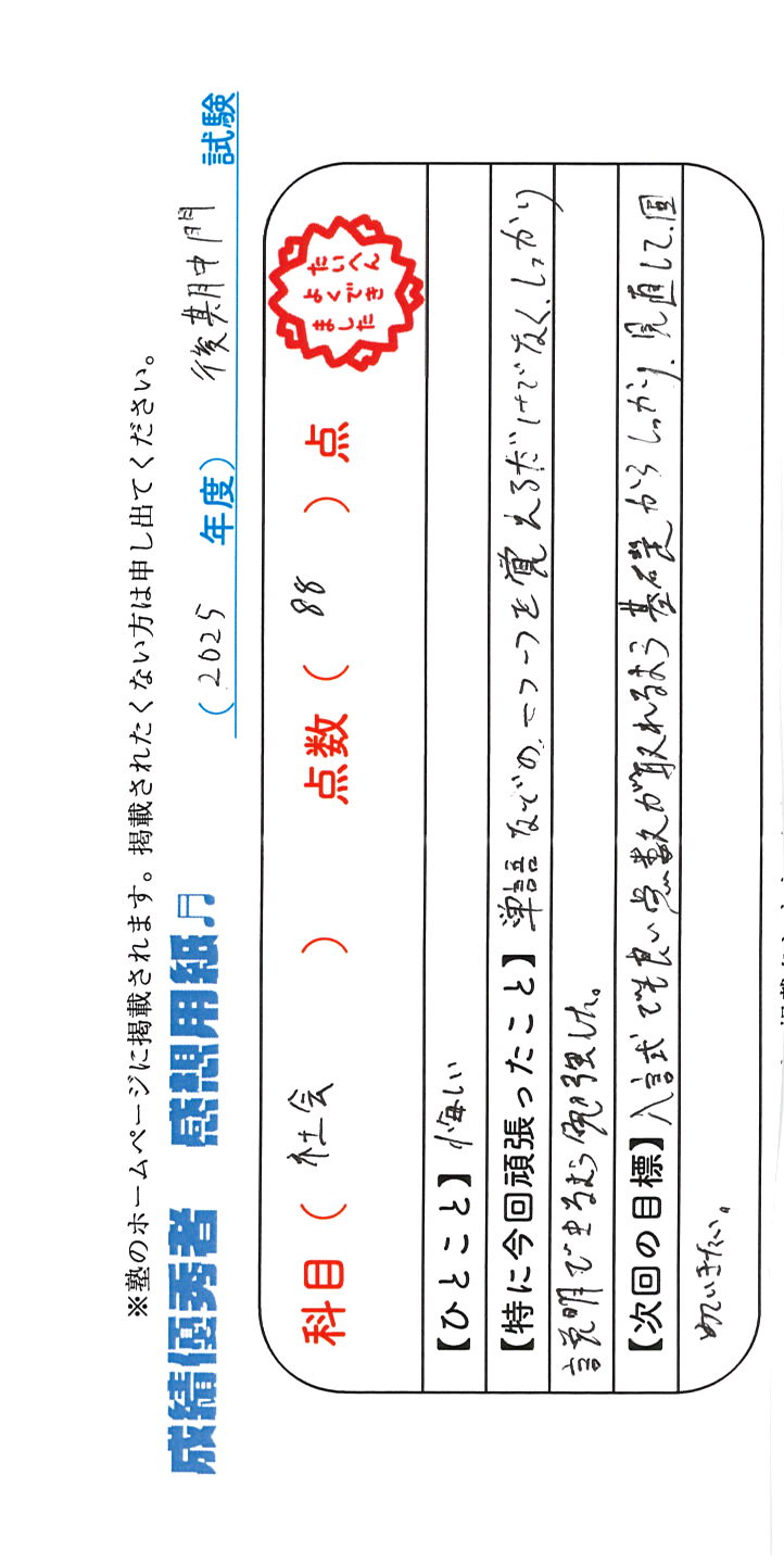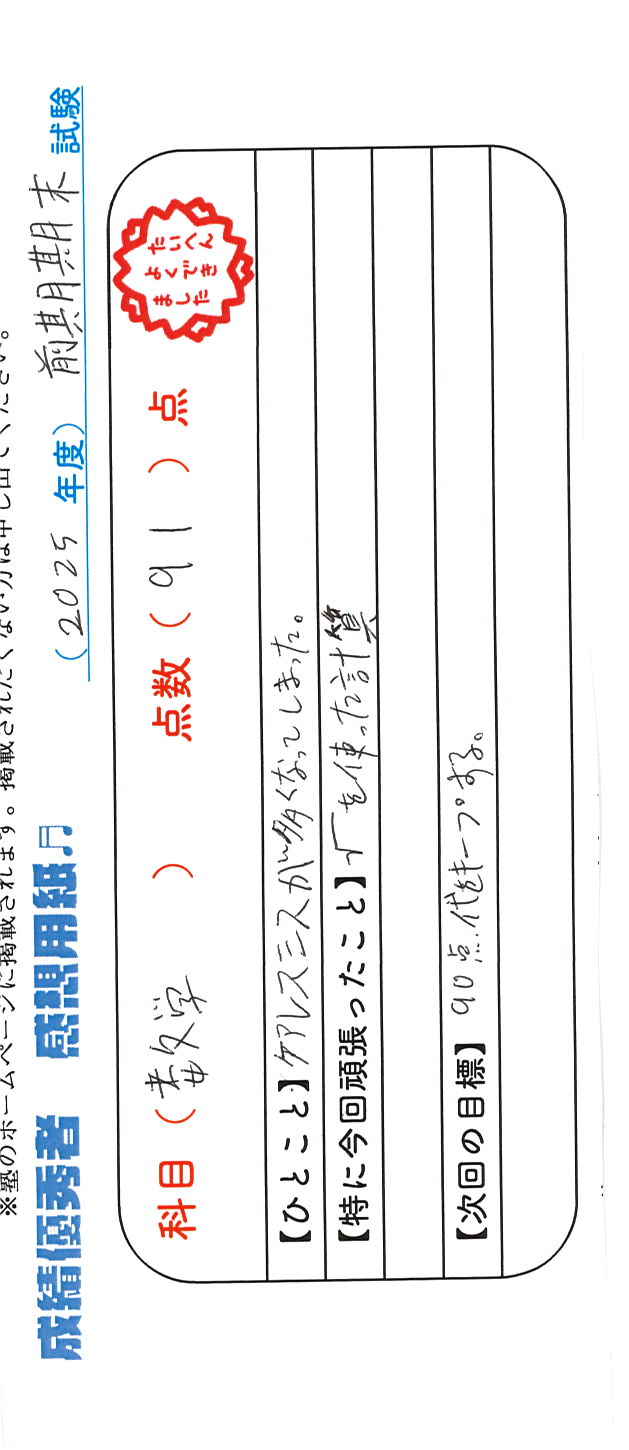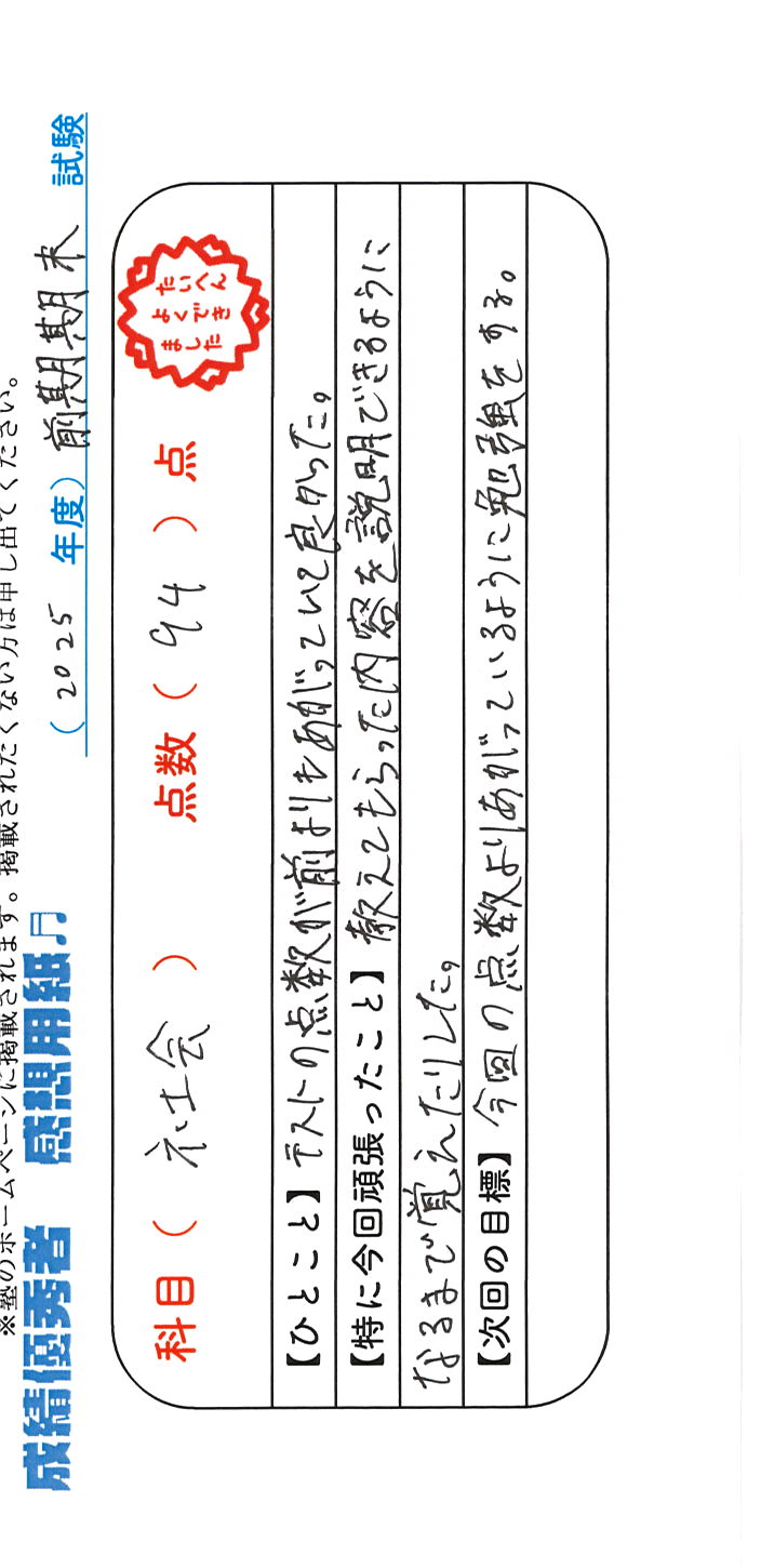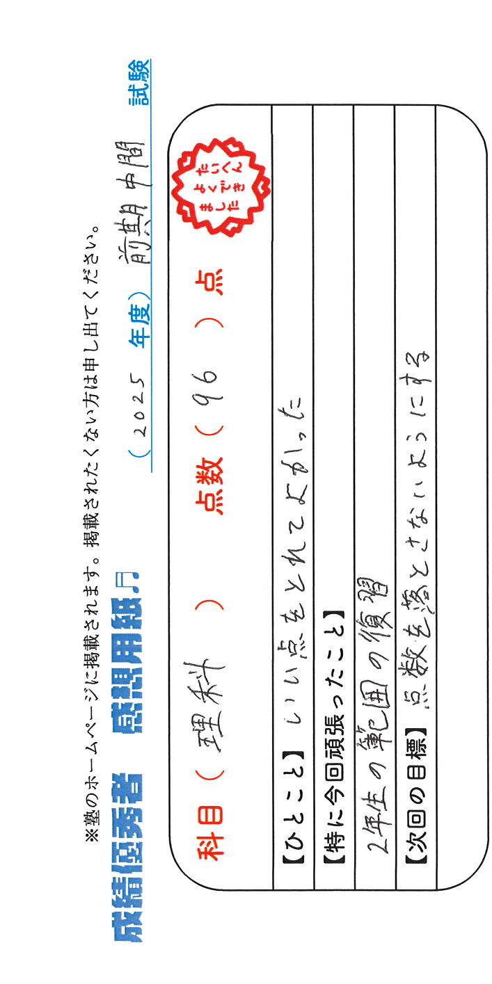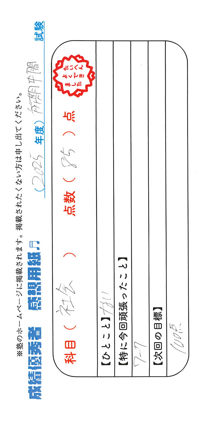 定期試験で優秀な成績を取った生徒さんのメッセージです。