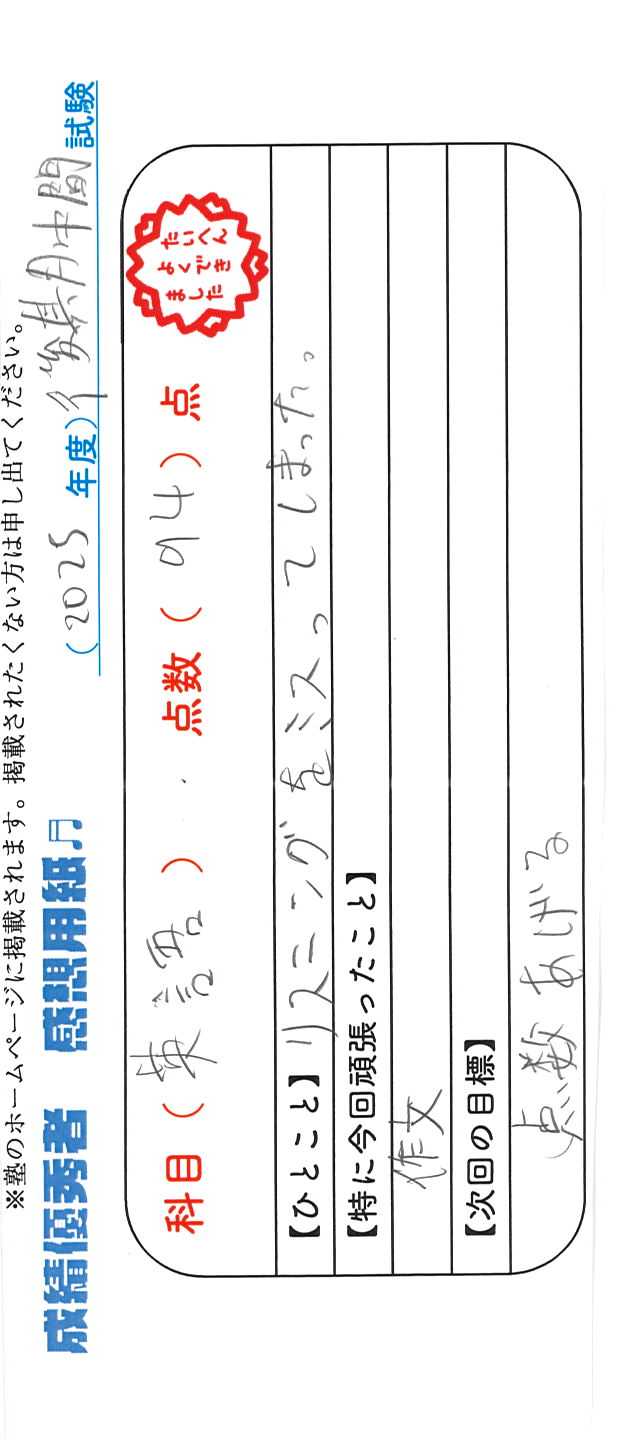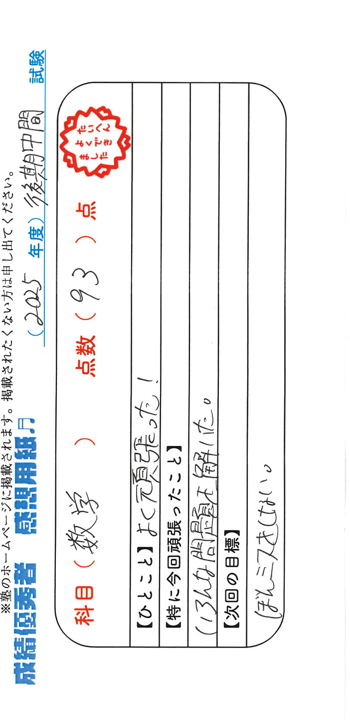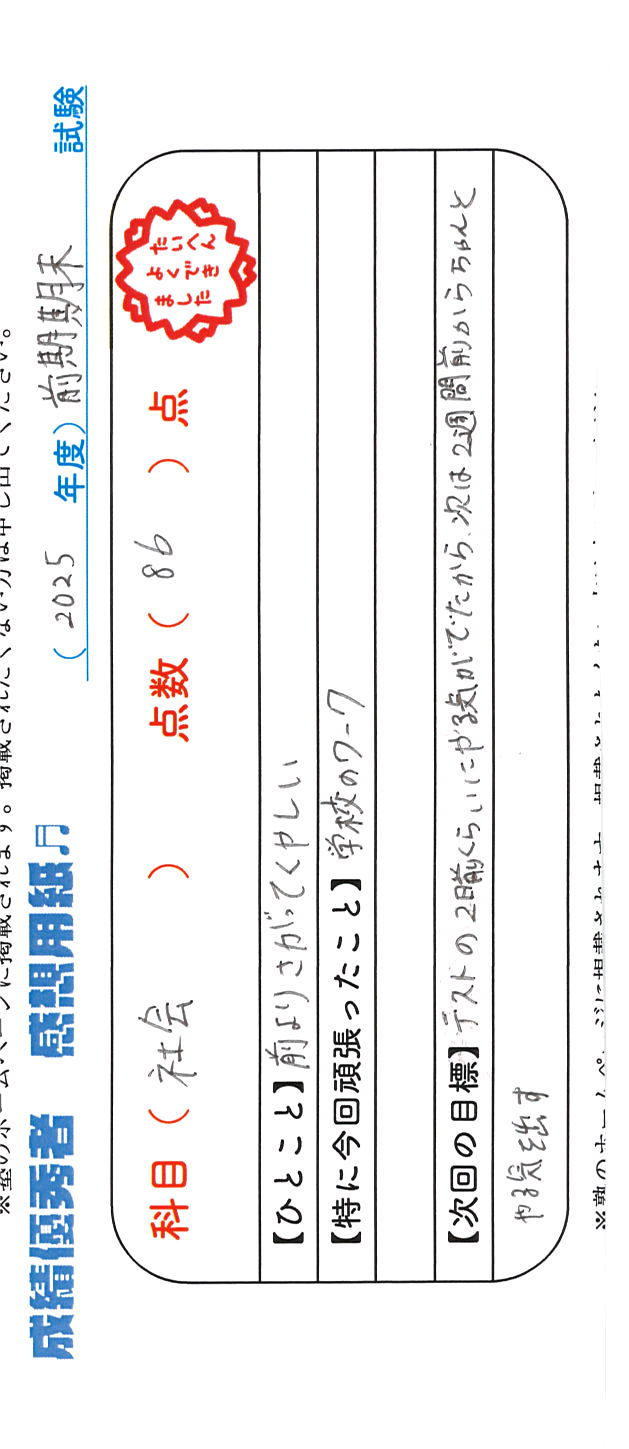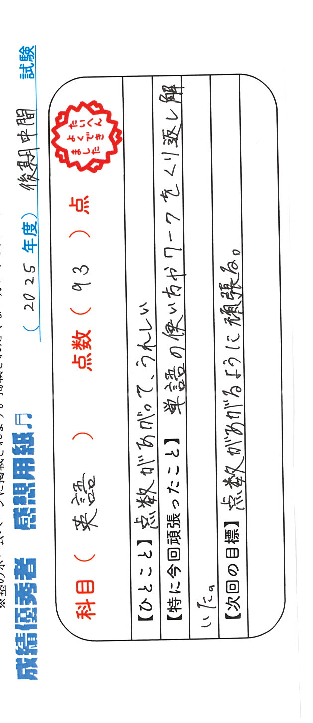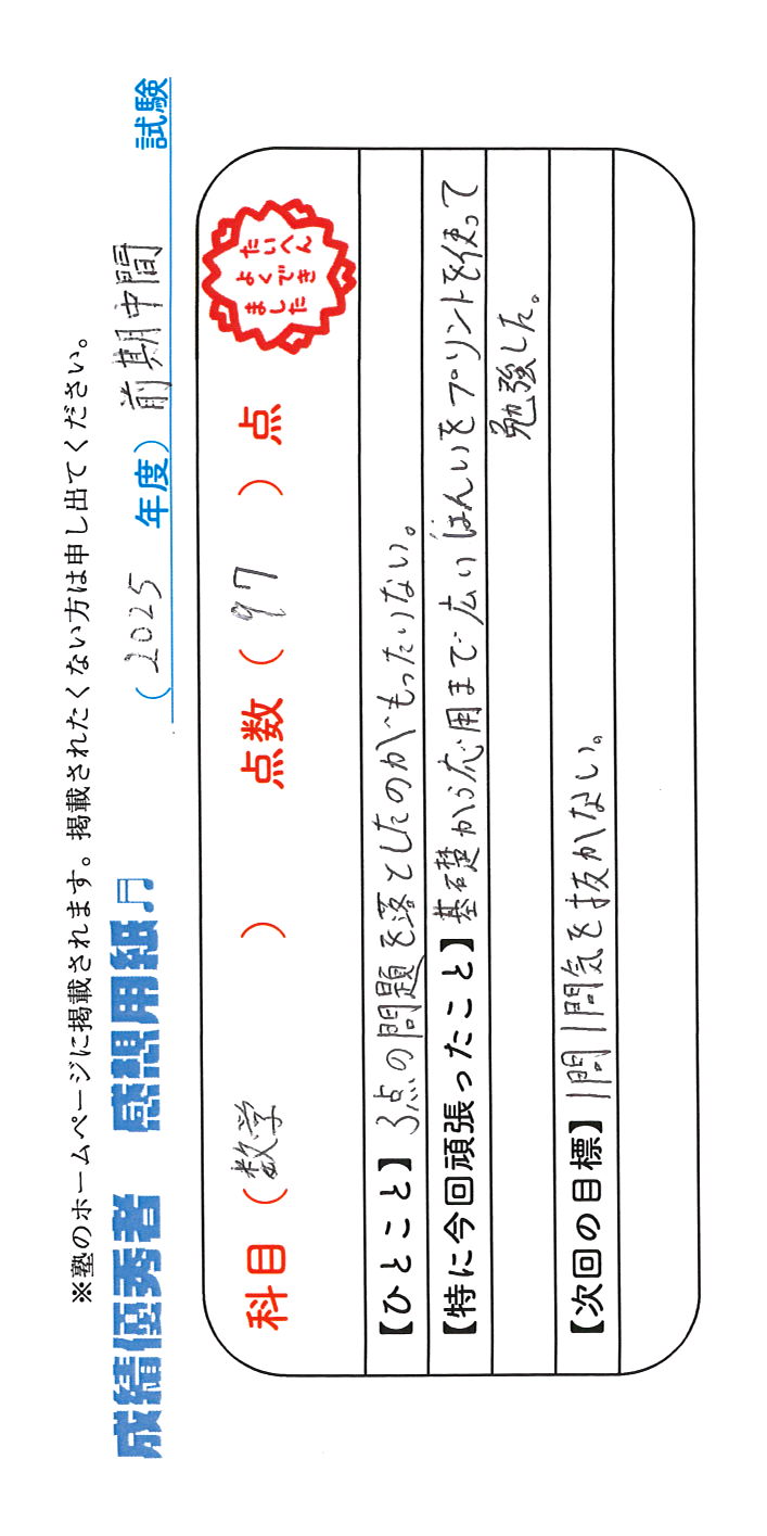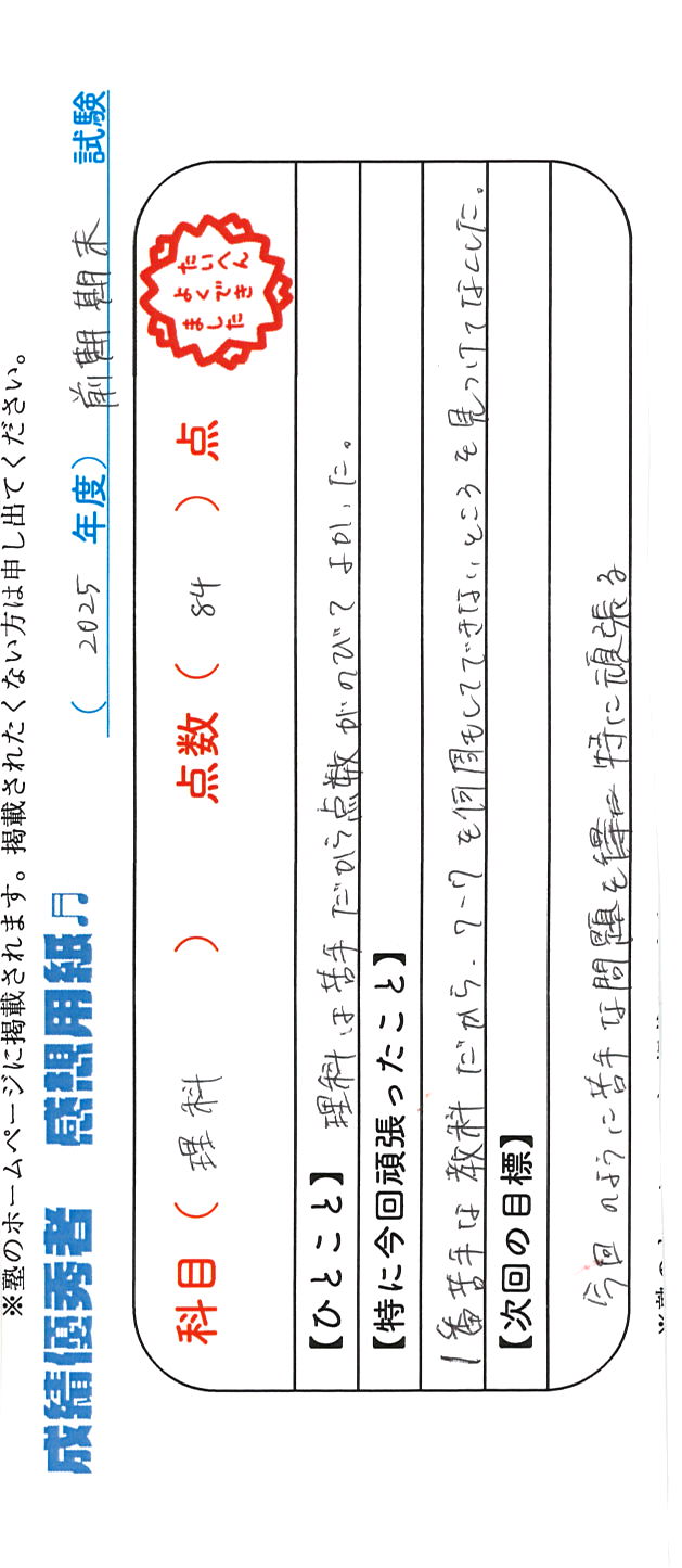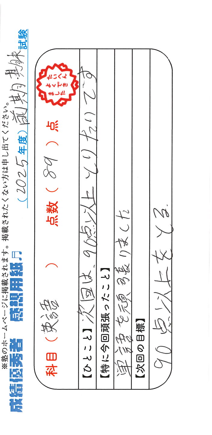 定期試験で優秀な成績を取った生徒さんのメッセージです。