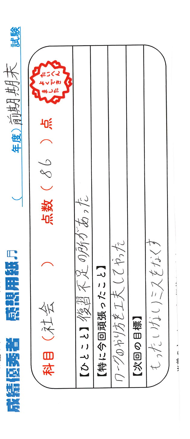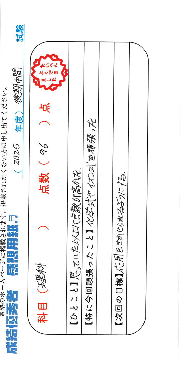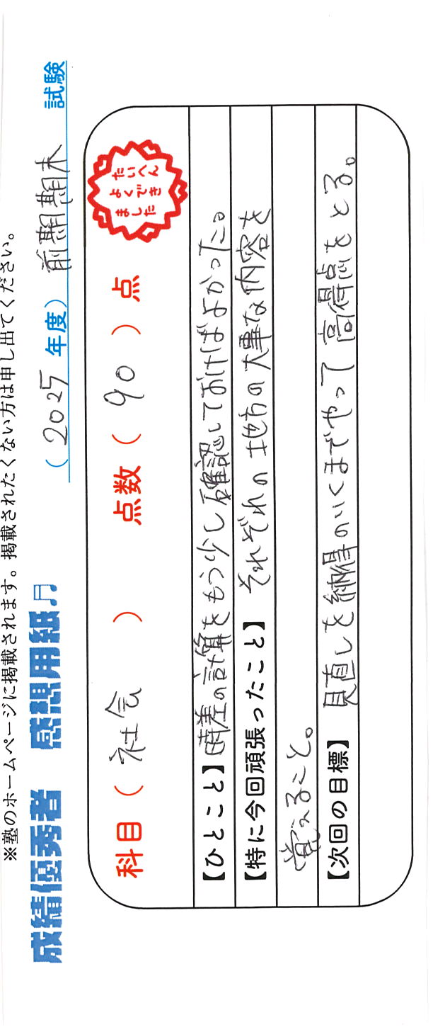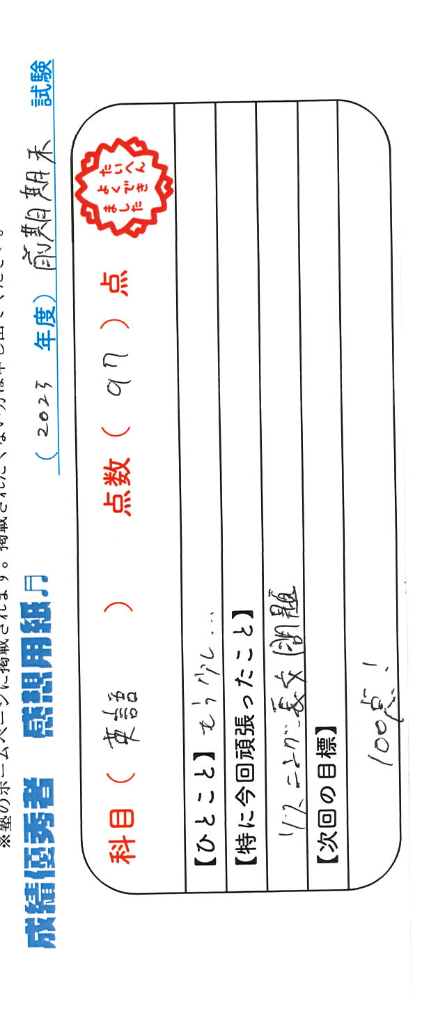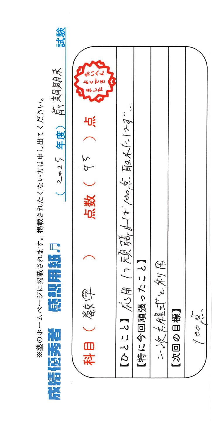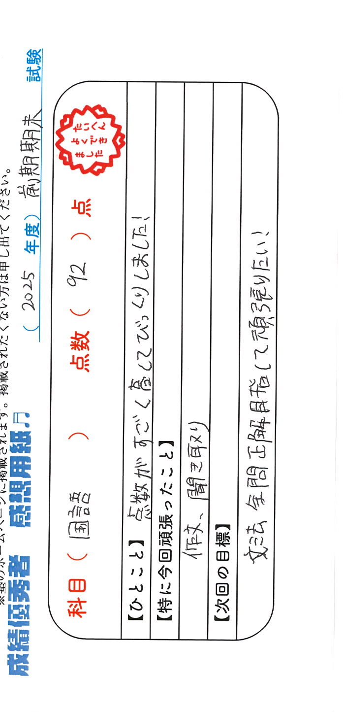 定期試験で優秀な成績を取った生徒さんのメッセージです。