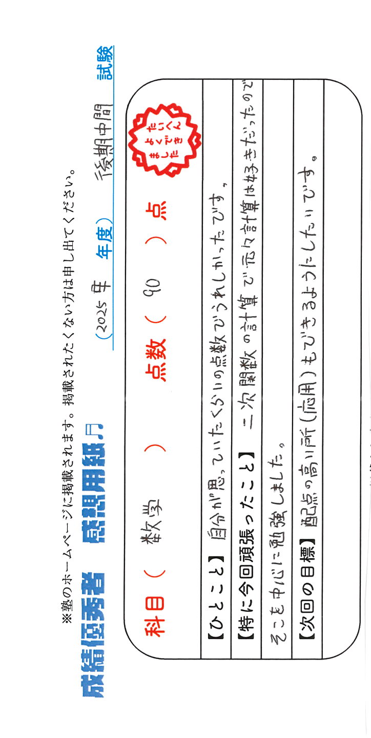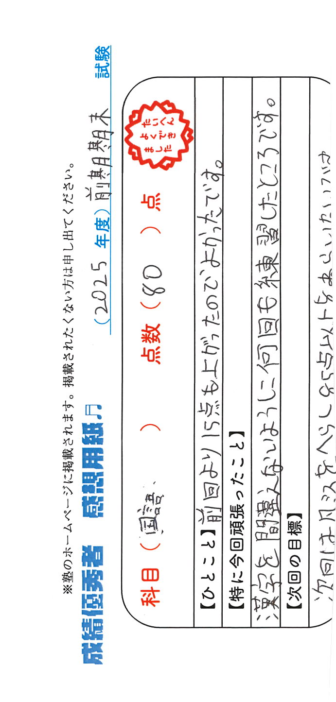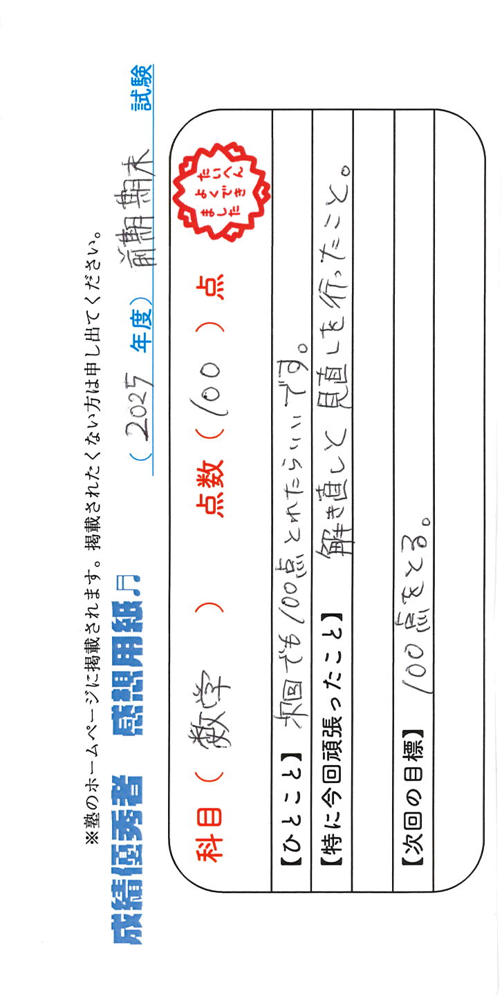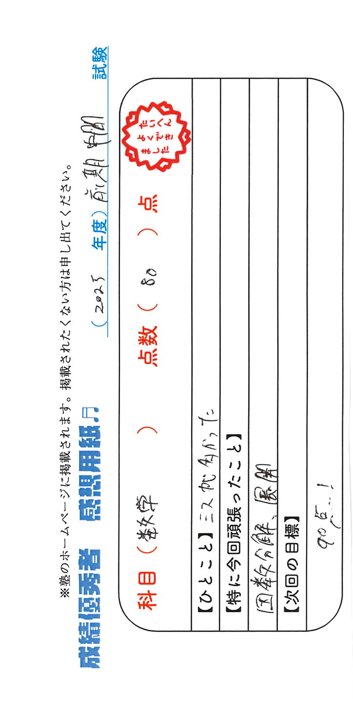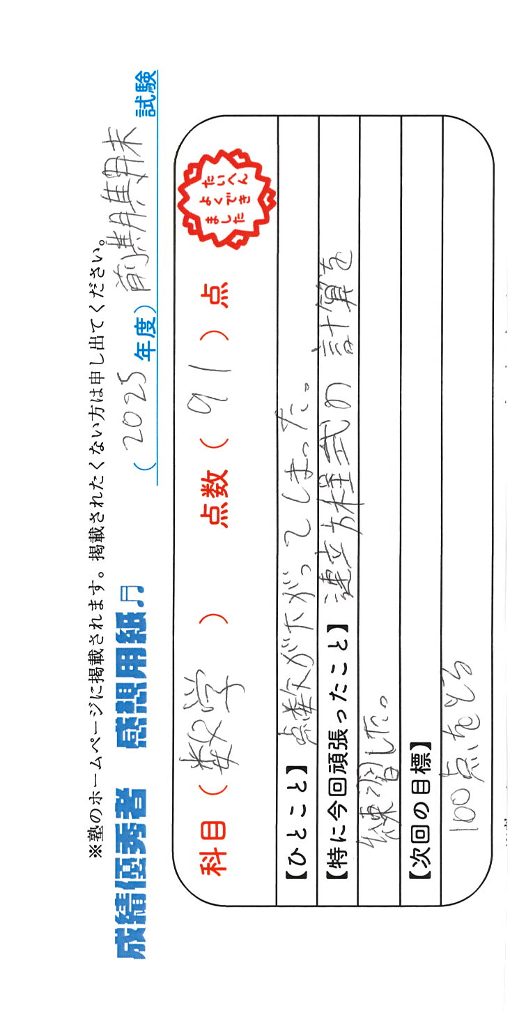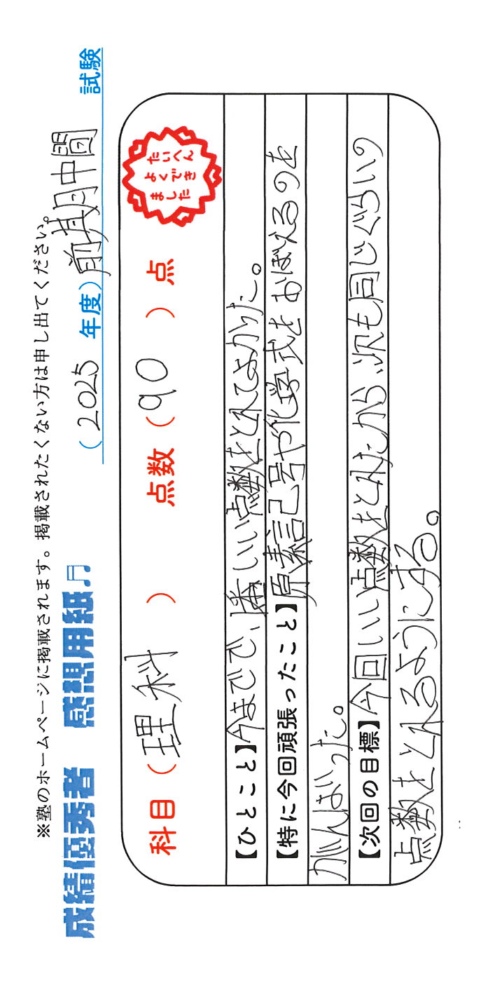 定期試験で優秀な成績を取った生徒さんのメッセージです。