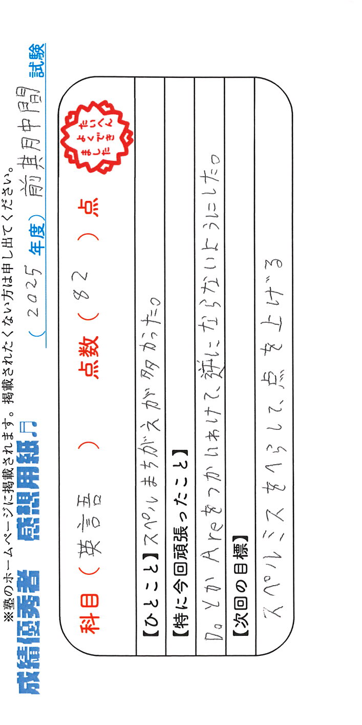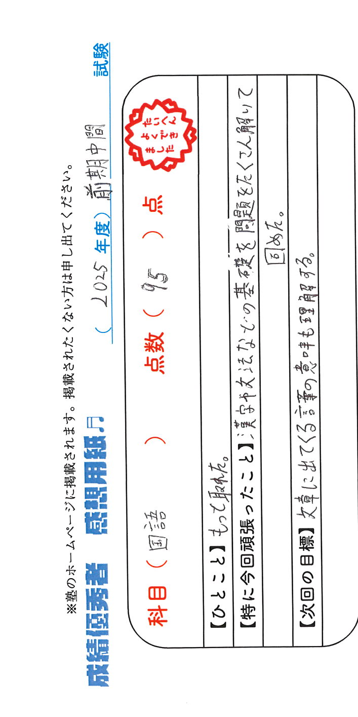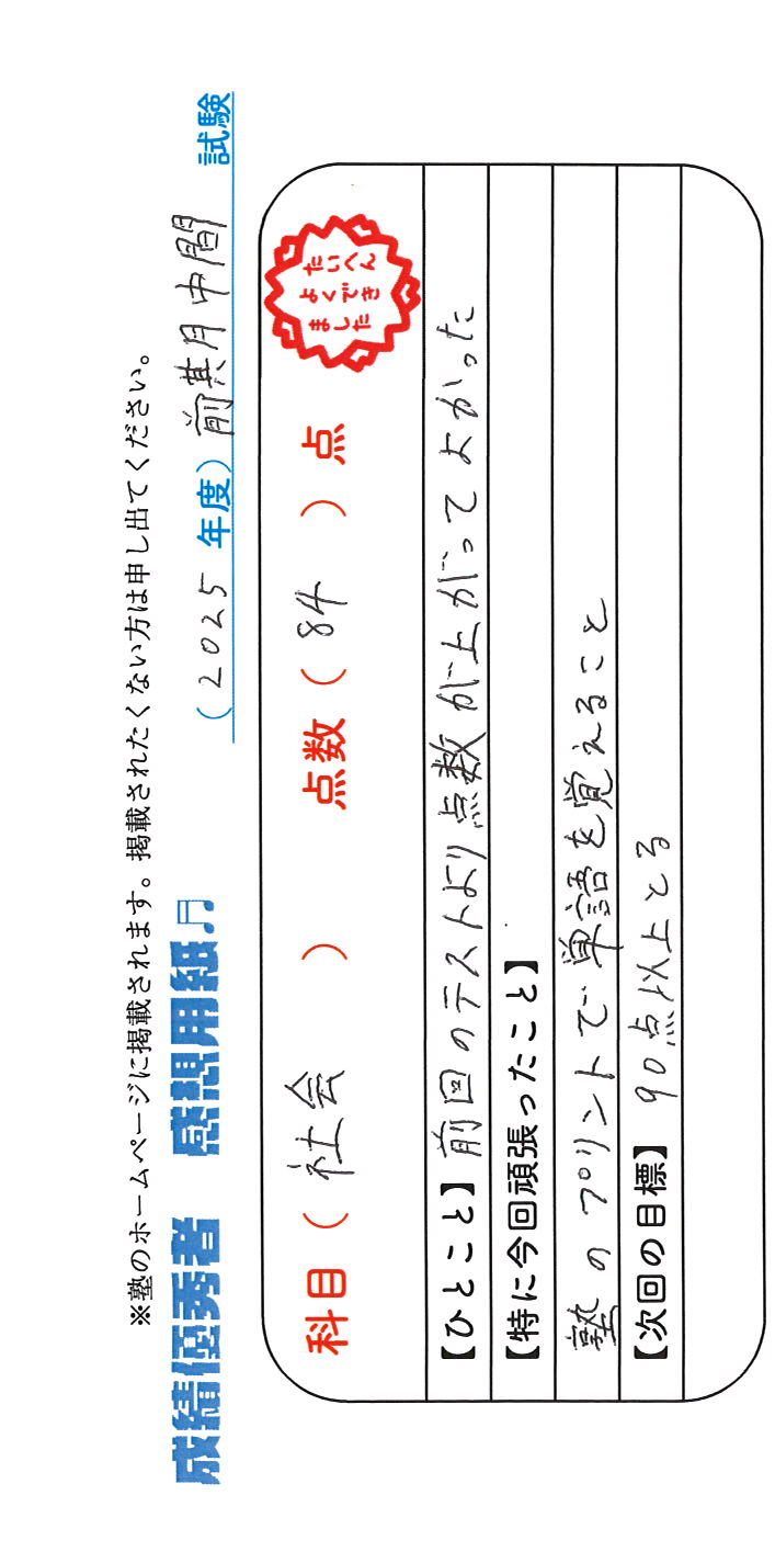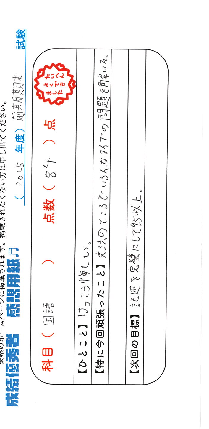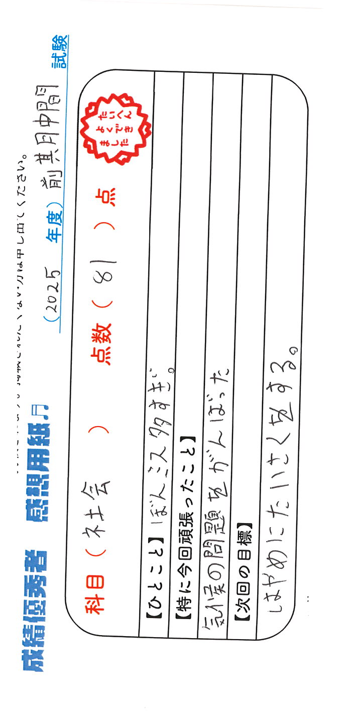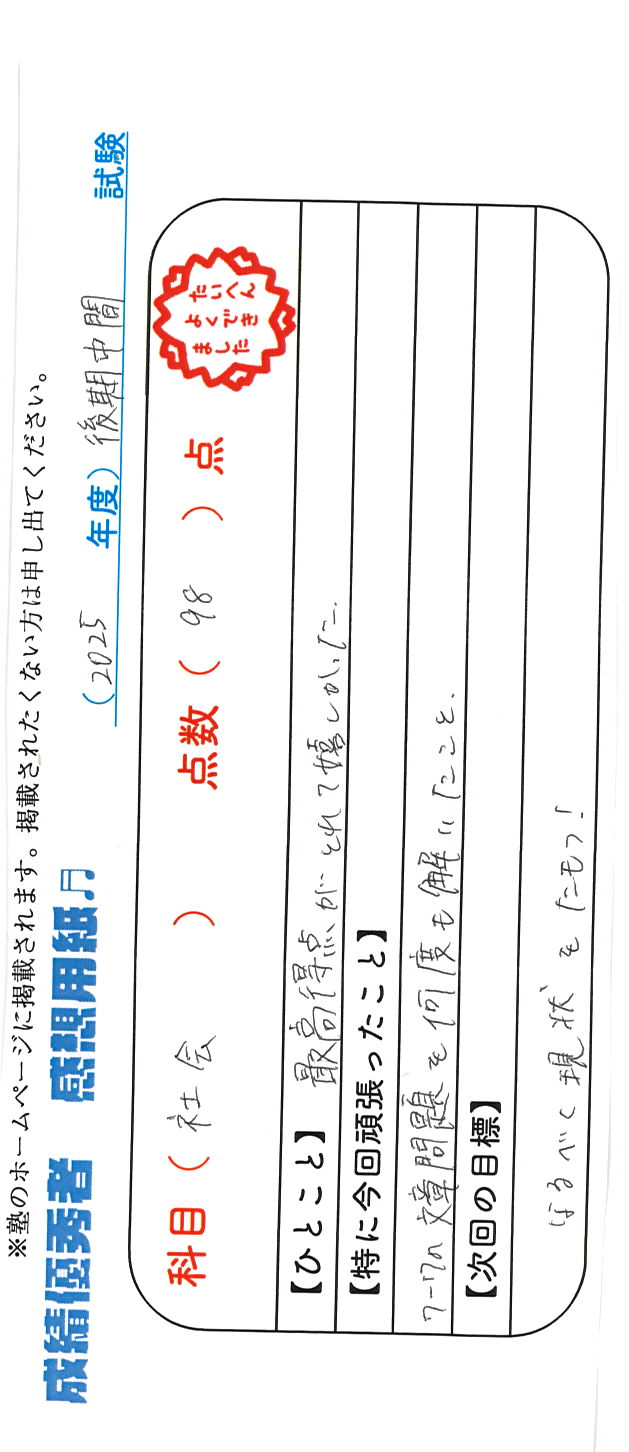 定期試験で優秀な成績を取った生徒さんのメッセージです。