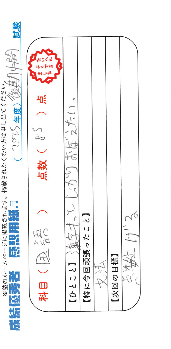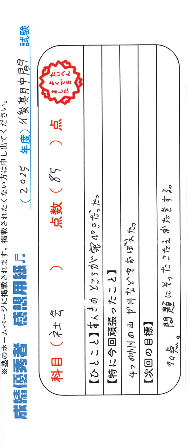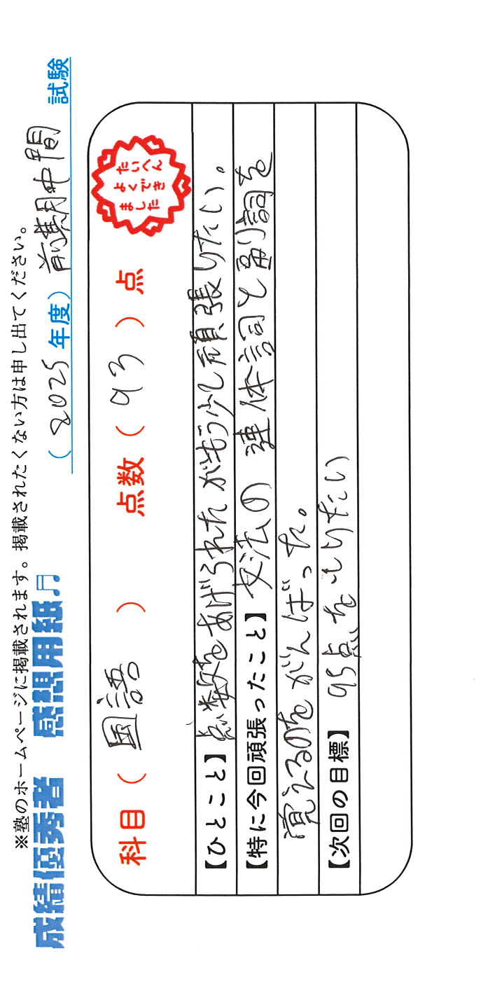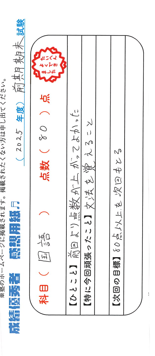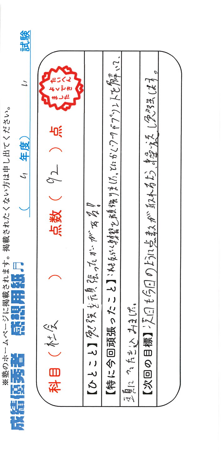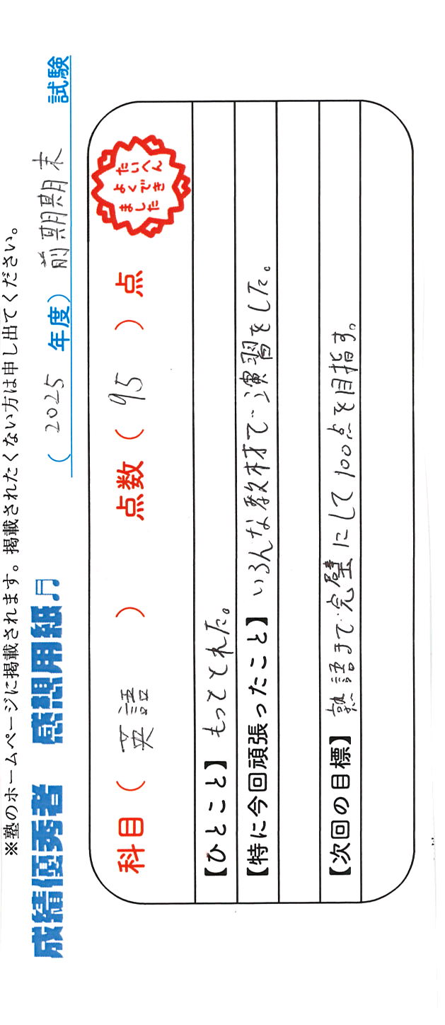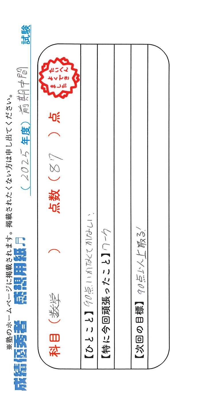定期試験で優秀な成績を取った生徒さんのメッセージです。